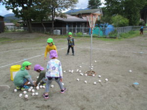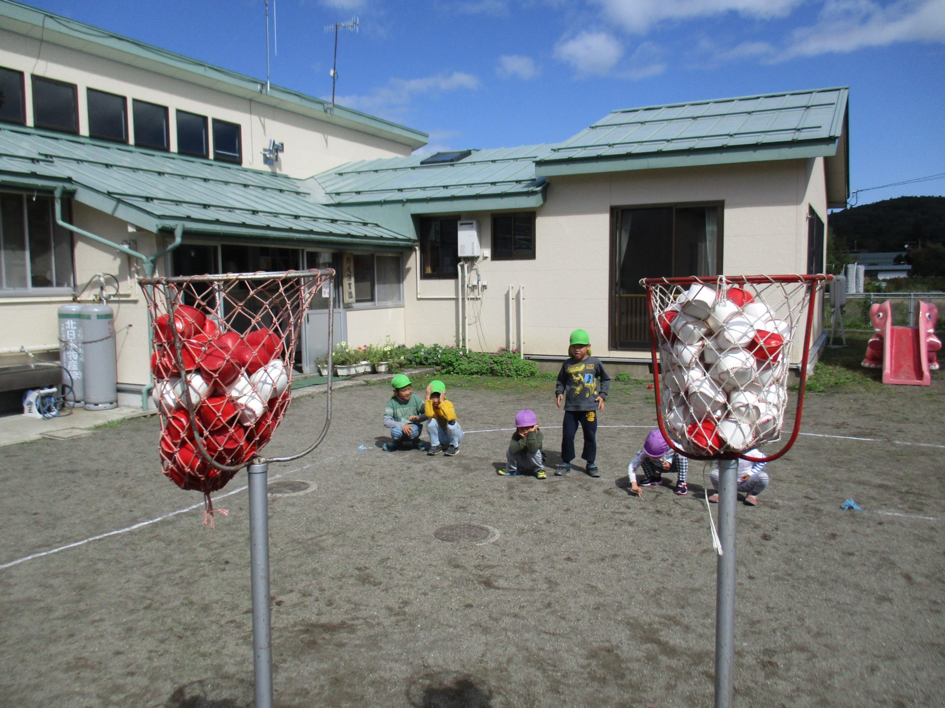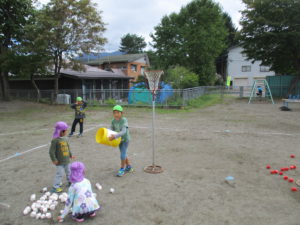 かけっこの後は玉入れをしようと話しながら、年長さんを中心に自分たちで玉を撒いています。