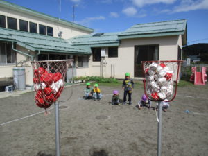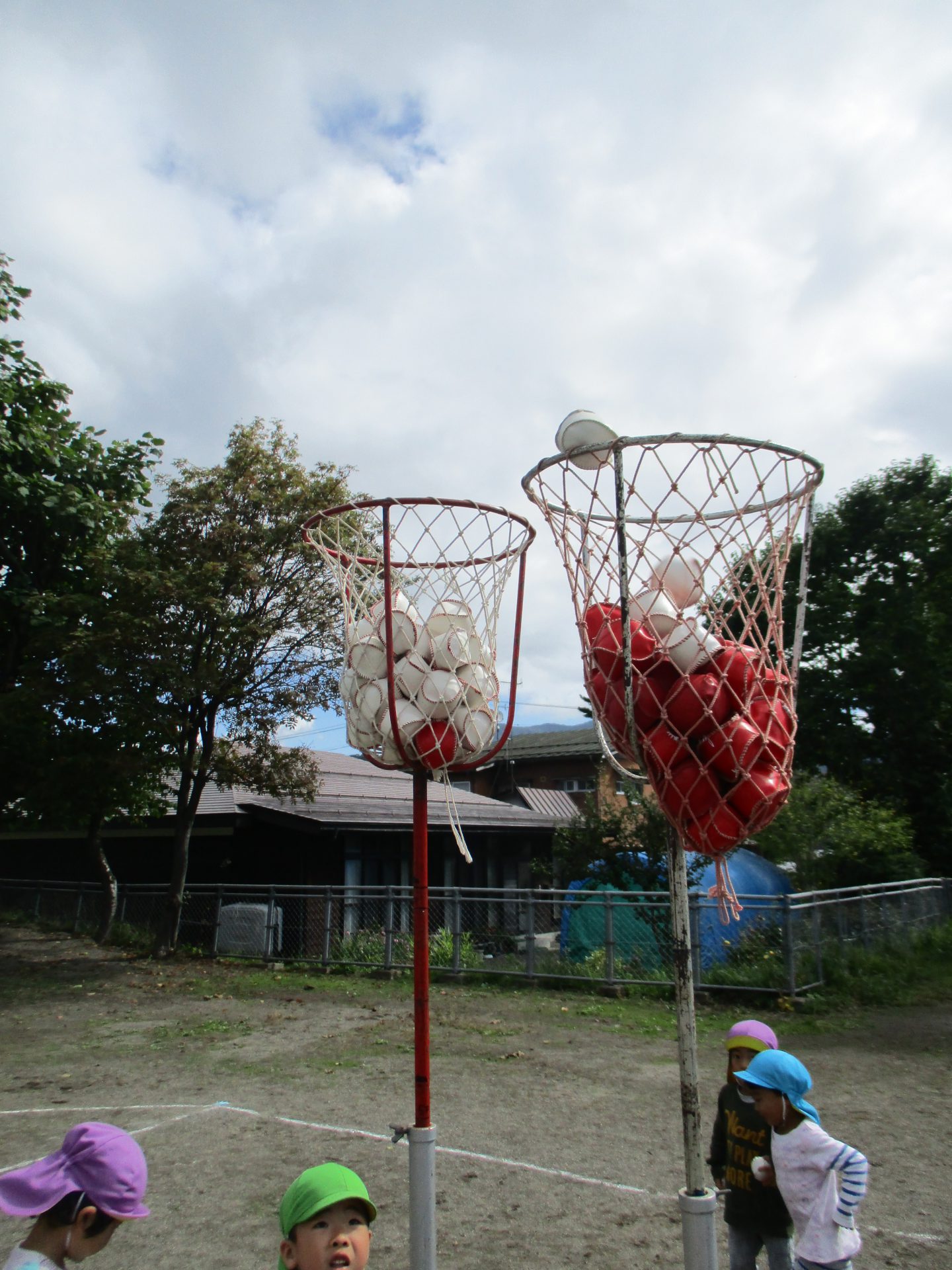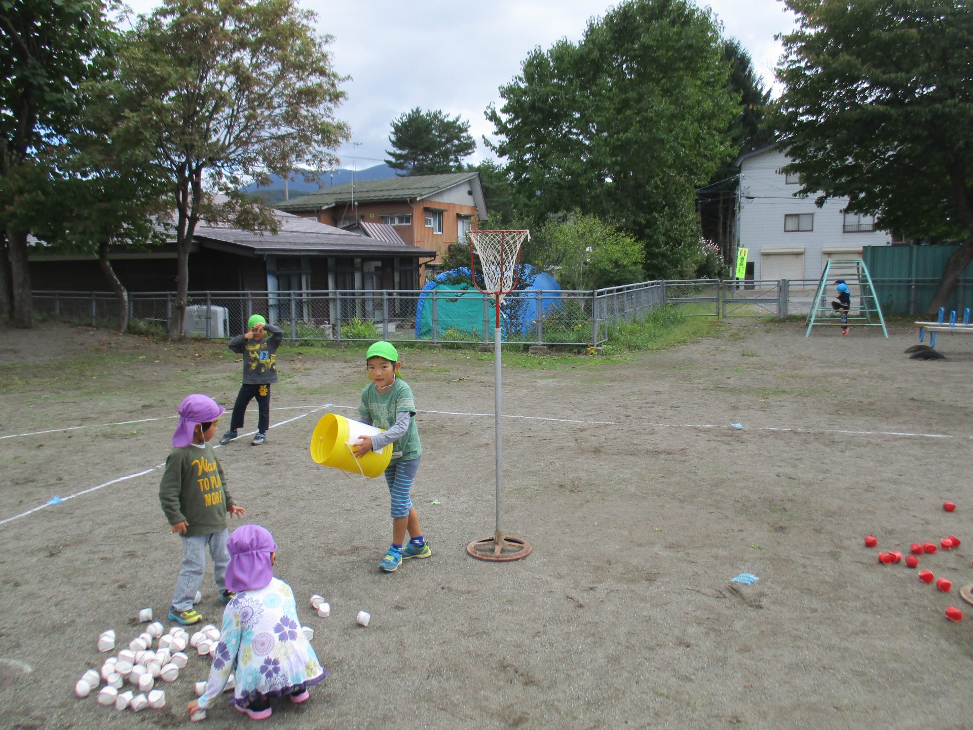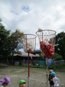 一回戦は普通に玉入れで戦い、二回戦目は運動会の日におじいちゃんおばあちゃんと行った、カゴ同士が隣合わせに近づき、オウンゴール有りの玉入れを楽しみました。