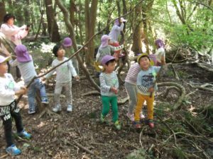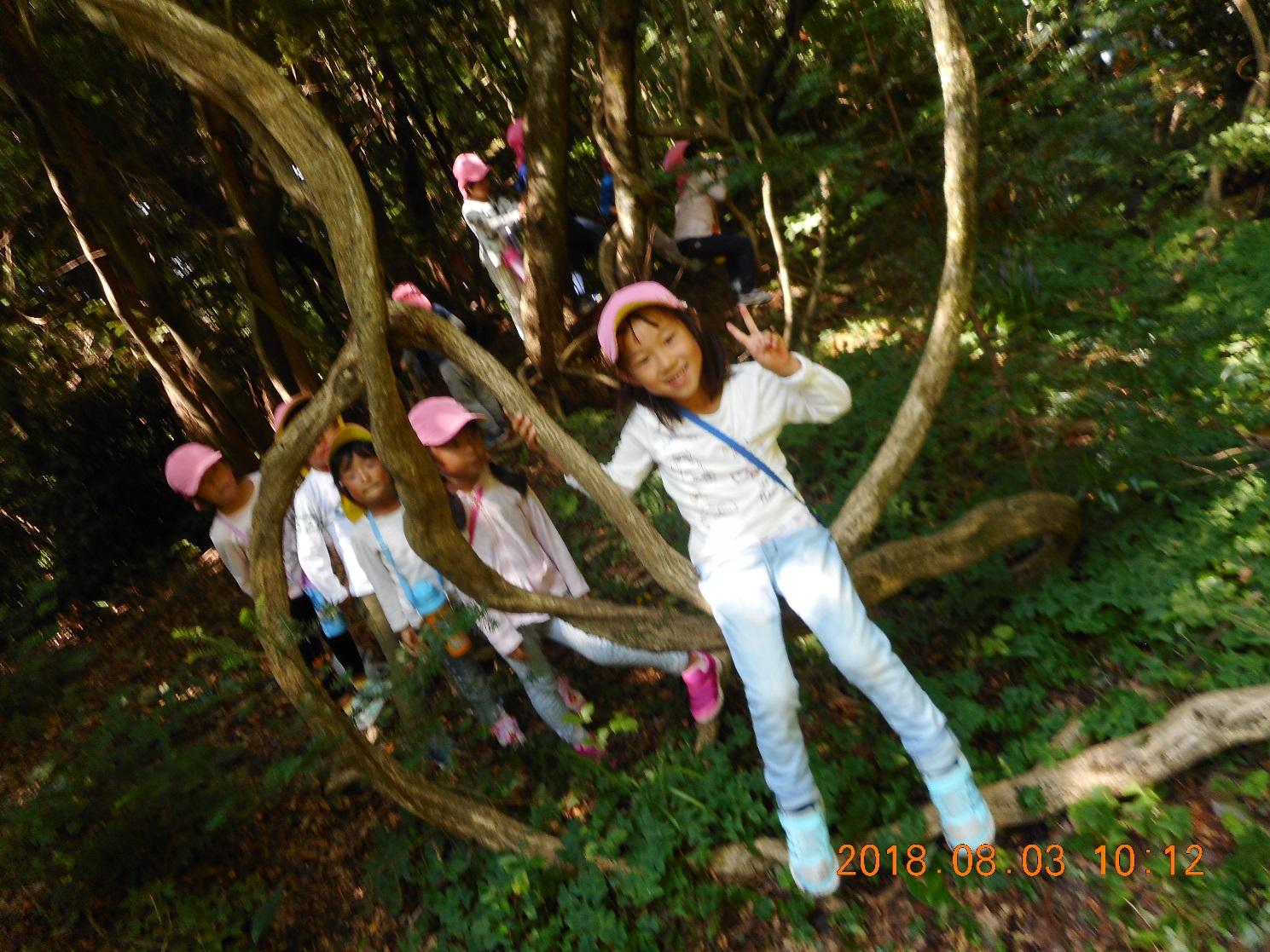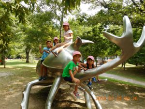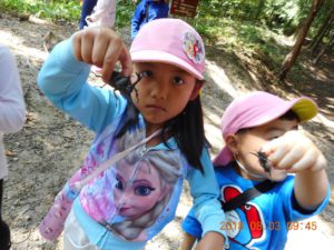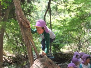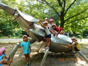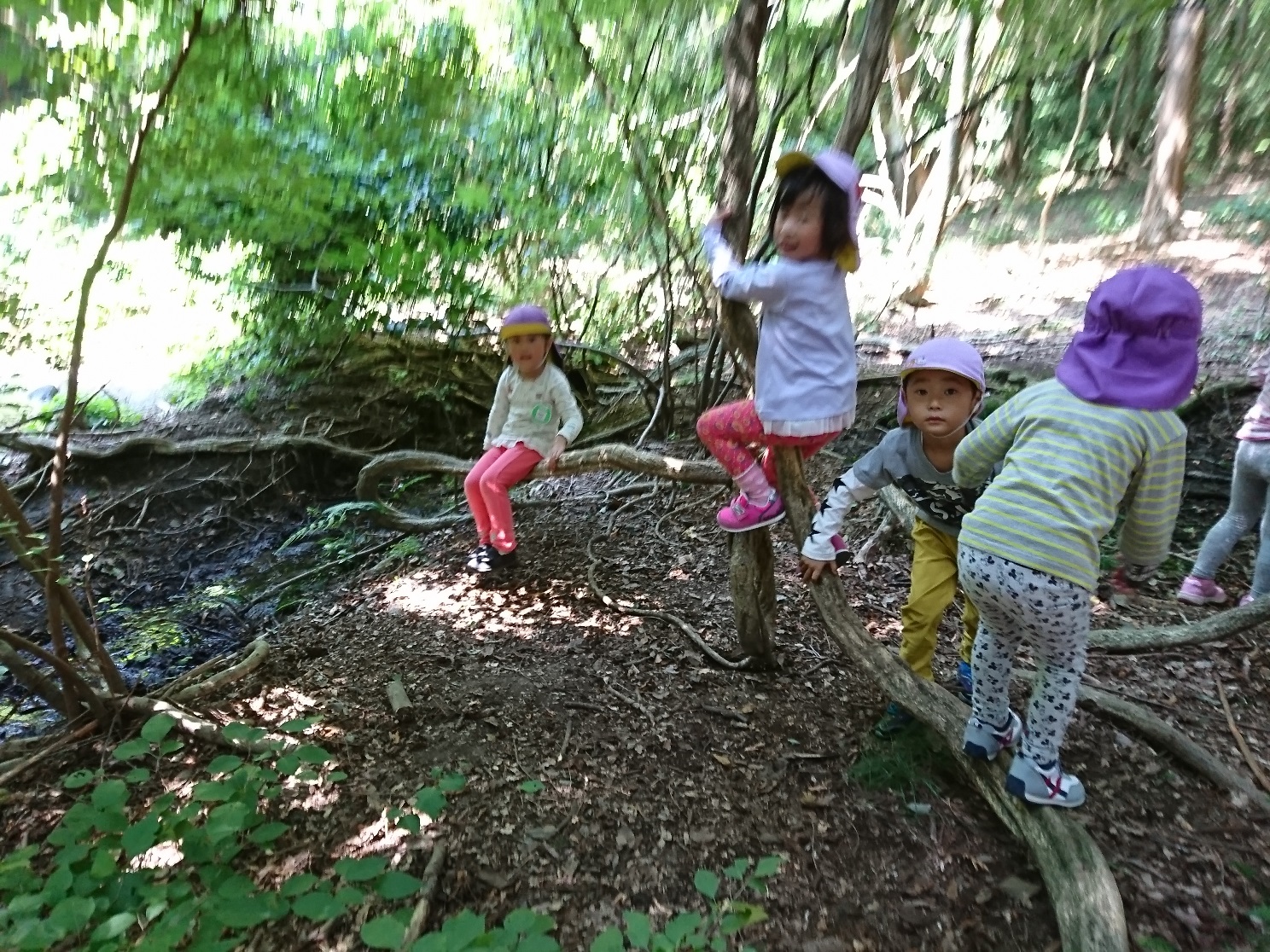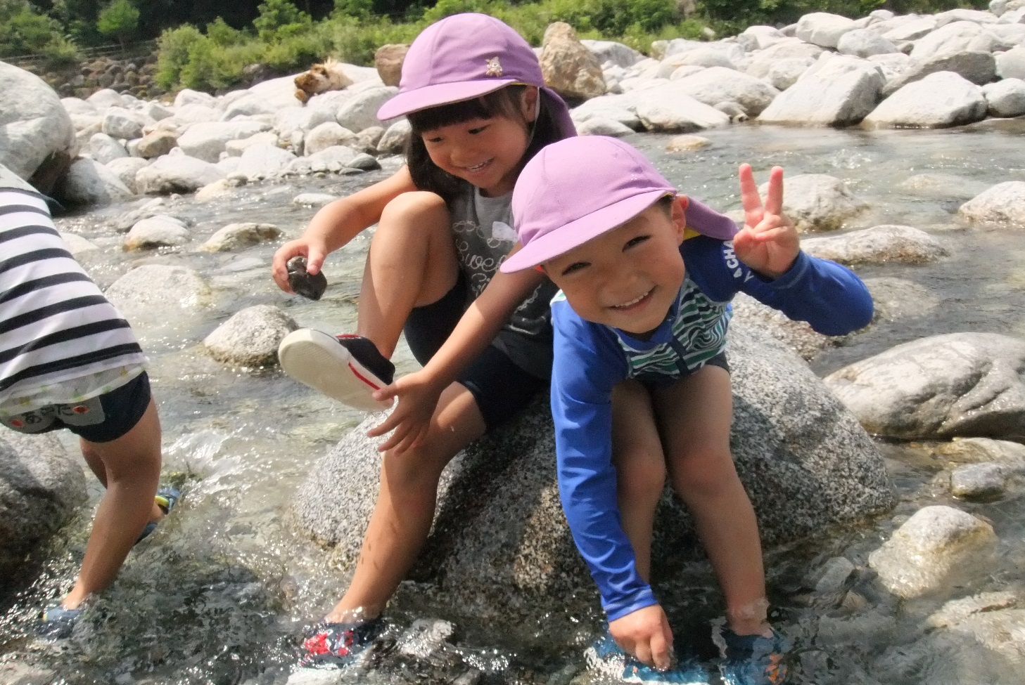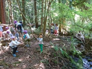 今年は猛暑になり、暑過ぎて日中は庭にも出られずプールで水遊びの日々が続きました。そんな中で下見をし、ここなら涼しい!という場所を見つけて涼しいバスに乗って戸外に出かけました。高原や森の中は28℃で安定していて、やぶ蚊対策で長袖、長ズボンで行きましたが、たくさん歩き回り、川ではサンショウウオやおたまじゃくしを見つけ、森の中ではカブトムシを捕まえたりして自然の中で遊ぶことができました。保育士も地元の自然の豊かさを改めて感じ、子どもたちにも感じてもらえる経験だったと思います。