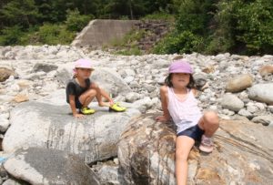 川原でも遊べます。「つめたくてきもちいいね。」「大きな石、濡れると黒くなるよ。」「こっちの石はちゃいろだよ」「すべらないね」