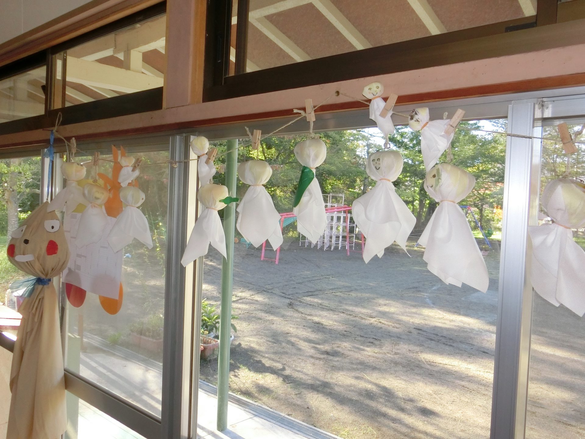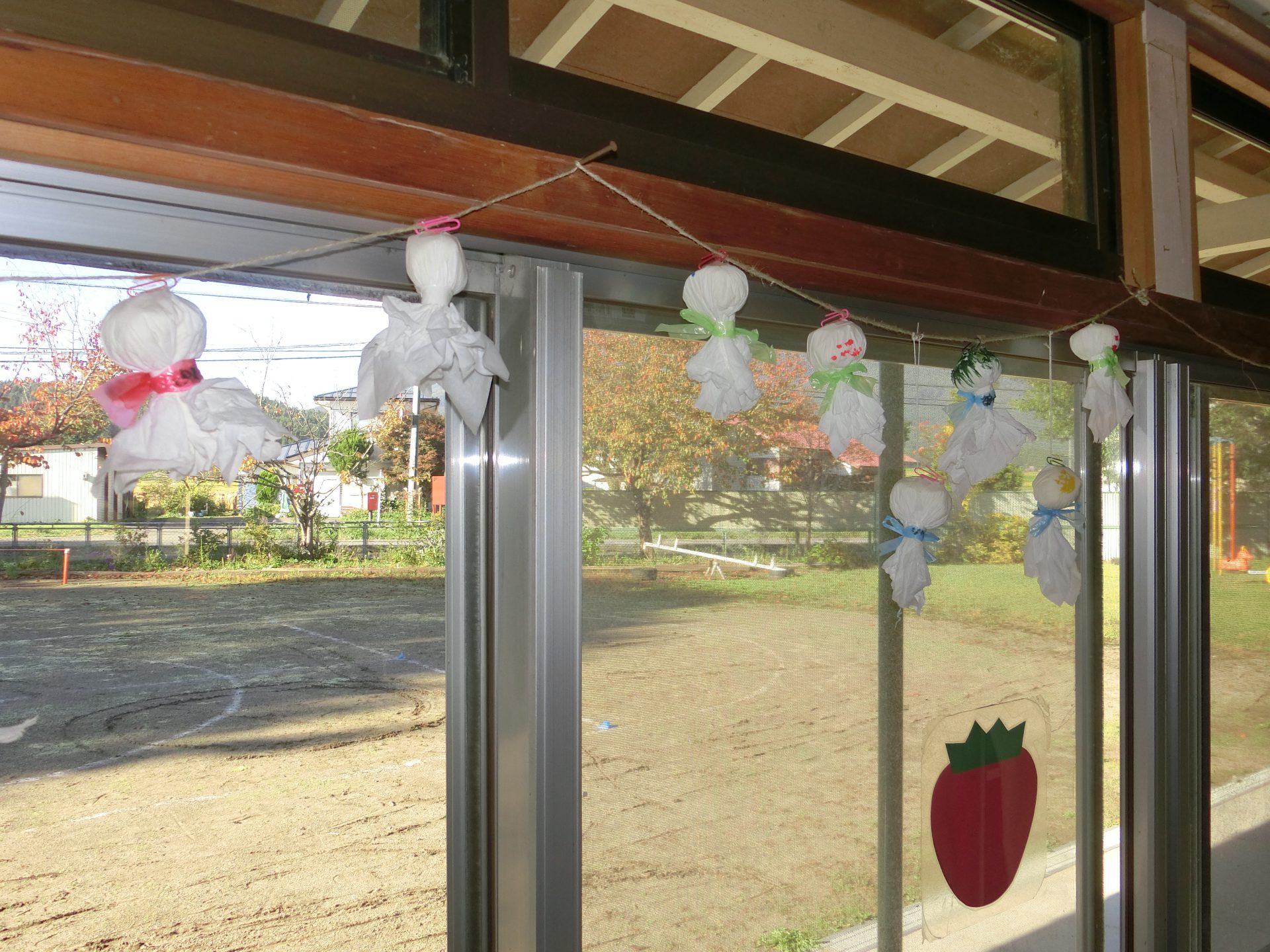 運動会前に作ってあったので、今回はミニミニてるてるぼうずにしてみました。奥にある肌色の大きいてるてるぼうずは春の遠足の時の共同作品です。雨が降ってほしくないときには、子ども達から声が上がり、窓辺に移動します。