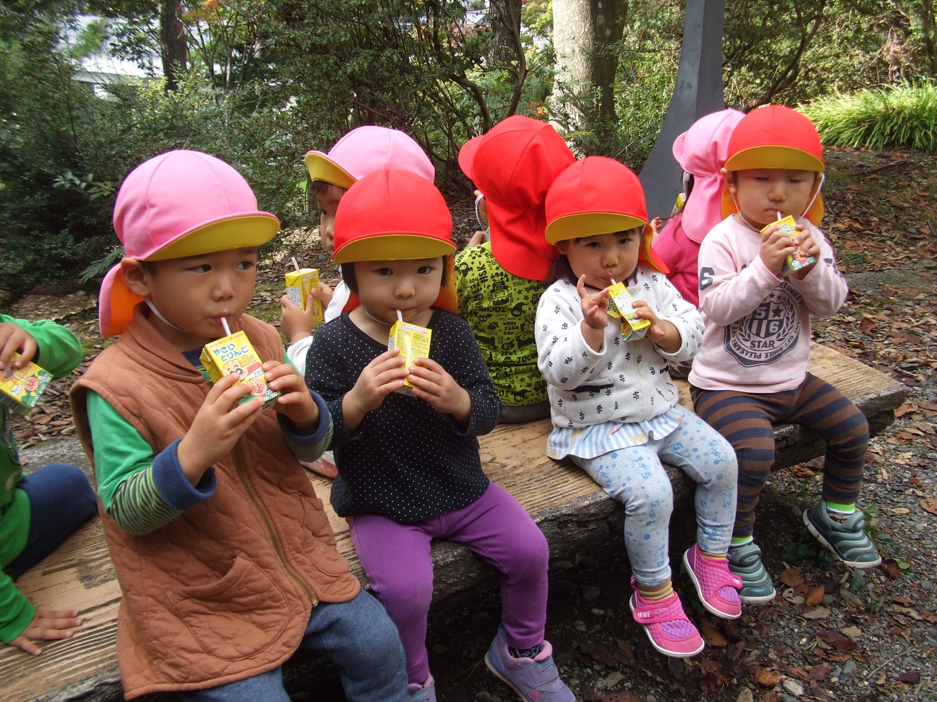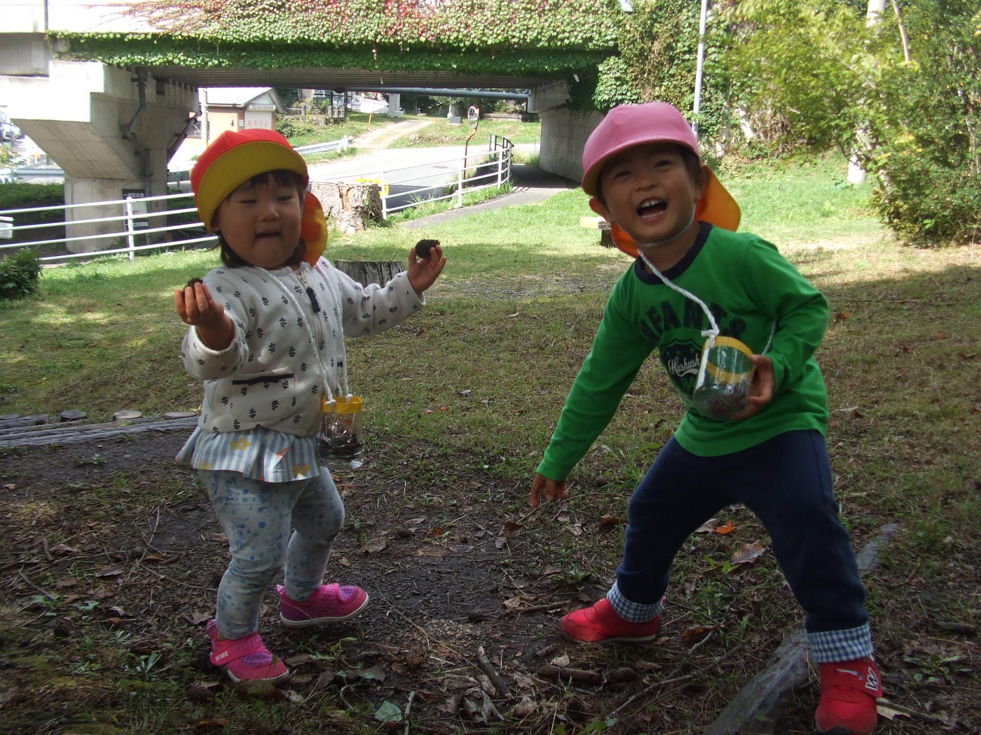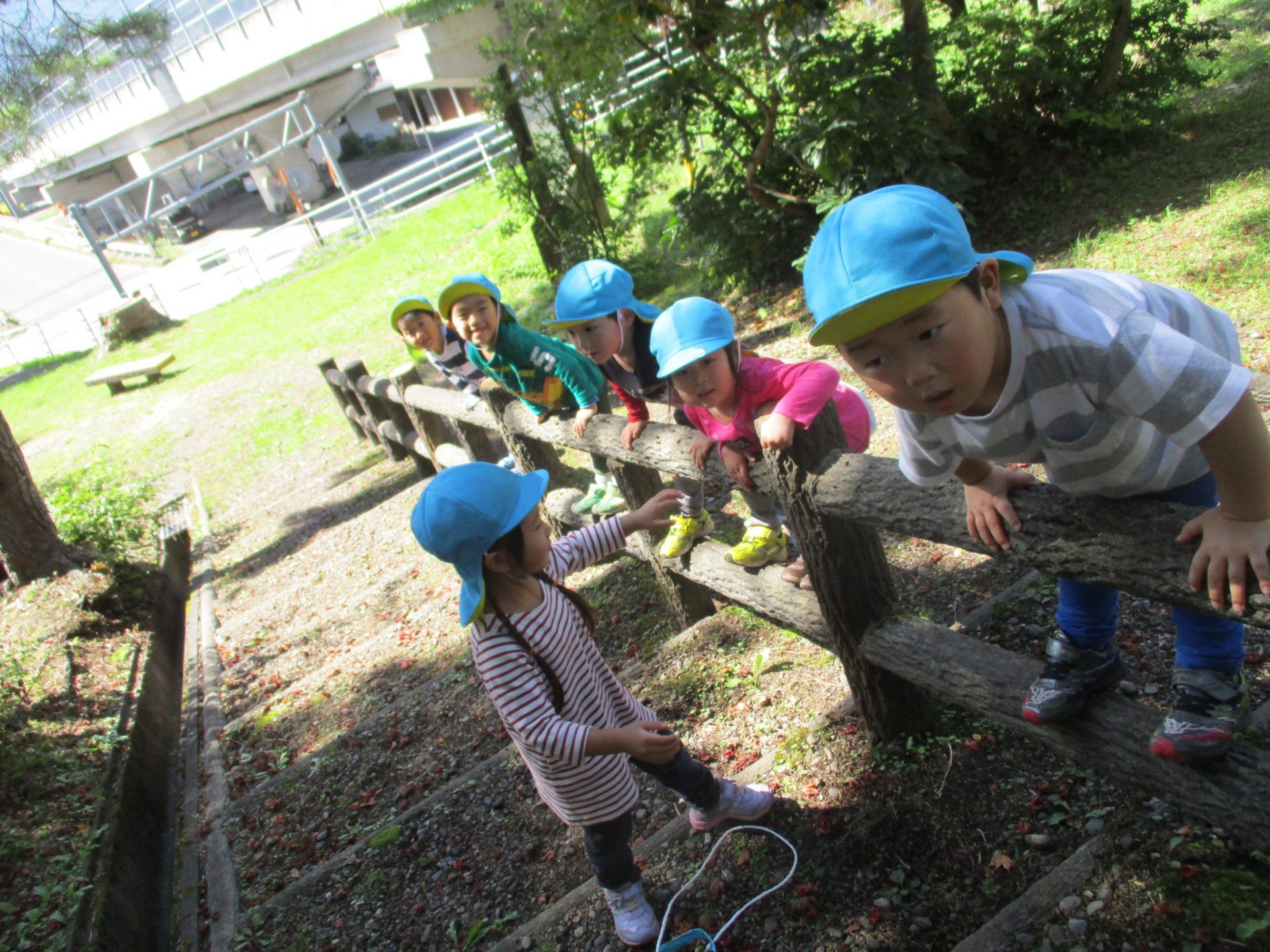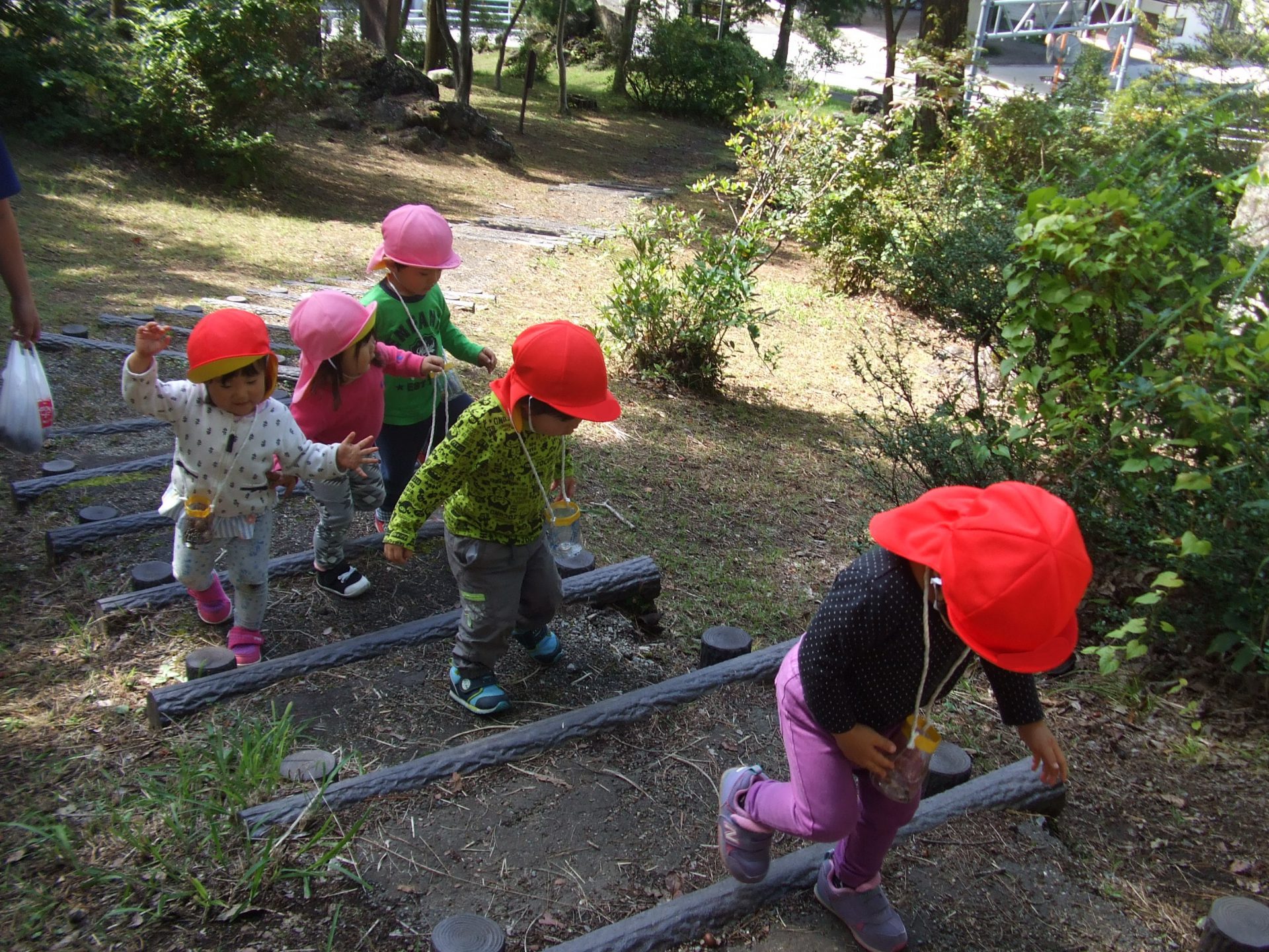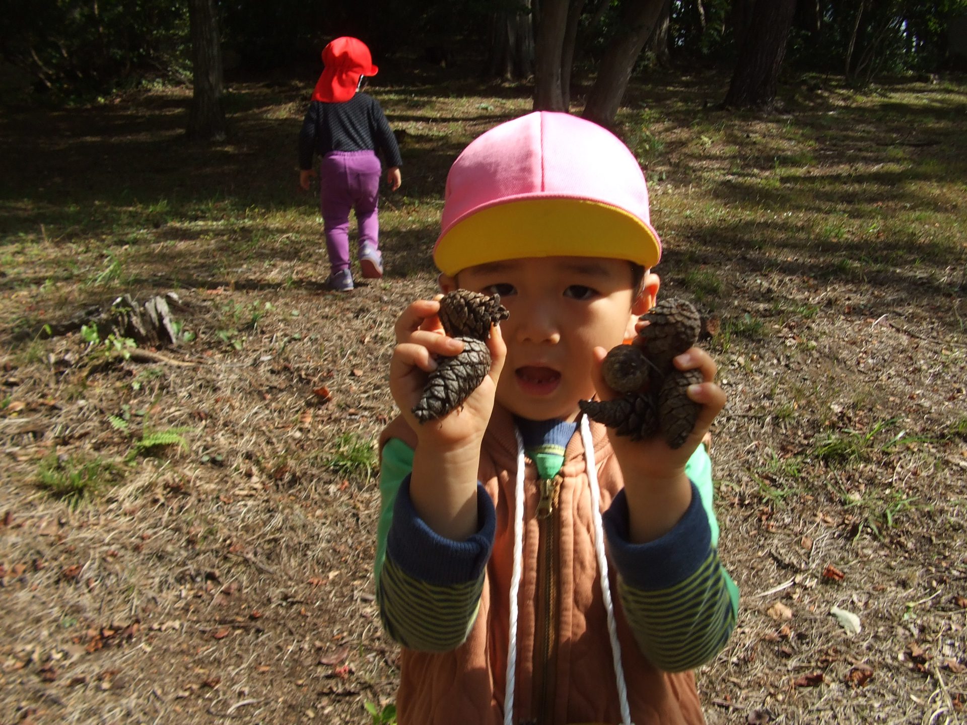ここ何年か続けて秋の遠足は小丸山公園へ行っていますが、魅力がいっぱいです。天気も良く山もきれいに見えていて山の名前当てクイズをしましたが、富士里からの眺めと違うので間違えてしまう子もいました。「なんか違う形に見えるね。」そこに気付くことができたのも大発見でした。運動会を終え、ひとまわり大きく成長した子ども達。友達と協力して作り上げる喜びを知り、一緒に遊ぶ中での会話も、友達のよさに気付いて素直に認めようとしているのを感じます。実り多い秋の自然を介して友達との関わりがもっと深まるような活動をしていきたいと思います。