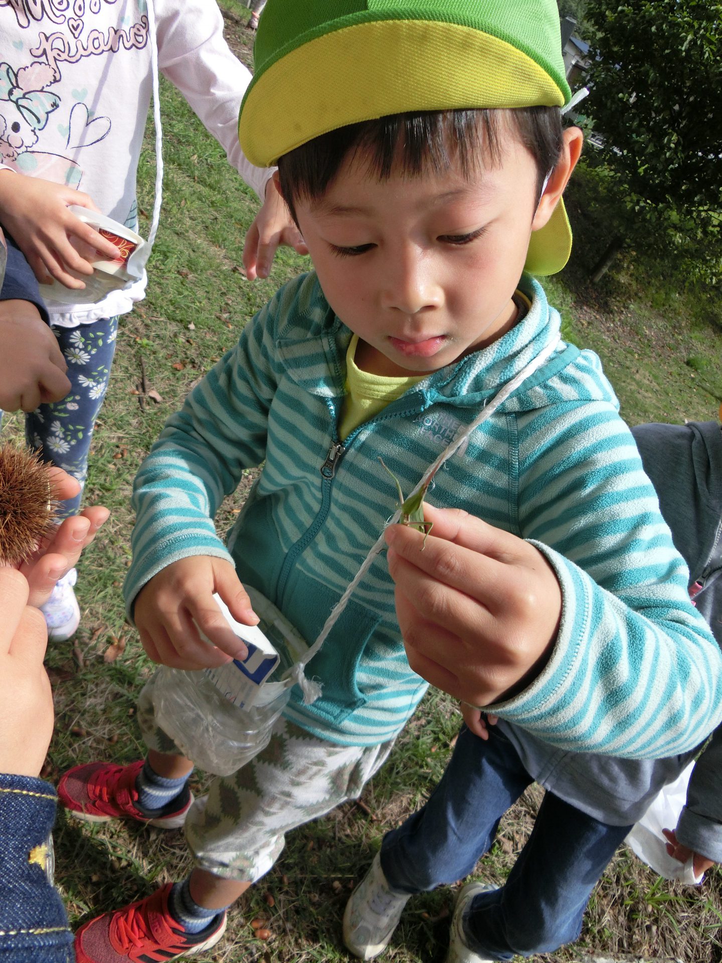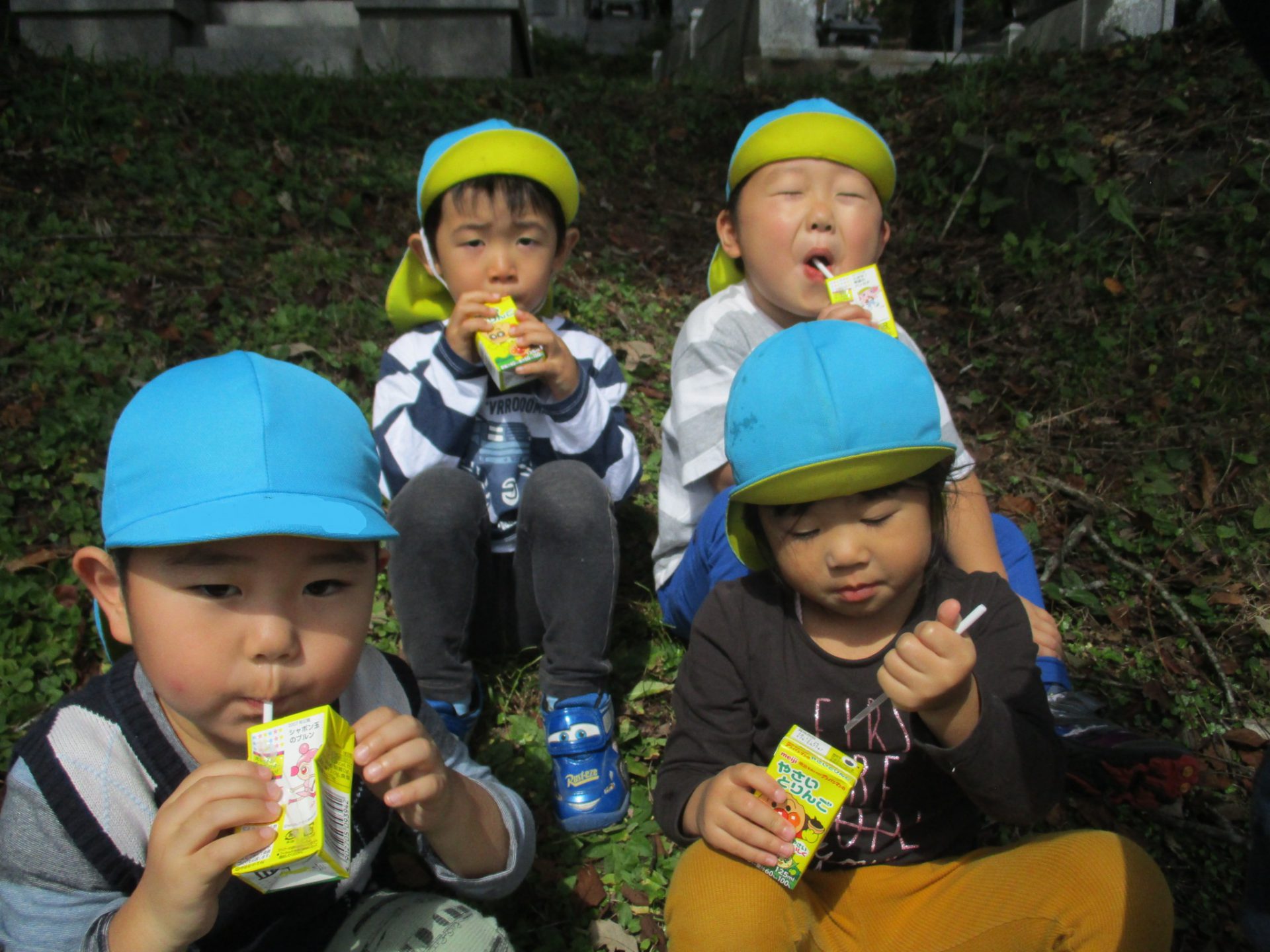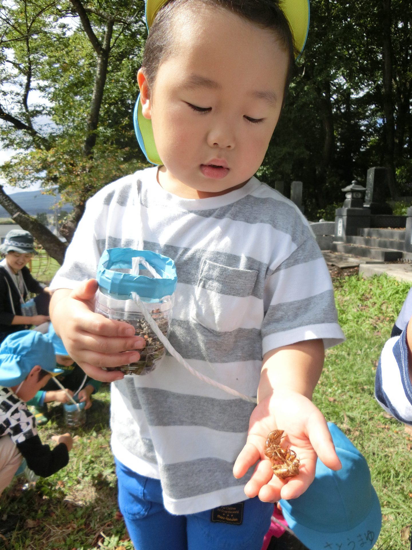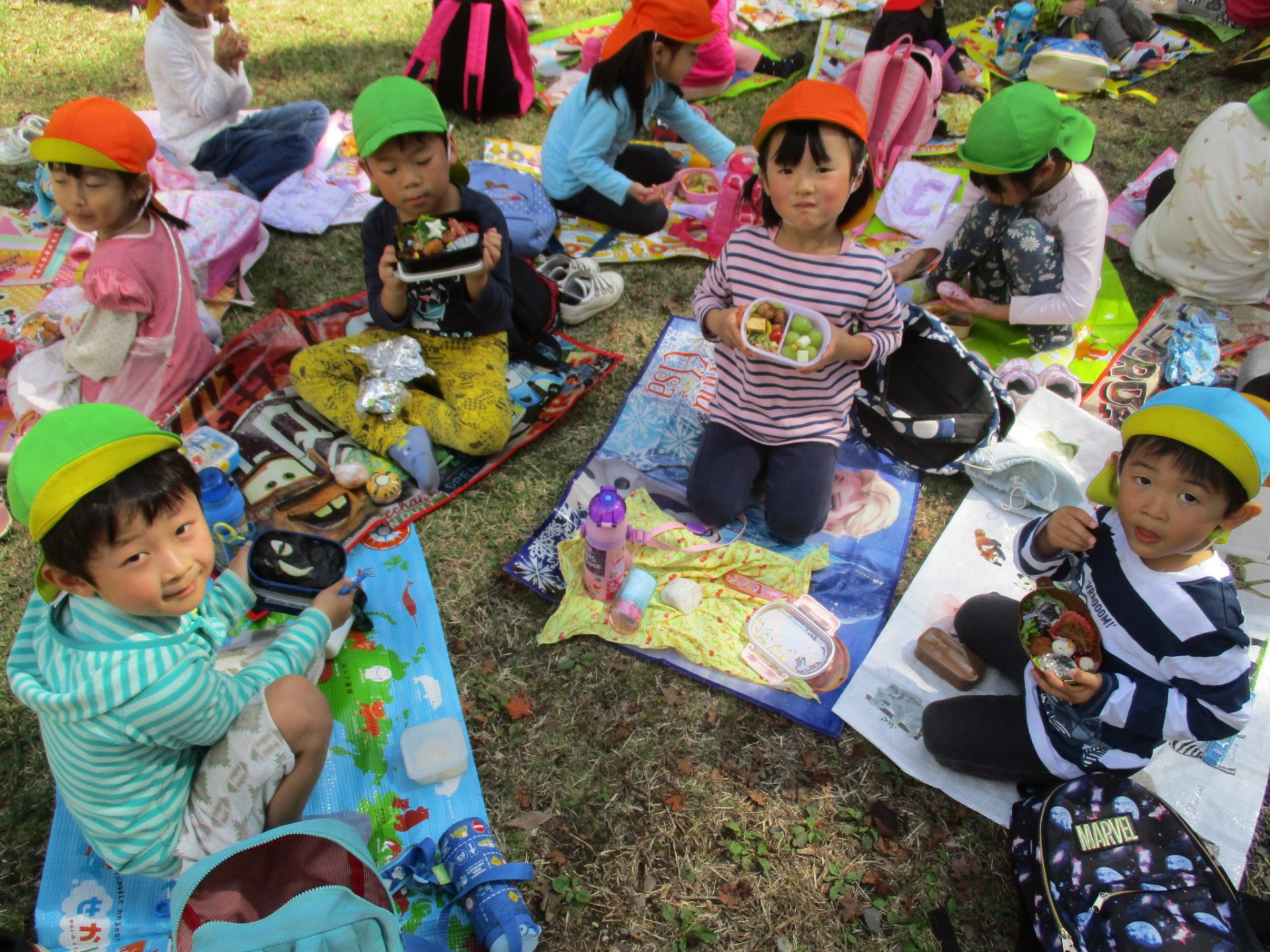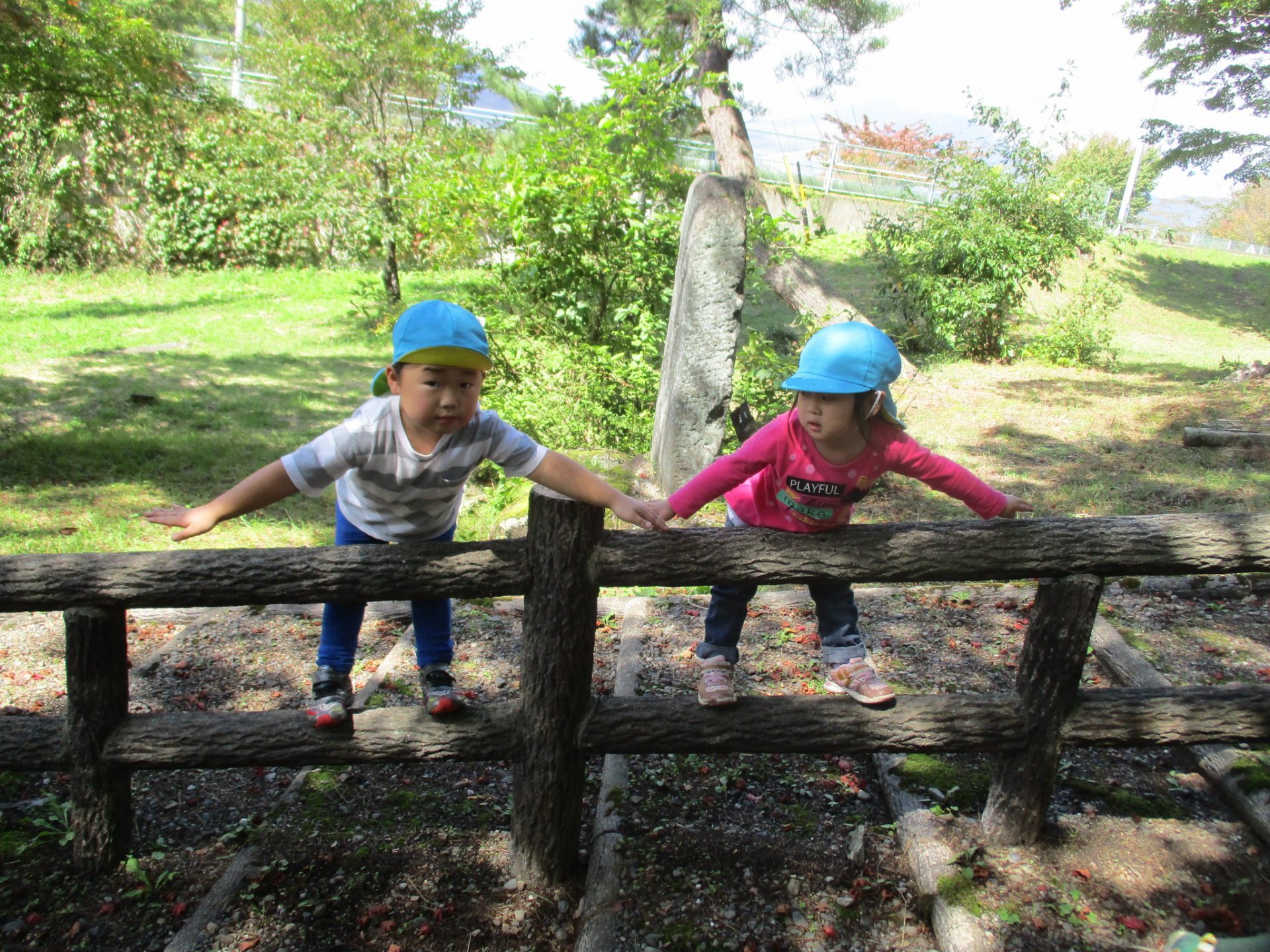 ここ何年か続けて秋の遠足は小丸山公園へ行っていますが、魅力がいっぱいです。天気も良く山もきれいに見えていて山の名前当てクイズをしましたが、富士里からの眺めと違うので間違えてしまう子もいました。「なんか違う形に見えるね。」そこに気付くことができたのも大発見でした。運動会を終え、ひとまわり大きく成長した子ども達。友達と協力して作り上げる喜びを知り、一緒に遊ぶ中での会話も、友達のよさに気付いて素直に認めようとしているのを感じます。実り多い秋の自然を介して友達との関わりがもっと深まるような活動をしていきたいと思います。