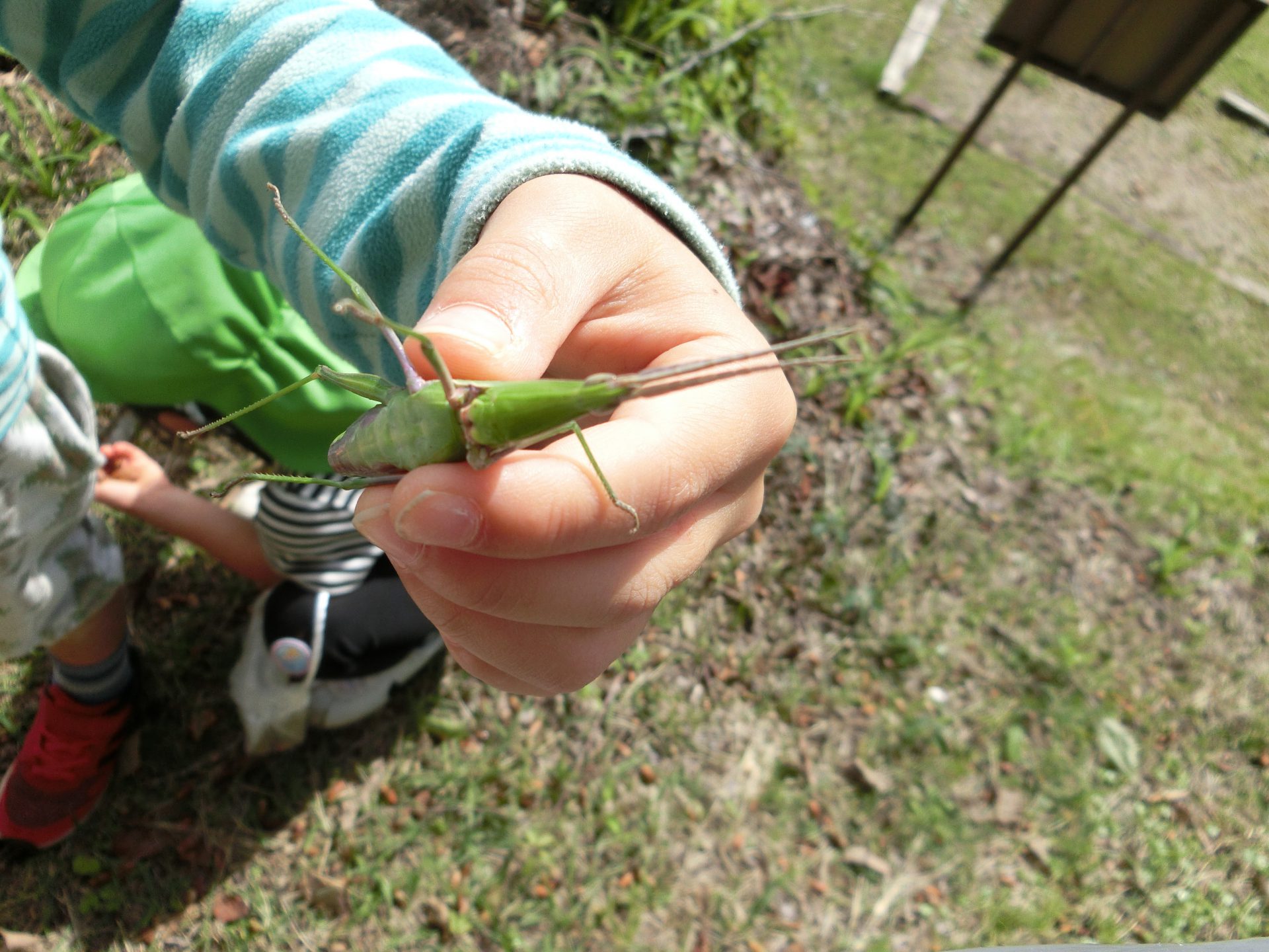 ショウリョウバッタを発見!保育士もあまり見たことがないくらいの大きいバッタでした!お散歩バッグ大活躍!