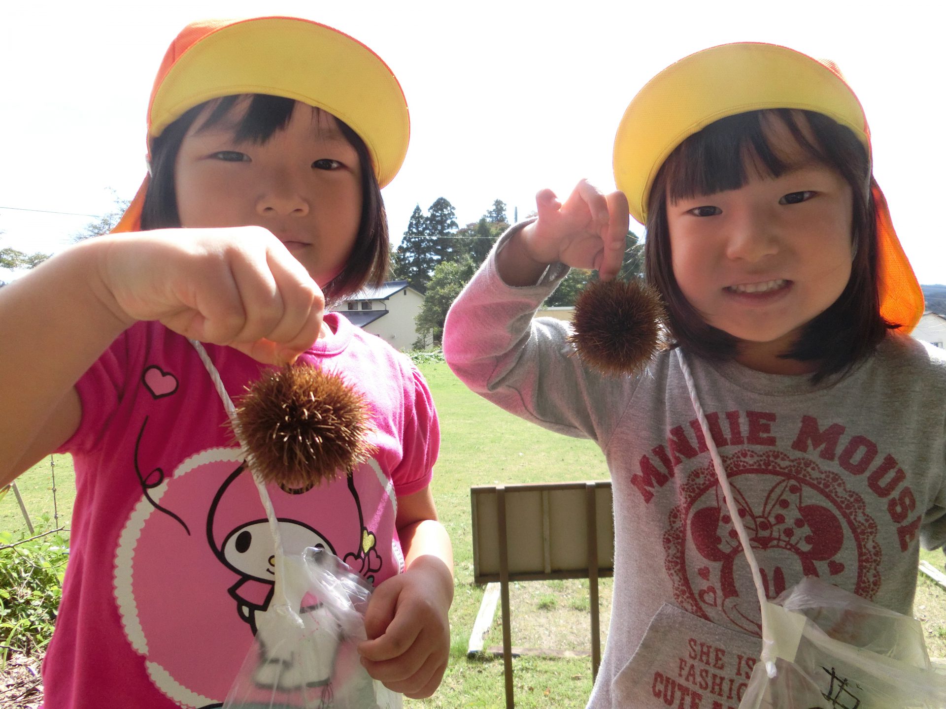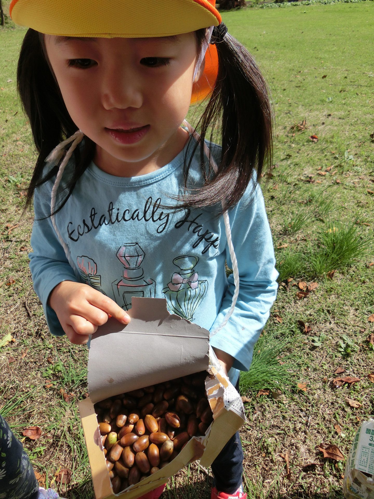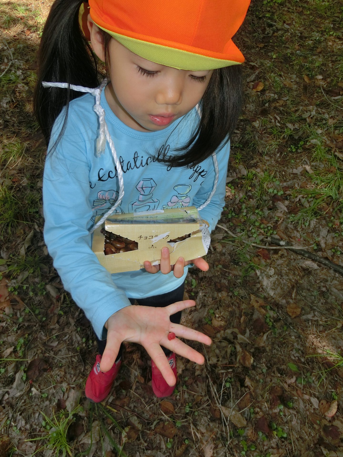 どんぐりを拾ったり、栗のいがを拾ったりしながら宝物を探して進みました。