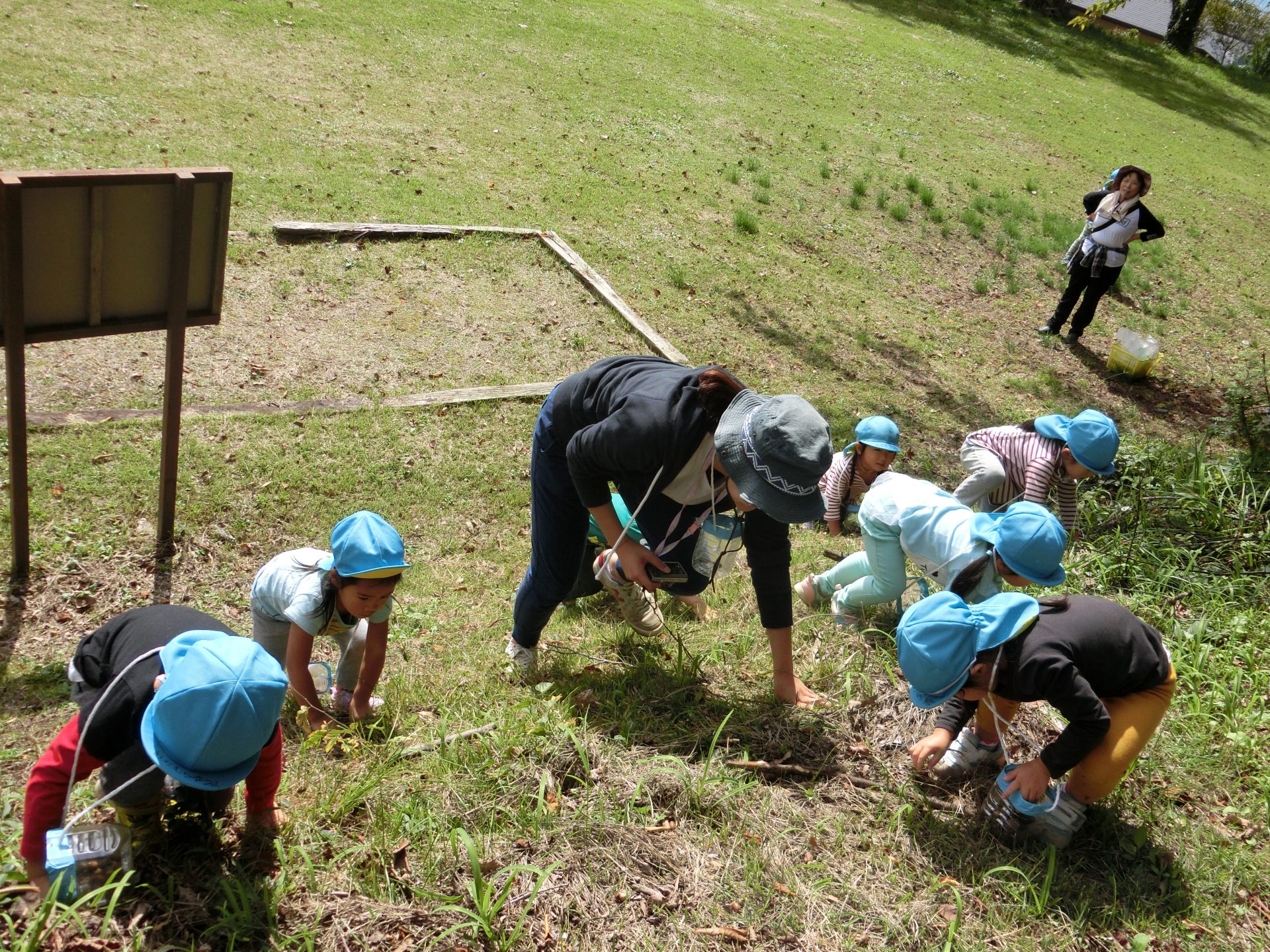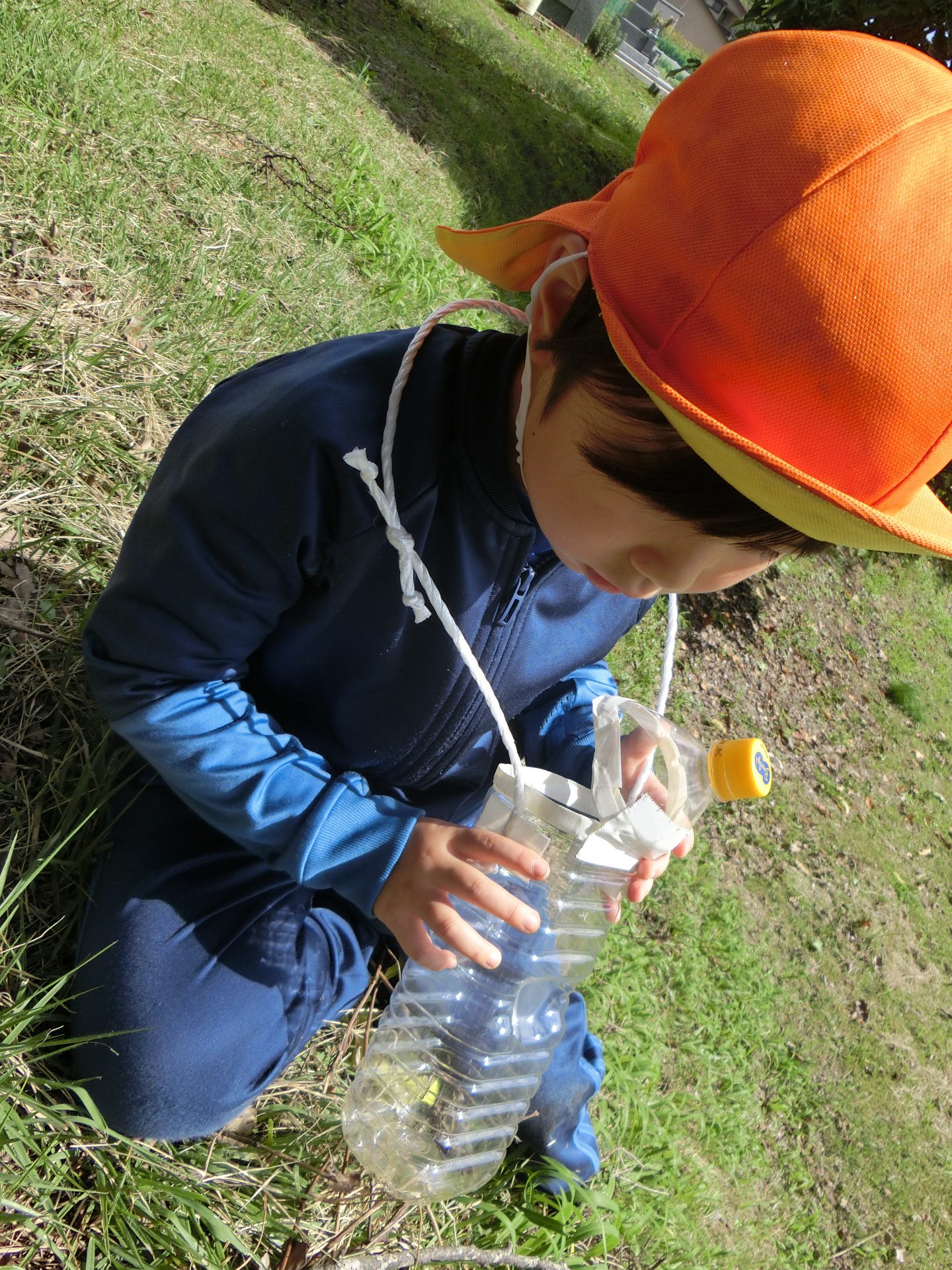 保育士が下見に行き、どんなことができそうか話すと、小丸山公園でどんな宝物を見つけようか考え目的を持って作っていました。「ぼくは大きいバッタをつかまえたいから入り口を大きくしなくちゃいけないんだよ!」など友達と話しながら作っていて、具体的なイメージを実践に移す姿が4、5歳児ならではでした。
