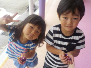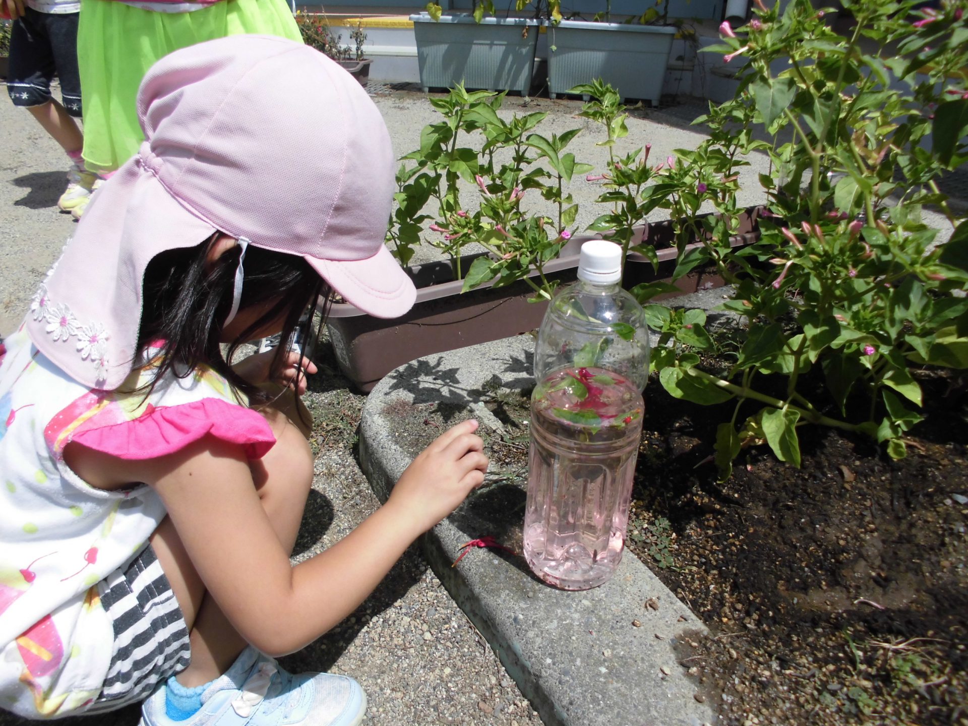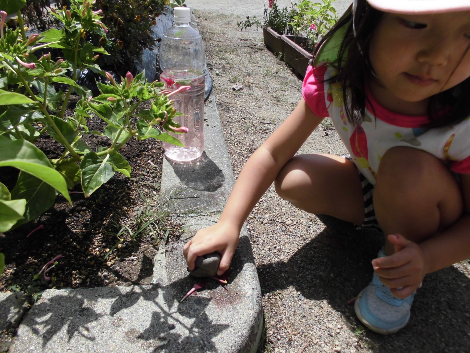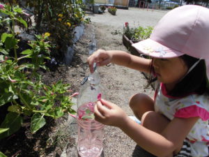 色水作りを通じて、咲き終わった花を使うと綺麗な色が出ること・石でつぶしてから水に入れると綺麗な色水ができることを知った子どもたち。