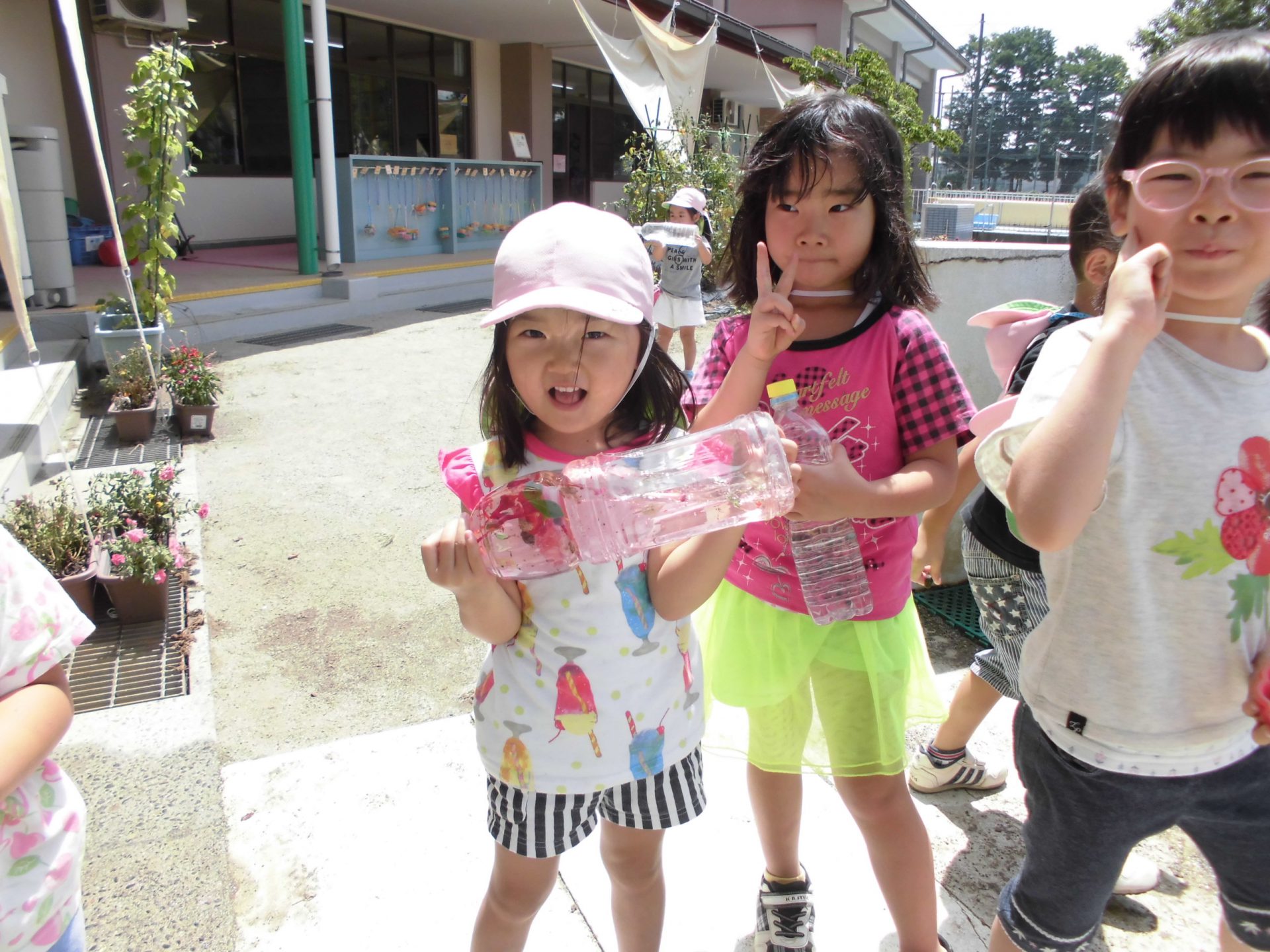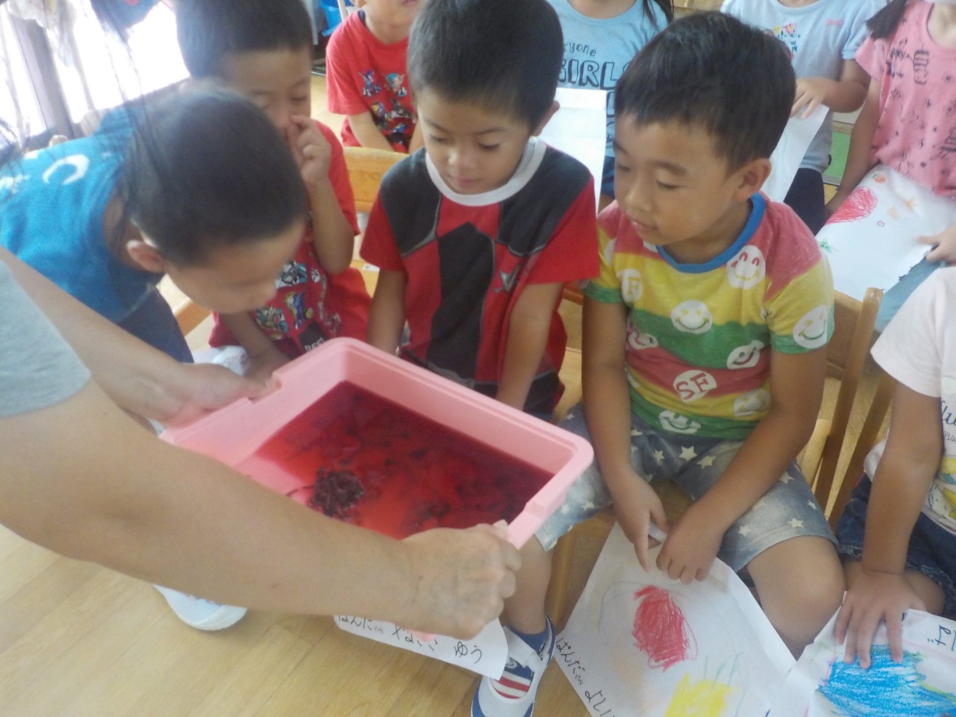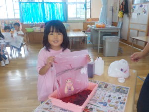 皆で集めたおしろい花と朝顔で、こんなに綺麗な色水ができました。