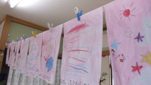 ほら見て!綺麗なピンク色に染まったよ!素敵な運動会の万国旗ができあがりました。