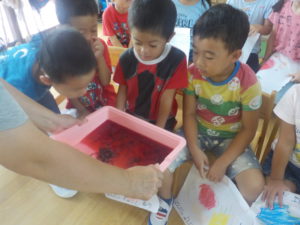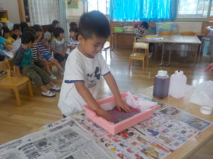 和紙を色水につけて「そーっと、そーっと…」