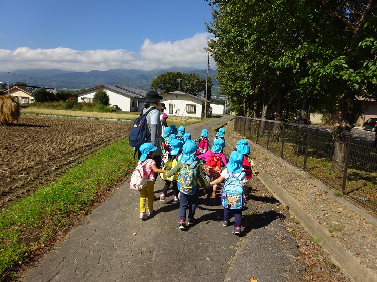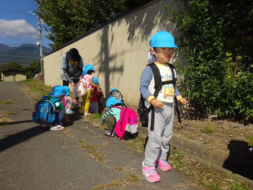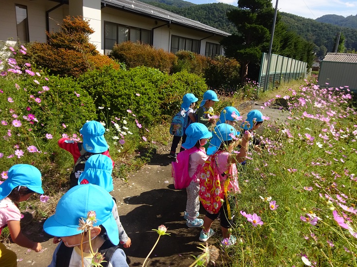 コスモス畑で小さな虫を見つけました。「なんていう虫かな?」この思いを大切にし保育園に戻ったら子どもと一緒に図鑑で調べるようにしたいと思います。