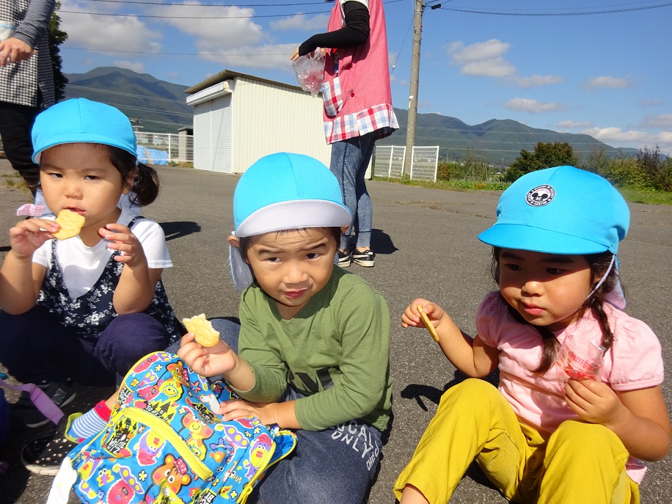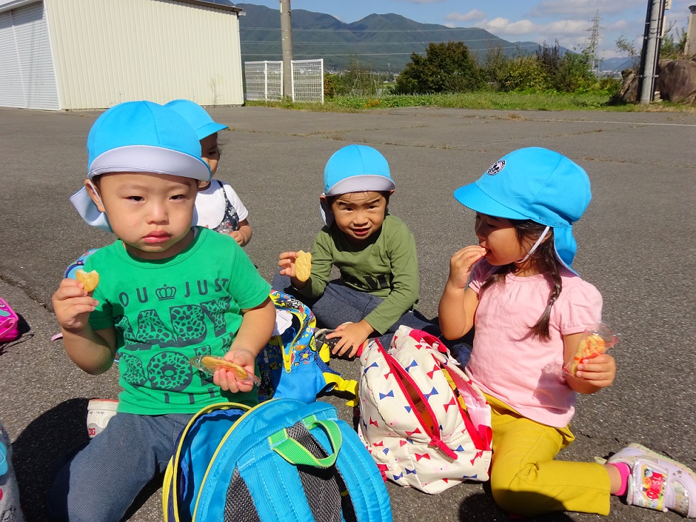 途中でおやつ休憩タイム。いい天気で気持ちいいね。おやつのおせんべいもおいしいな。