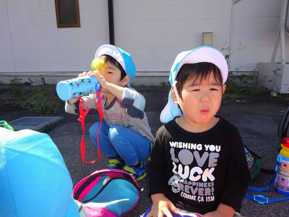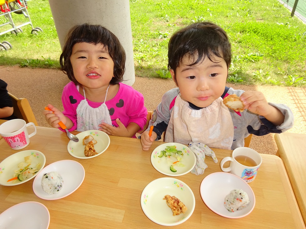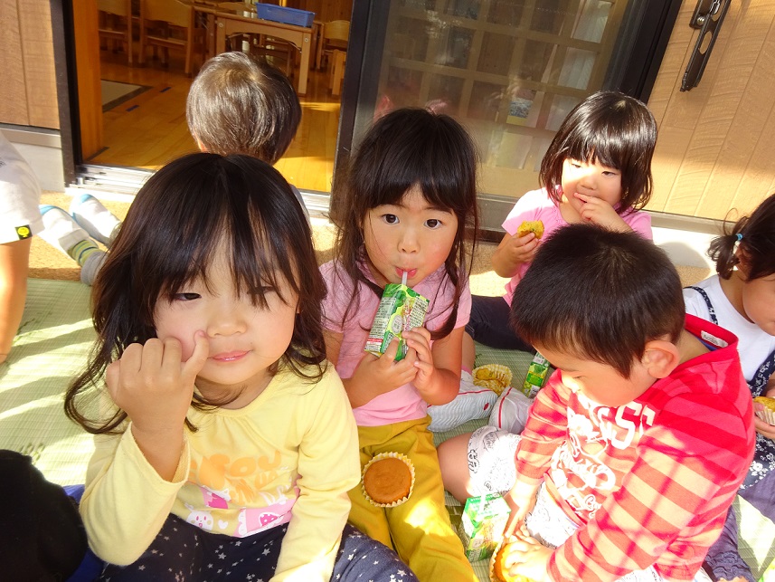 そして、お昼寝の後の午後のおやつも遠足気分。テラスで楽しく食べました。