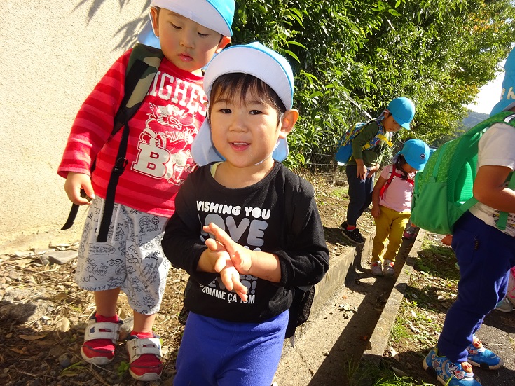どんぐりを拾うために水の流れていない川に入ってこの笑顔!
