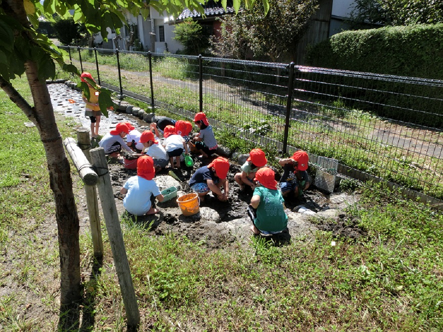 秋の天気の良い日に年少児が通称ビオトープで遊んでいます。