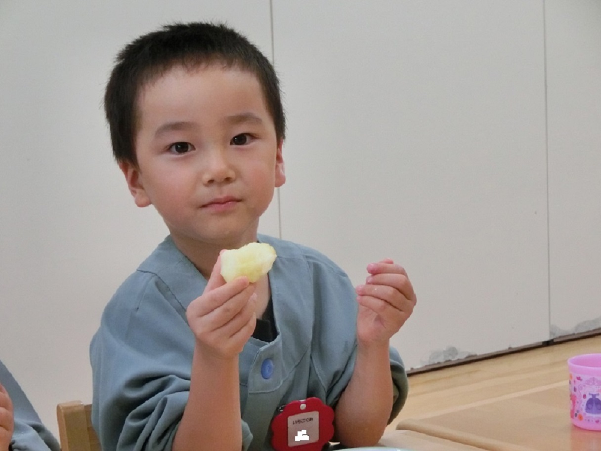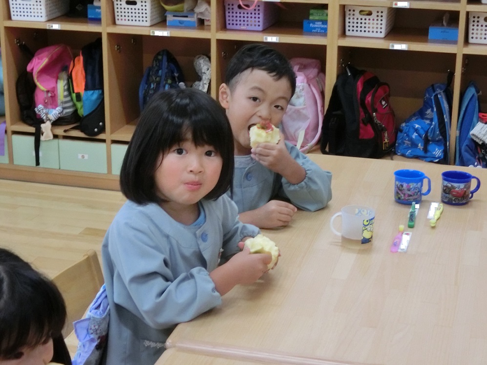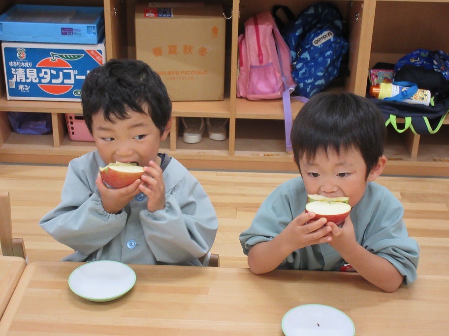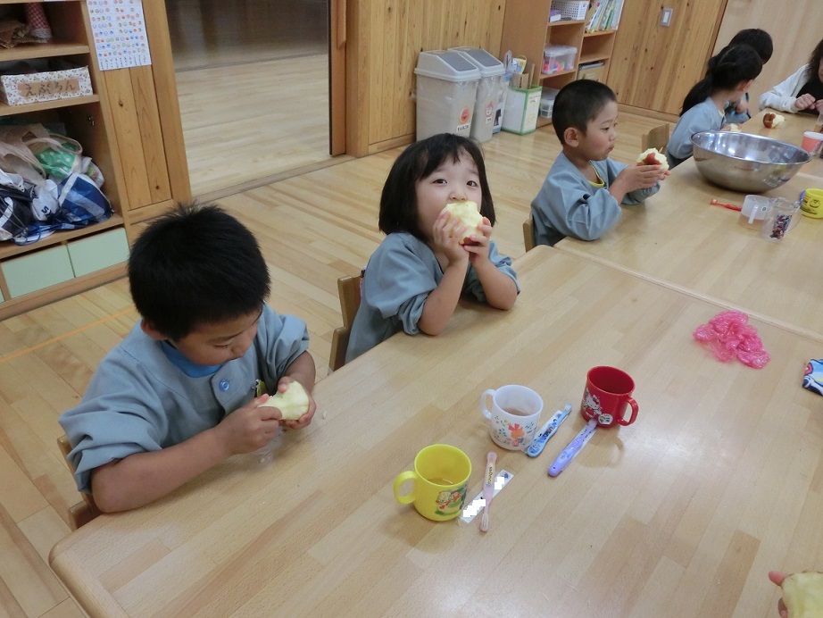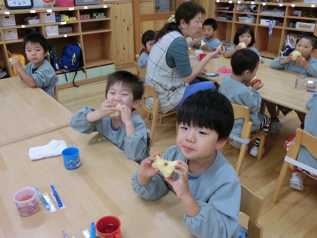 年中・年長はリンゴ1つ丸かじり!年中児も「やったぁ~!リンゴ丸かじりだ!」と大喜びです。