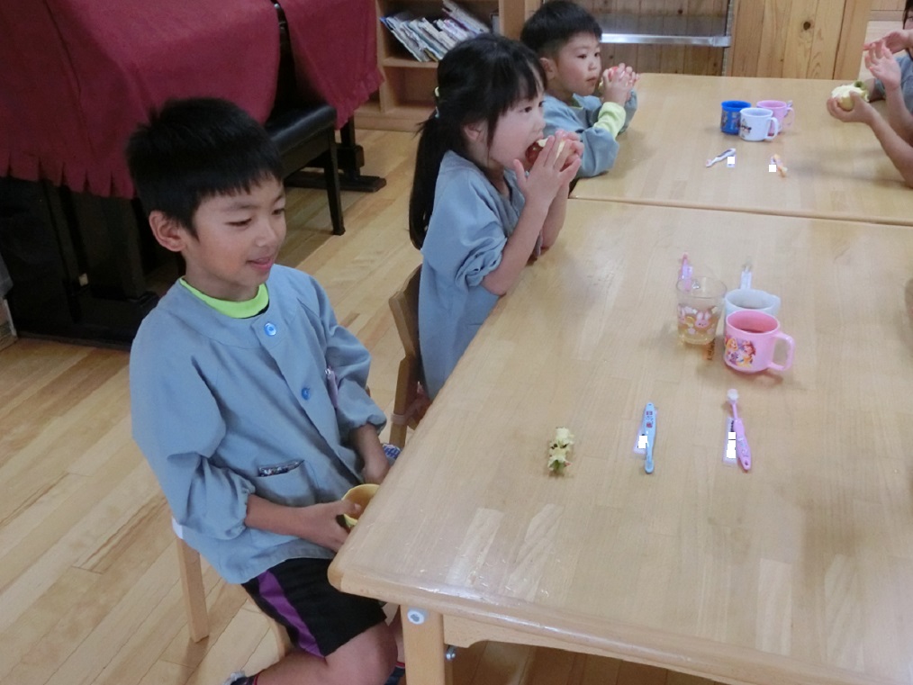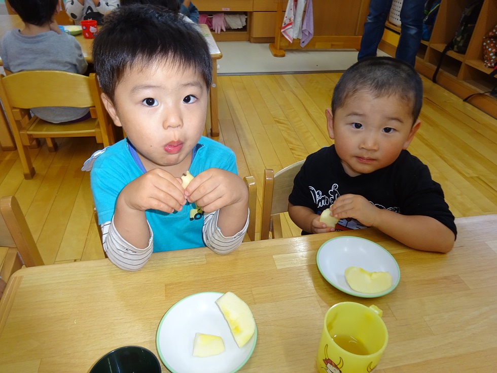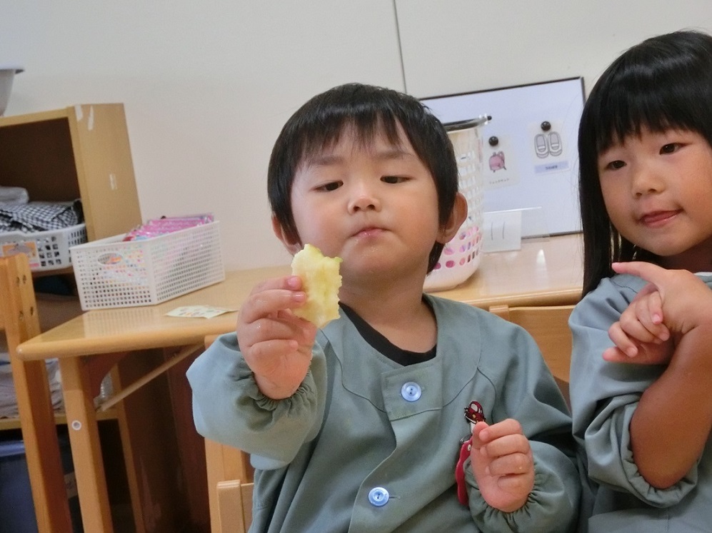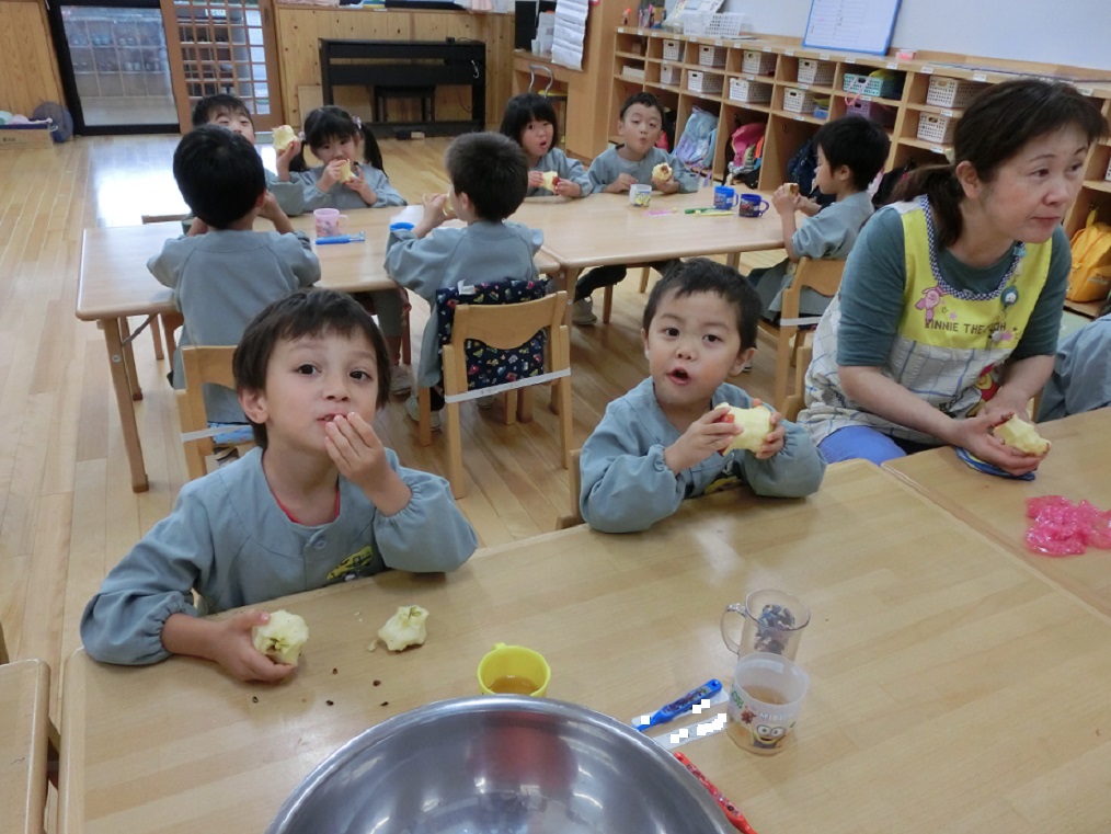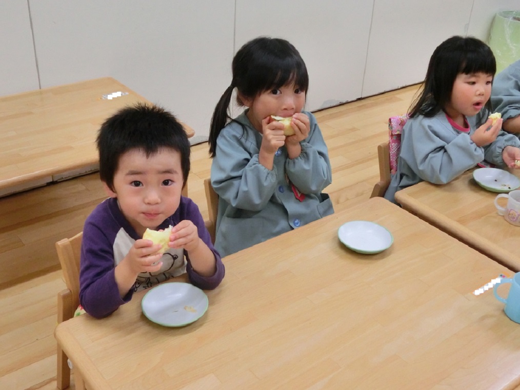 年中・年長はリンゴ1つ丸かじり!年中児も「やったぁ~!リンゴ丸かじりだ!」と大喜びです。