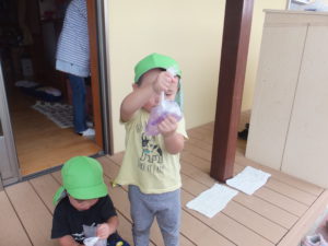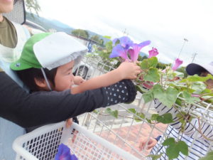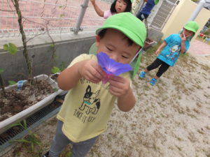 戸外あそびのときに朝顔がきれいに咲いていることに気づいた子ども達。 朝の自由あそび時、室内でジュース屋さんごっこをしてうた姿を取り上げ朝顔を使って 「ジュースを作ろう!」と提案。