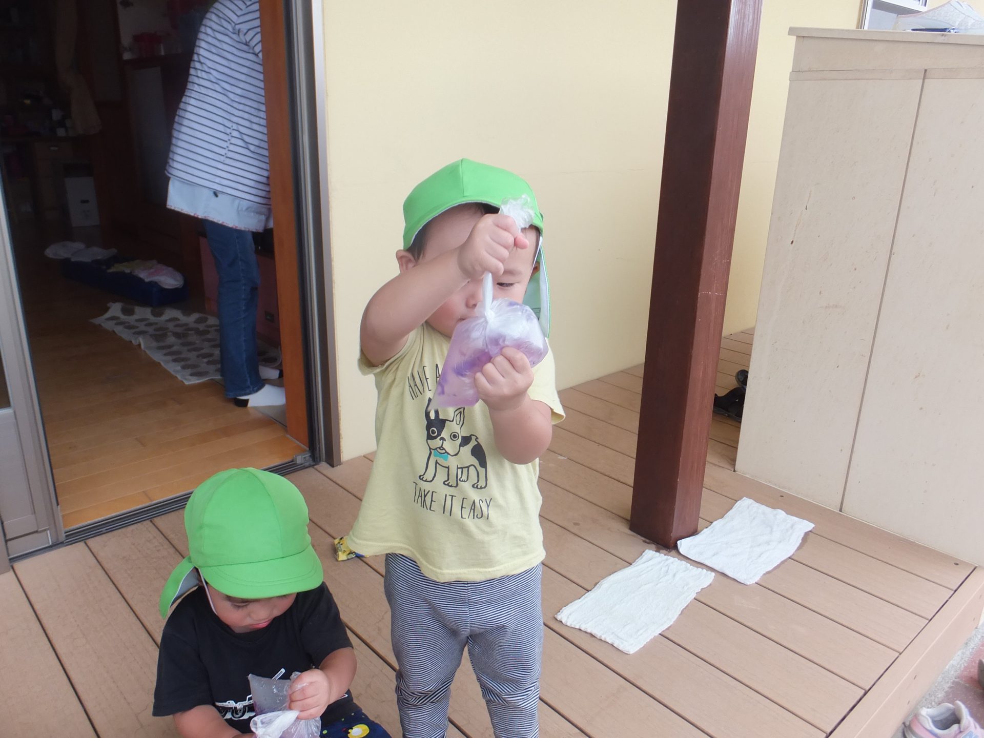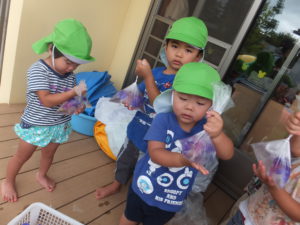 朝顔を摘みビニール袋に水と花を入れ手で揉み出す。 「わぁジュースになった!」 「見て、見て!」