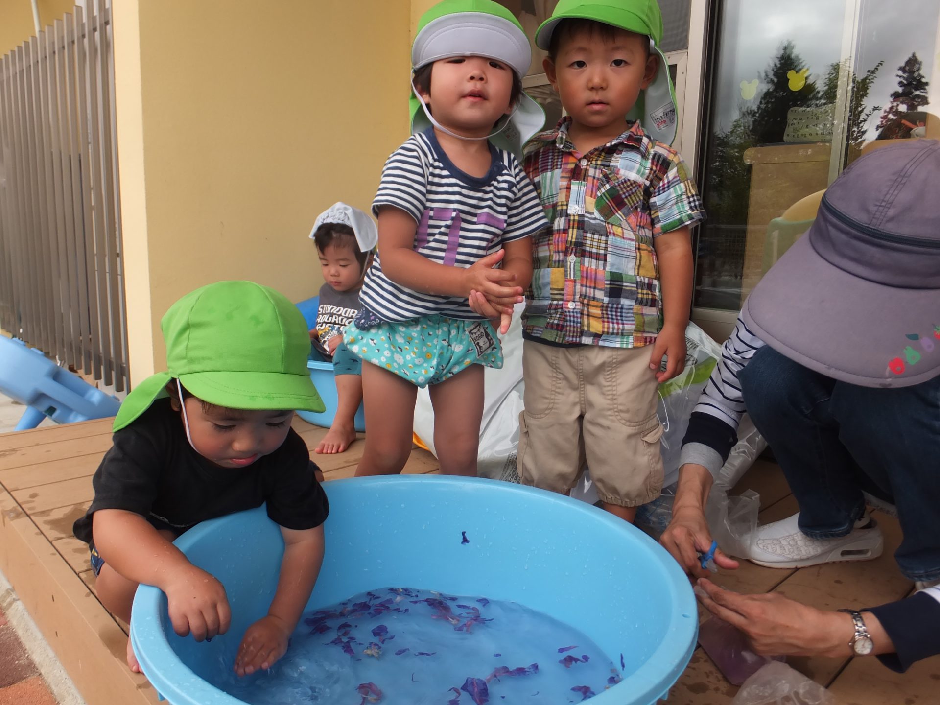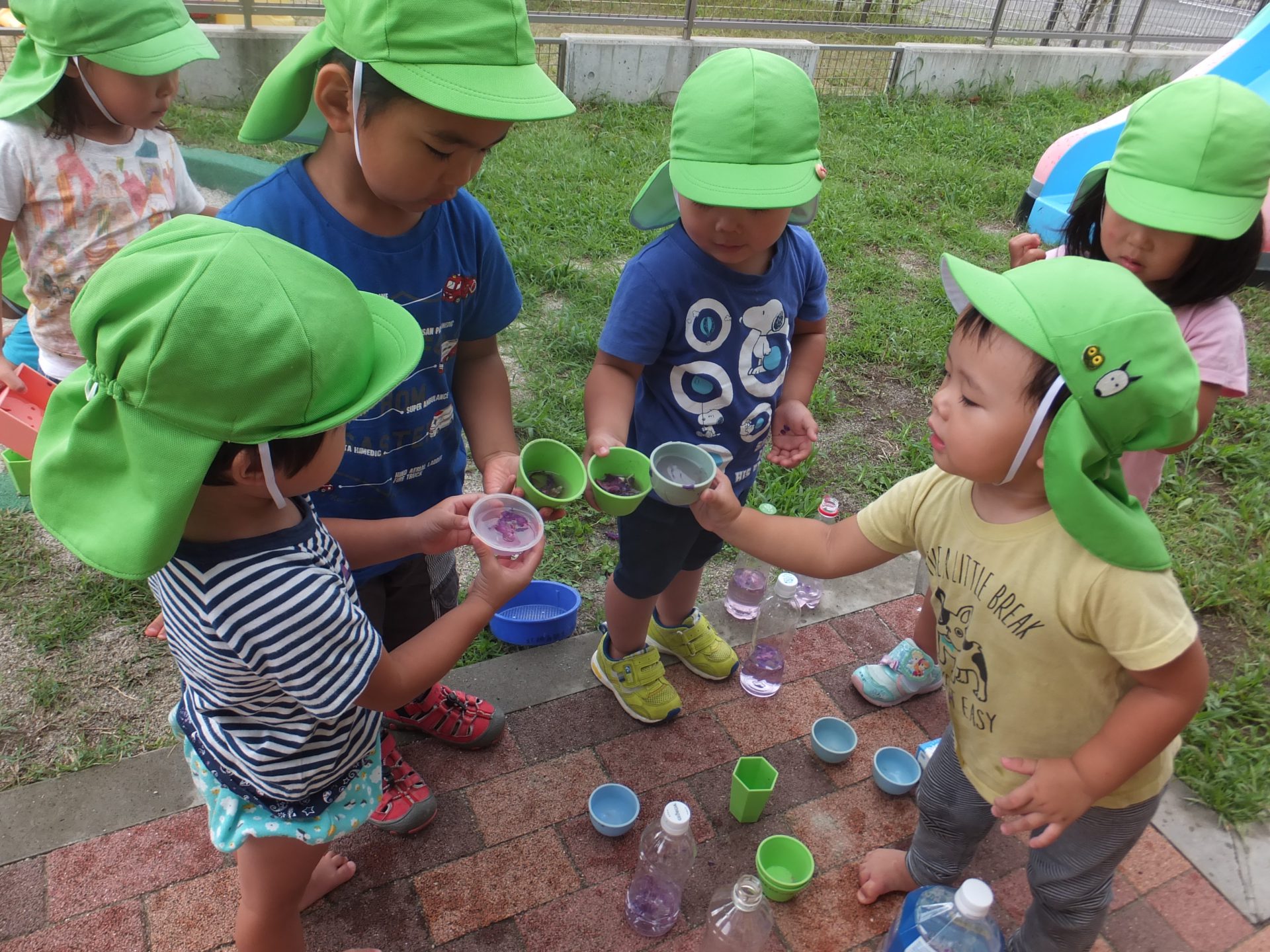 「かんぱーい!」 「わぁ~ぶどうジュースだね」 「おいしいねぇ」 朝顔の色が紫色だったのでぶどうジュースだと喜ぶ子ども達。 指で朝顔をこすると色が出ることに気づいた。
