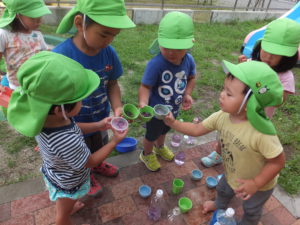 身近な自然物を使ってジュース屋さんごっこを楽しめた。 これをきっかけにこれからの季節の自然物でもたのしくいっぱいあそびたい。