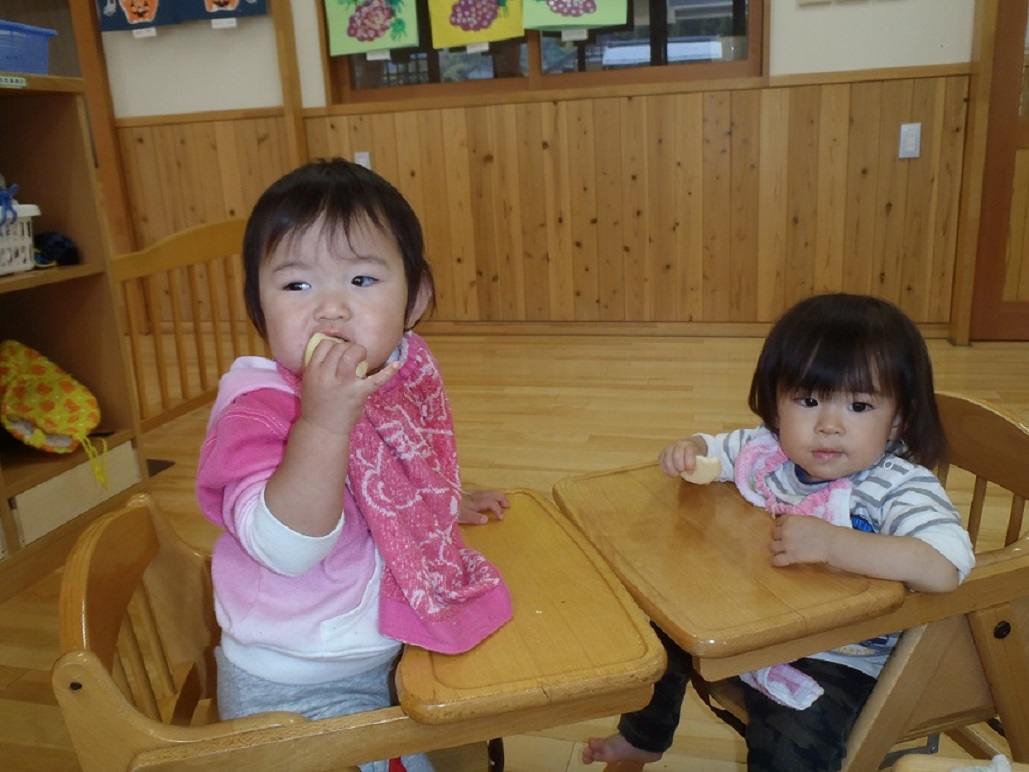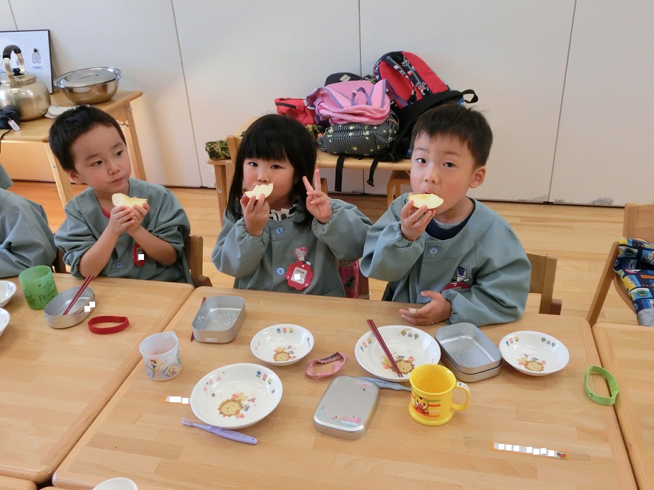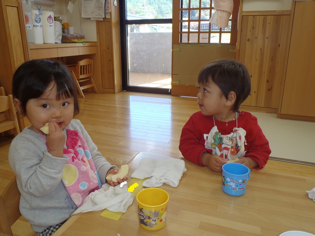 2歳児は担任から「さくらさんとすみれさんがリンゴ狩りしてきたリンゴだよ」と教えてもらいました。