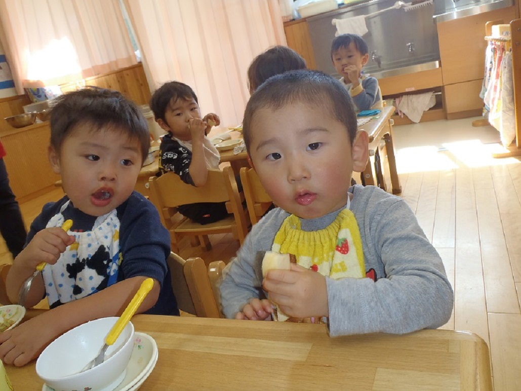1歳児もしっかり握って食べていますね。