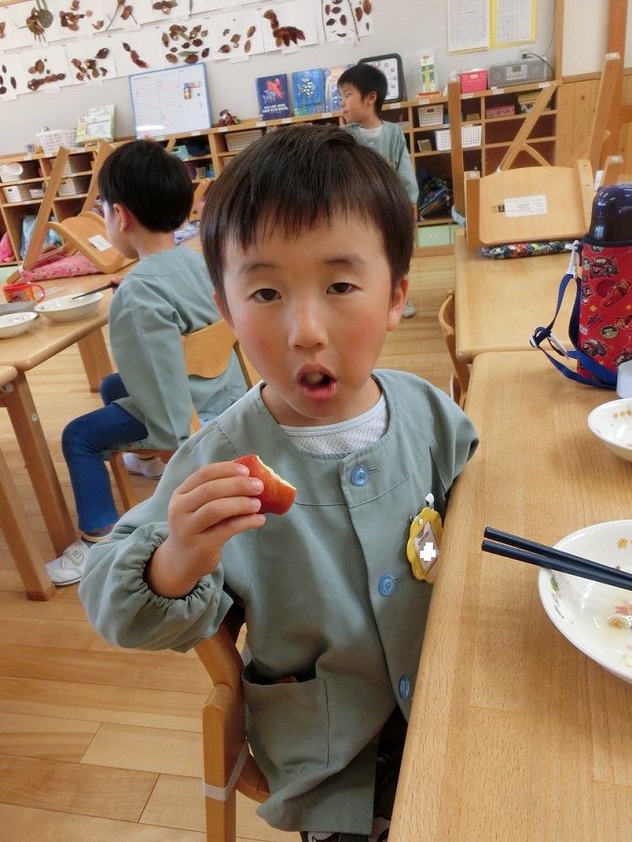 保育園に戻り一人2個ずつあるけれどどうするか子どもたちと話し合った結果、1個は家に持ち帰って、もう1個は行かなかった年少や未満児も食べられるよう給食の付け合わせに出してもらうことにしました。