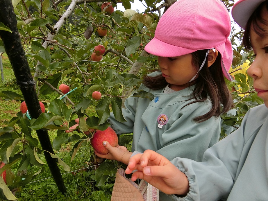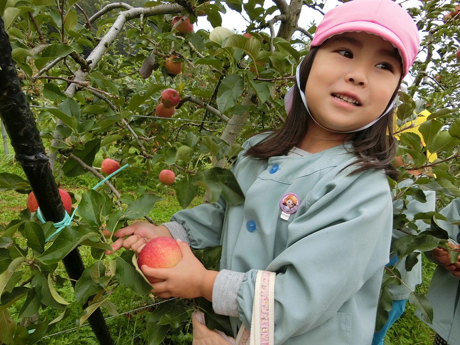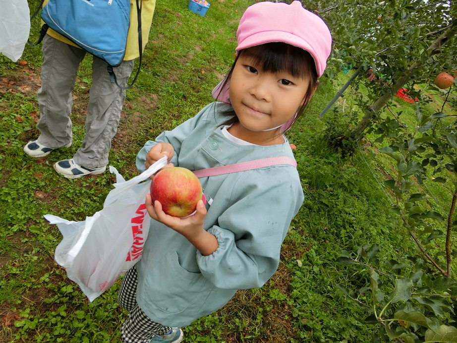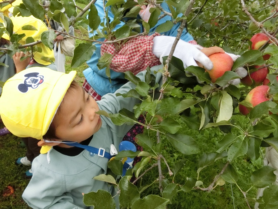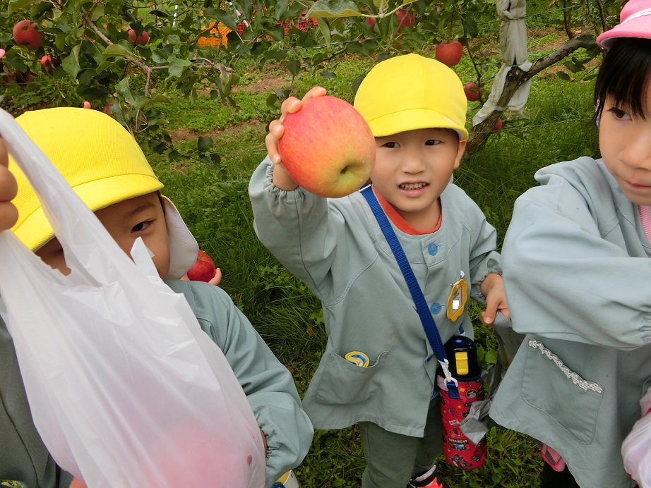 年中と年長が秋の自然を楽しもうと園周辺に散歩に出かけました。リンゴ畑を通った時にリンゴ畑の方に「リンゴ狩りしていったら」と声をかけていただきました。子どもたちも思わず「やったぁ~!」ありがとうございます。