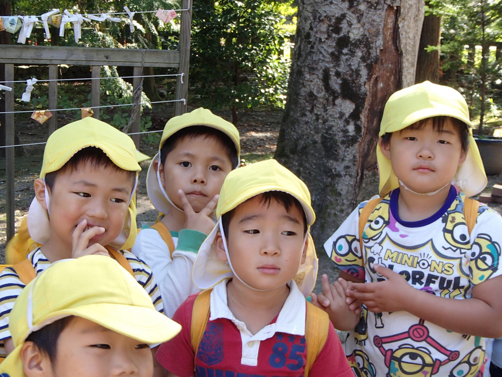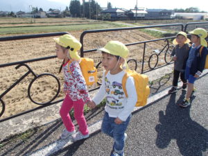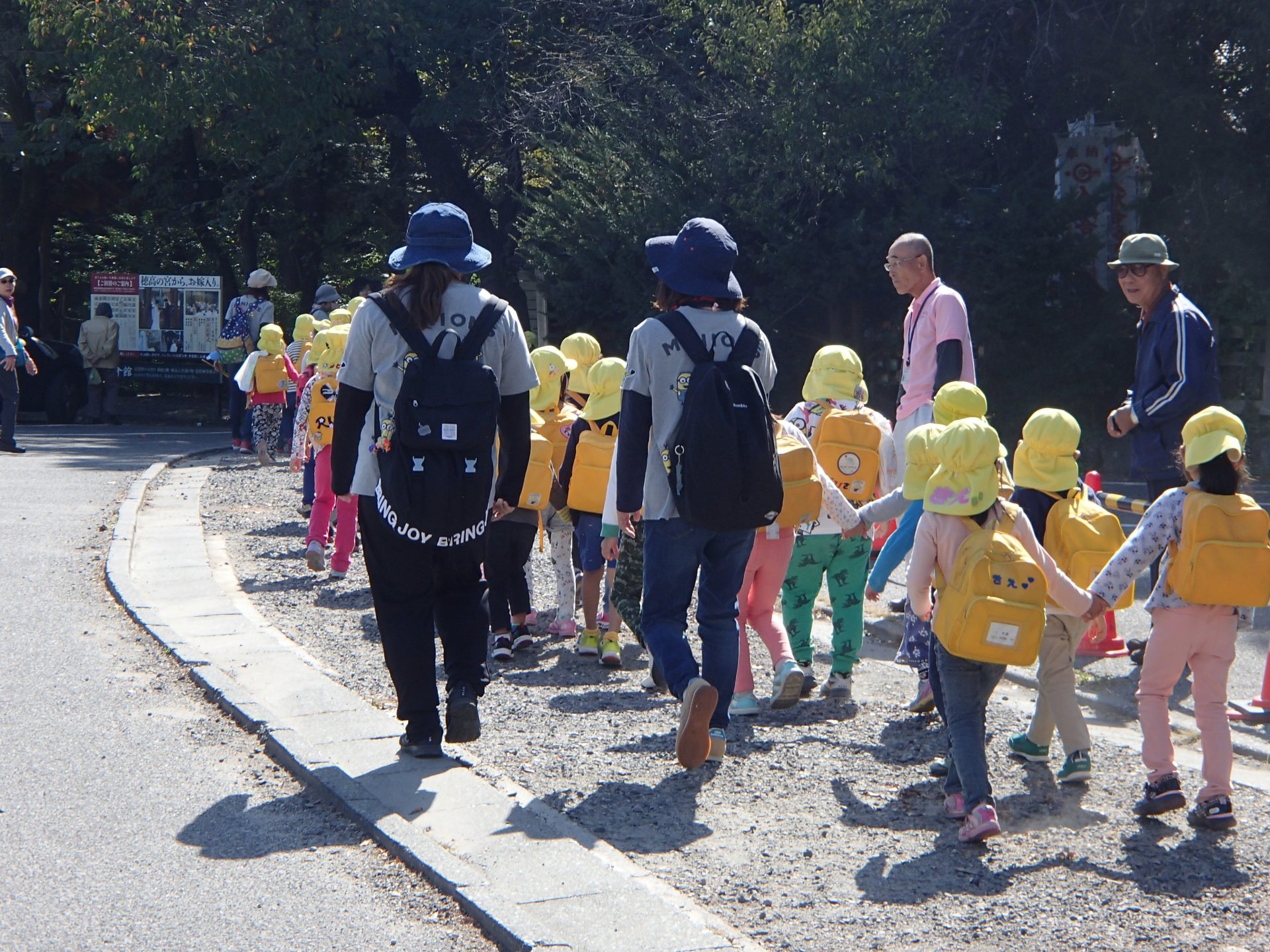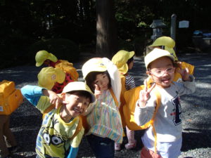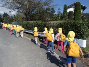 朝から、お天気にも恵まれ、年長組は、最終目的地、穂高神社を目指し遠足に出掛けました。