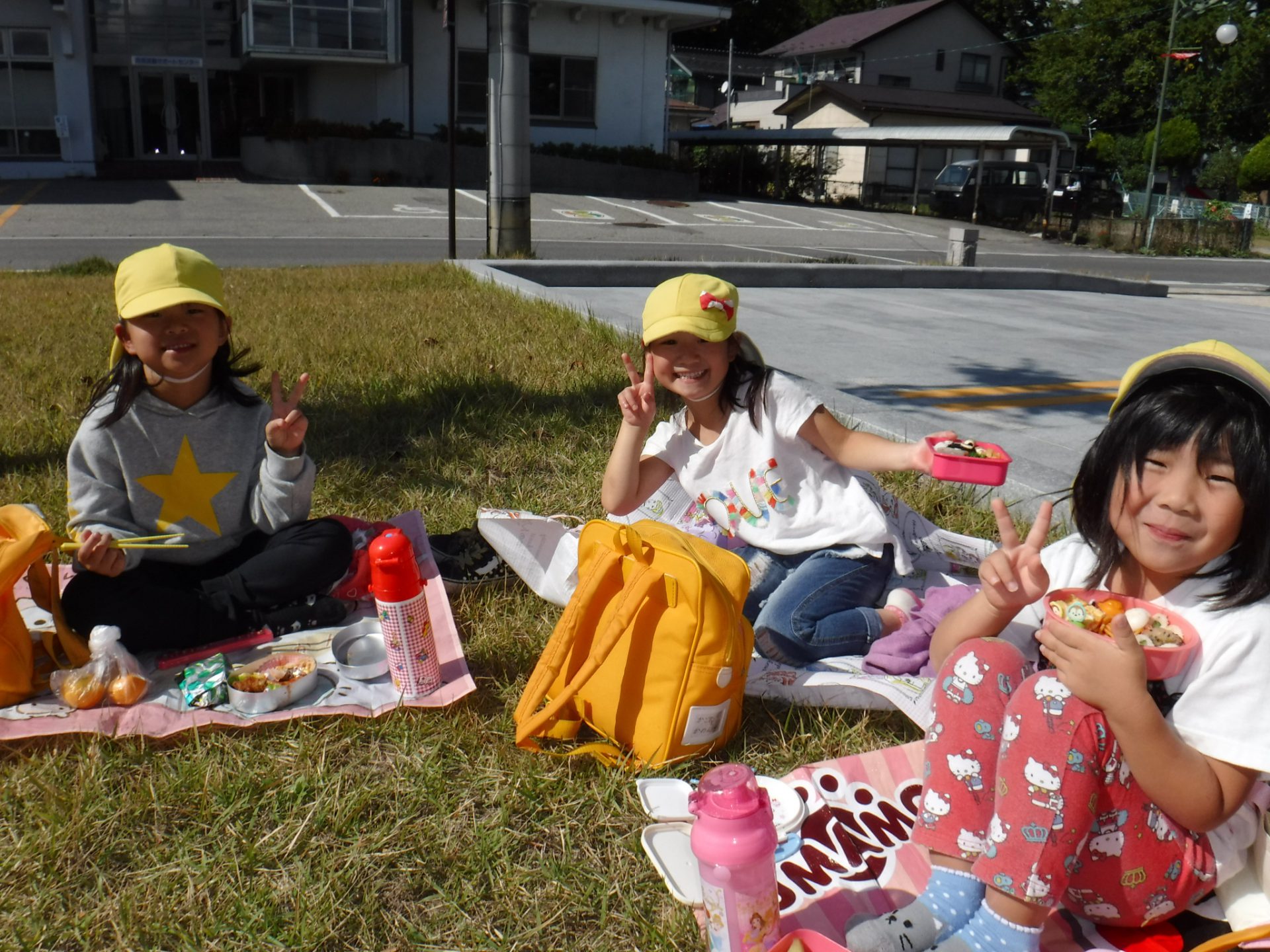 と男の子。「お弁当たのしみだよね!」と女の子。みんなニコニコ顔で出発!