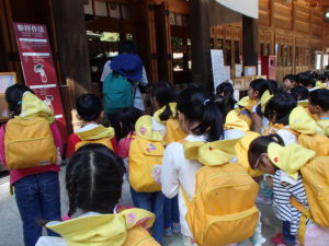 『二拝二拍手一拝』神社での拝礼作法を先生に教えてもらい、みんなでお参りしました。