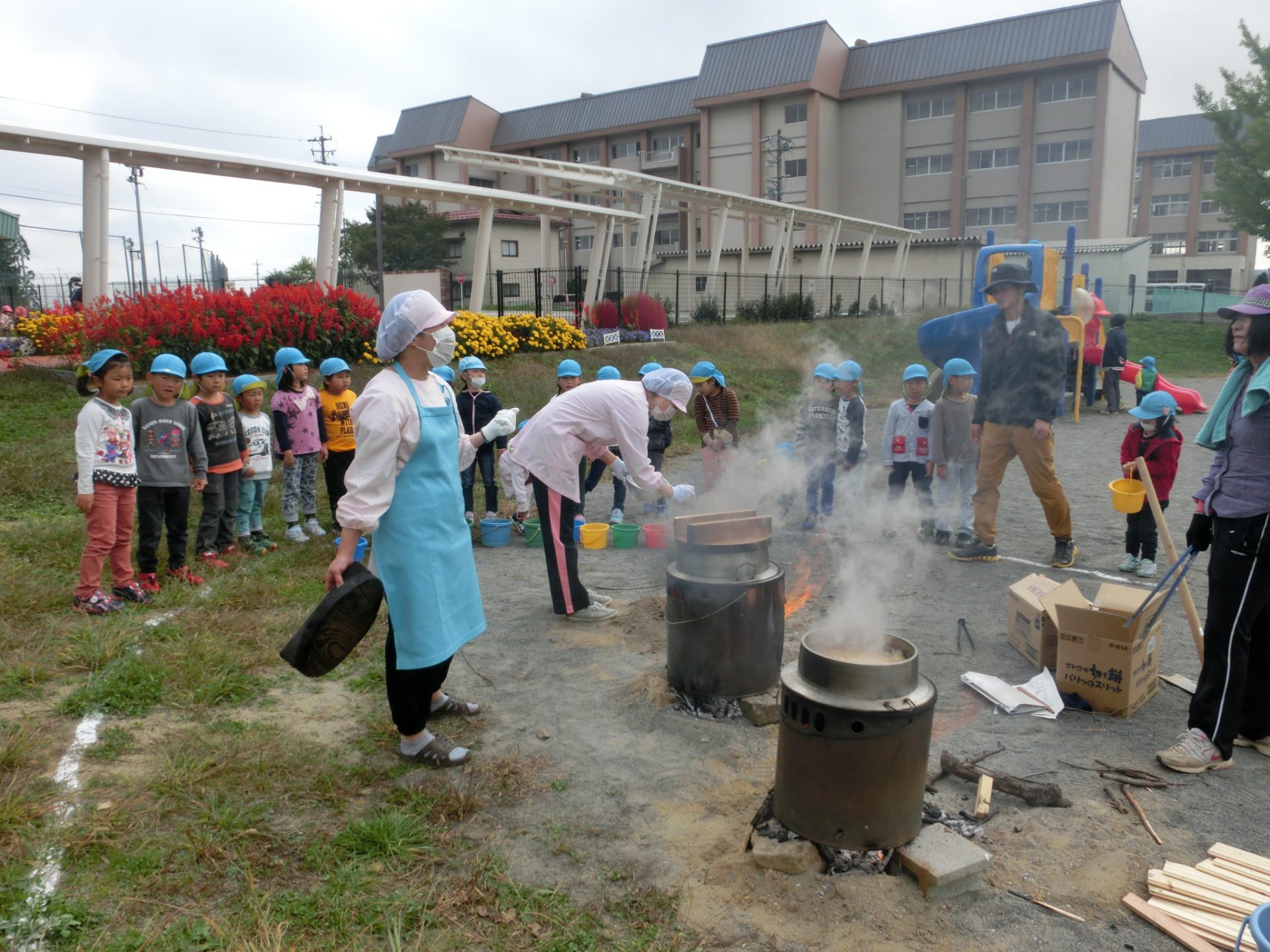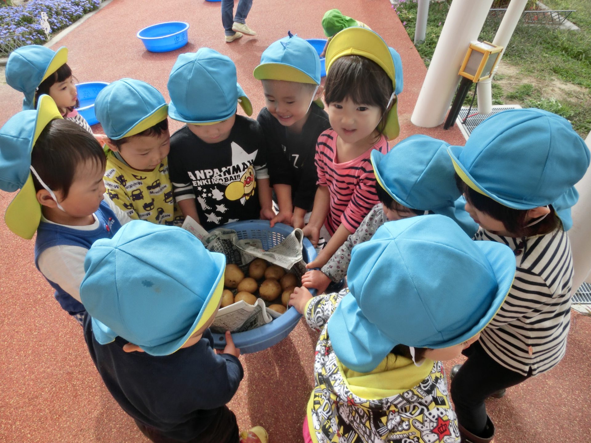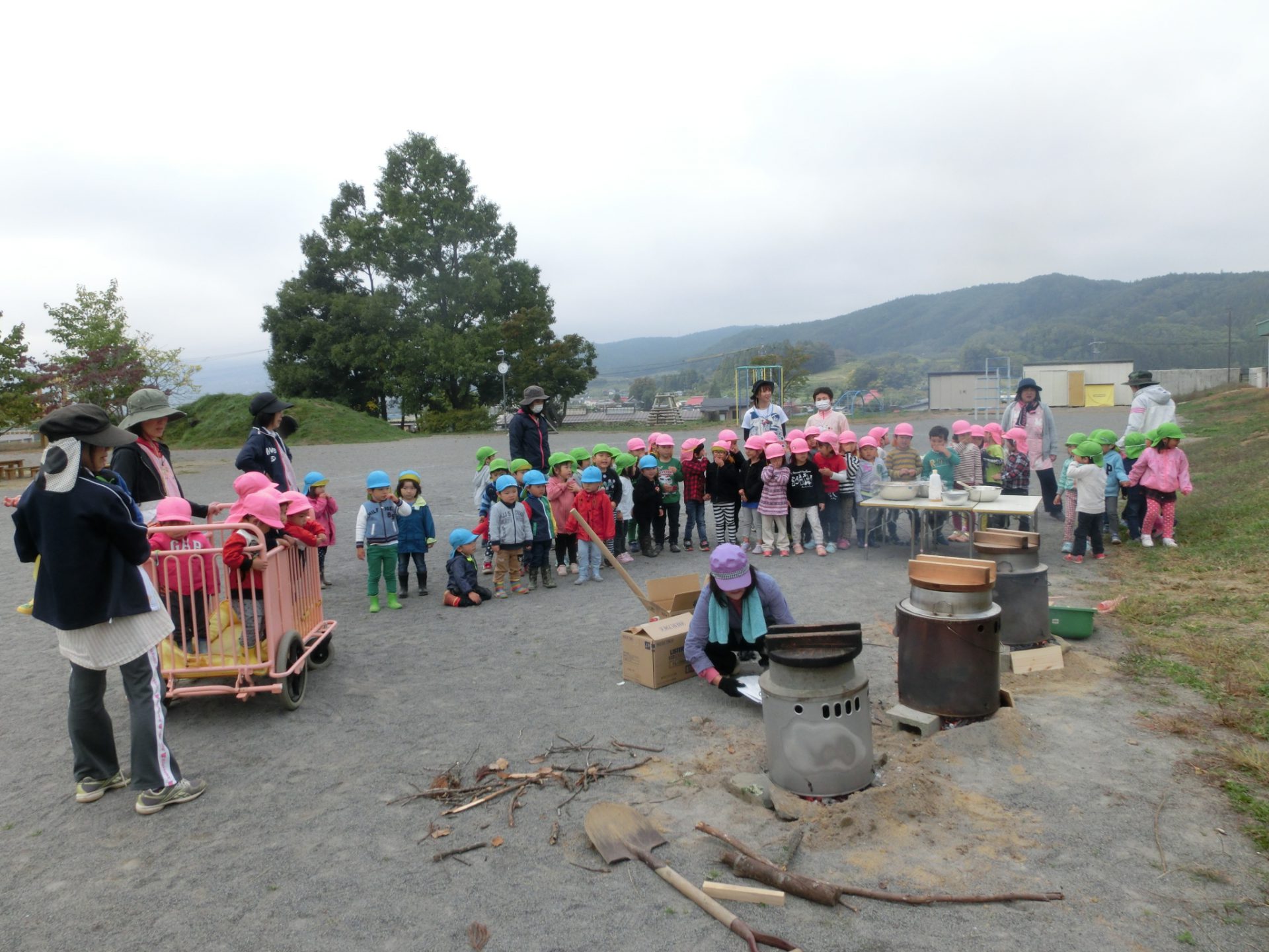 薪拾い・じゃがいも洗いをした年少さん、未満児さんも見にきましたよ。