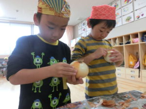 「たまねぎしみなかった!」玉ねぎは目にしみると思っていた子もいましたが、皮をむいただけならしみないことに気付いたようです。