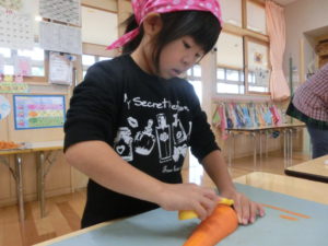 「ナスはかわがかたいね」「たまねぎはつるつるだった」野菜によって感触が違うことに気付いたようでした。