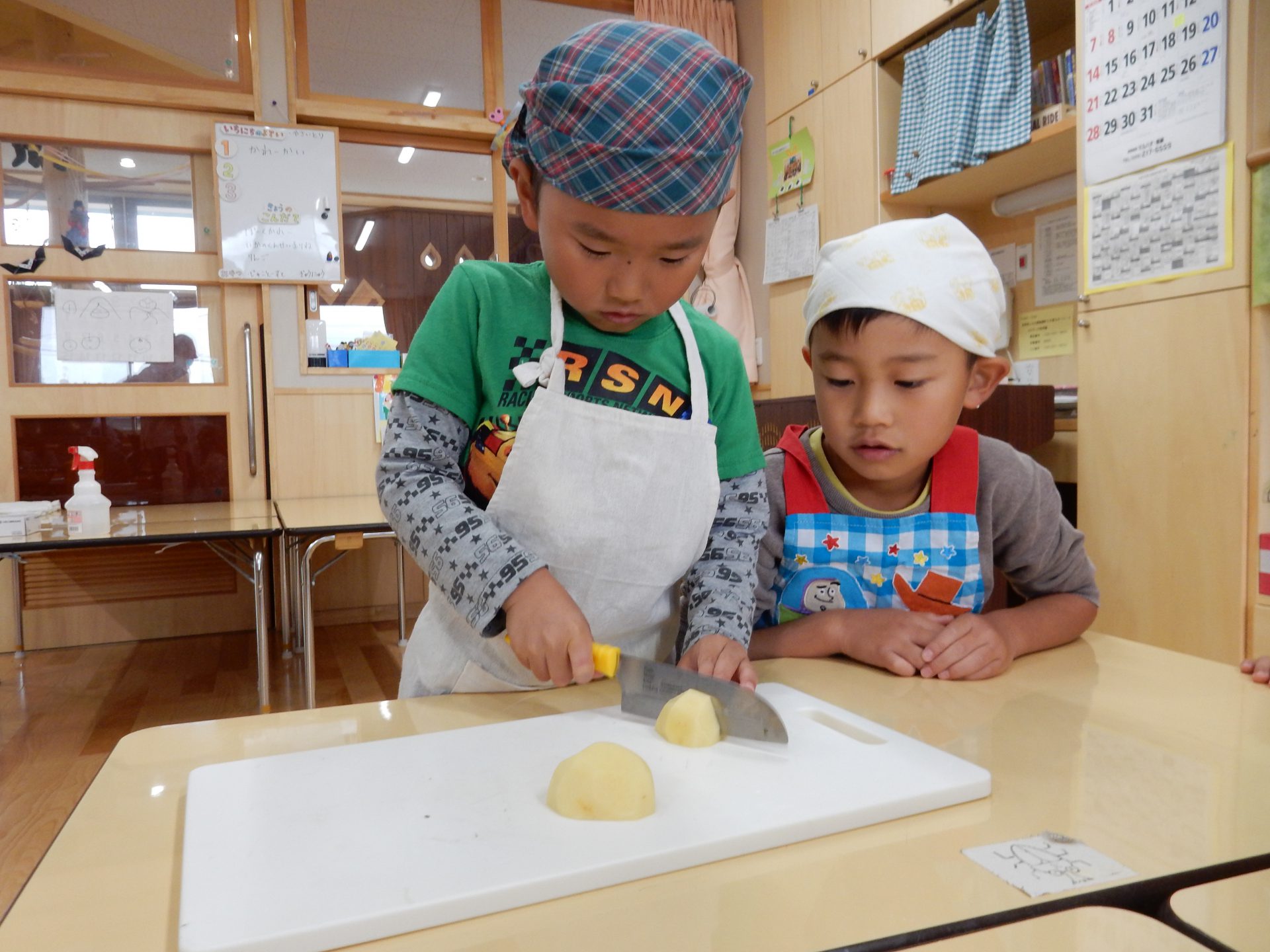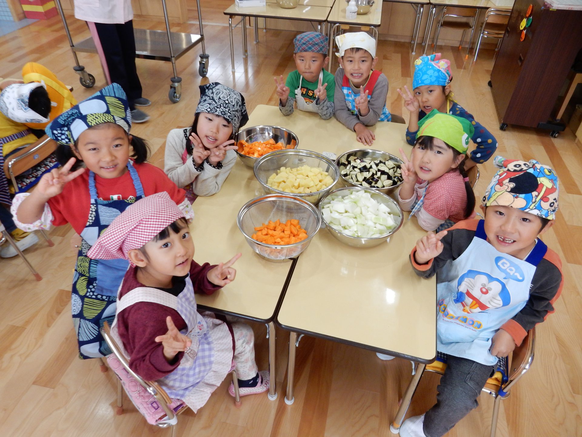 「はやくカレーたべたいな」「カレー会たのしみだね」年少さんもお手伝い、