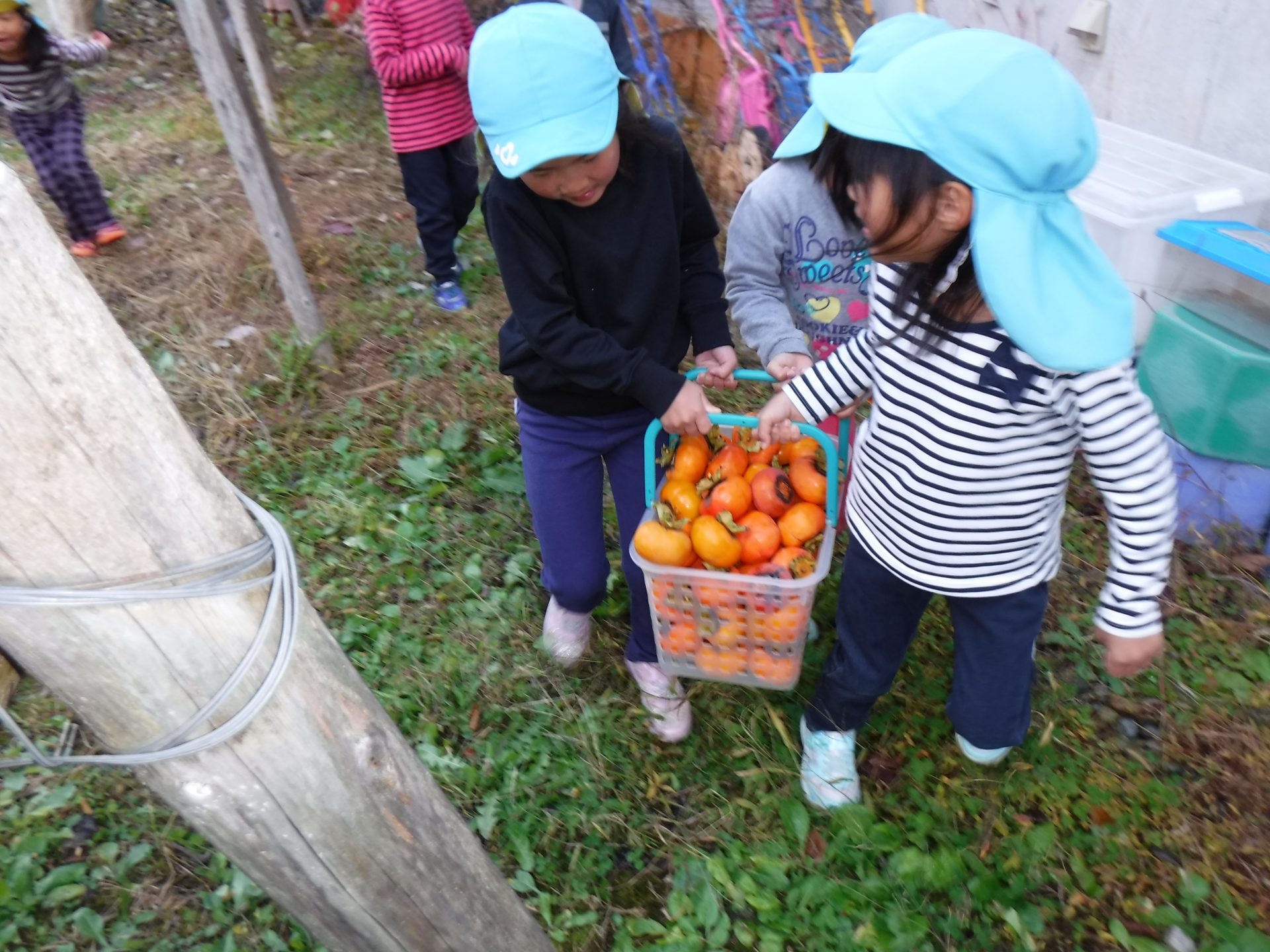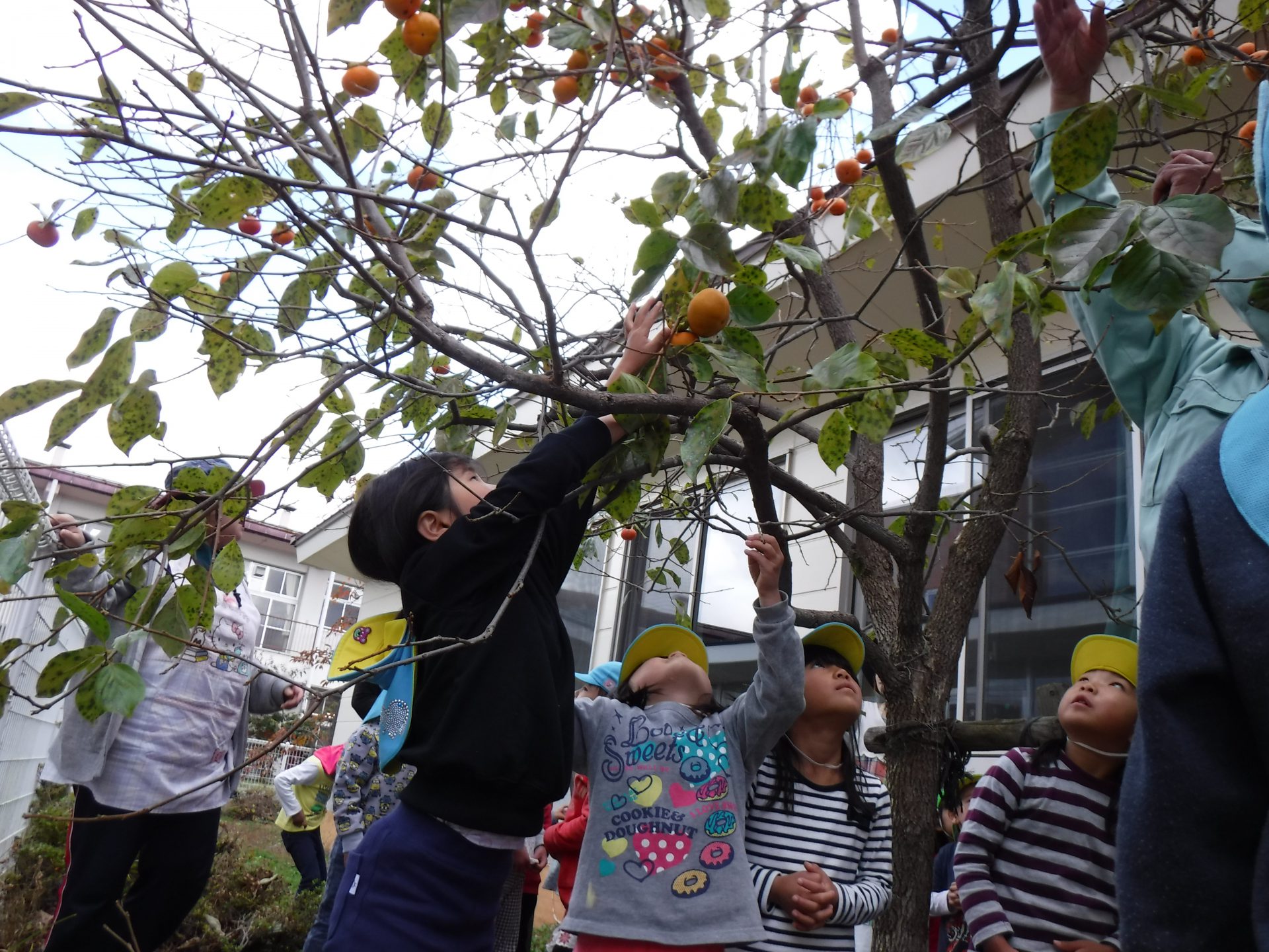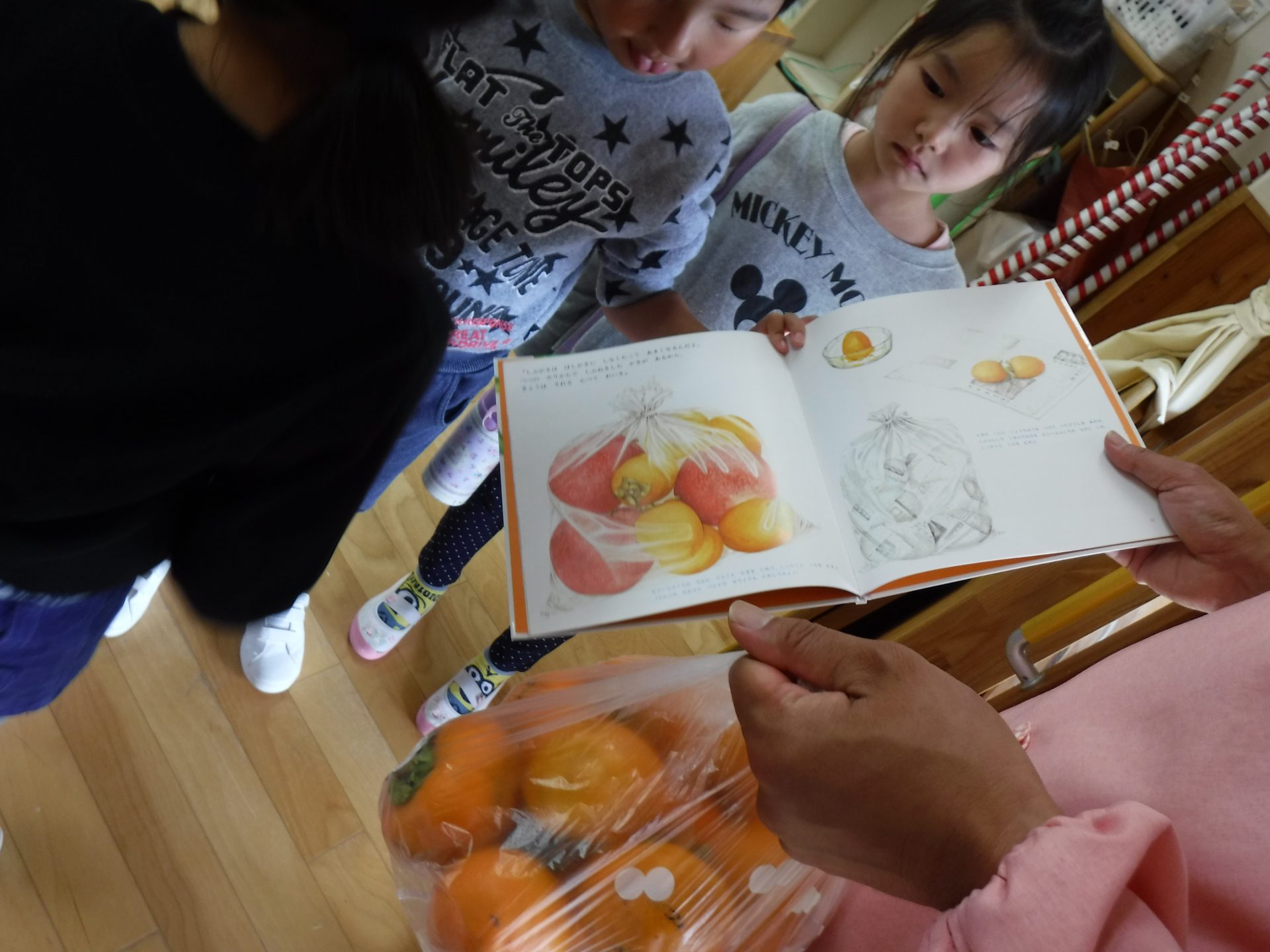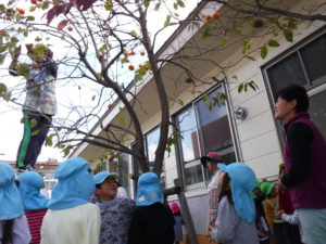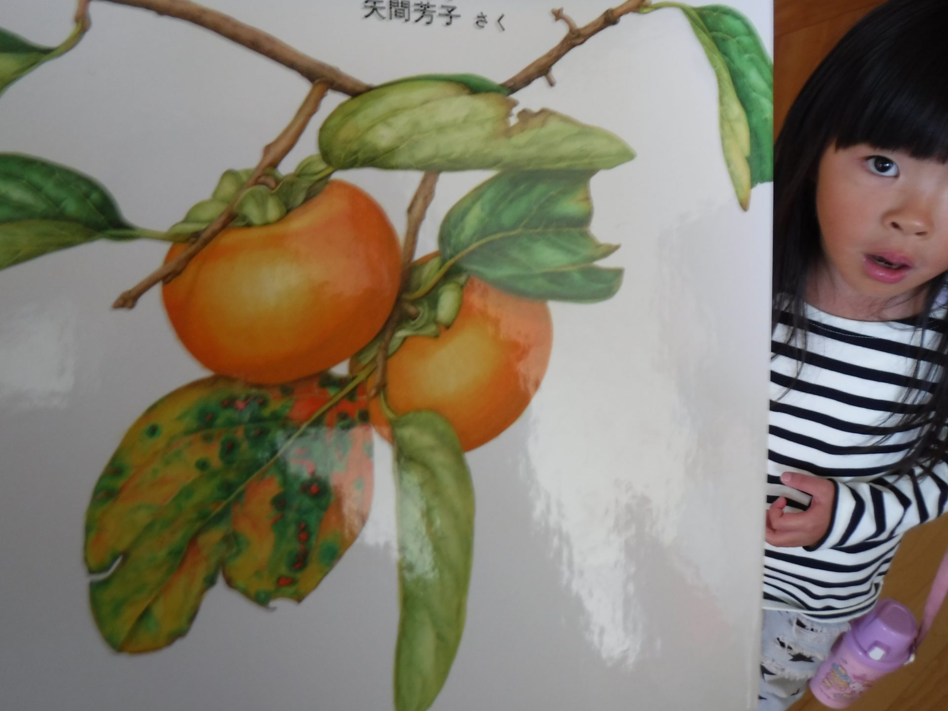 園の裏庭の柿が色づいてきました。絵本を見て「とってたべたい!」