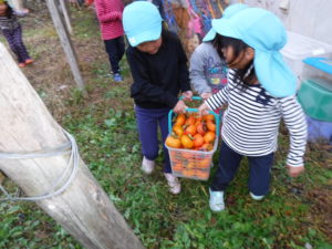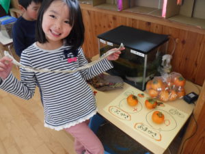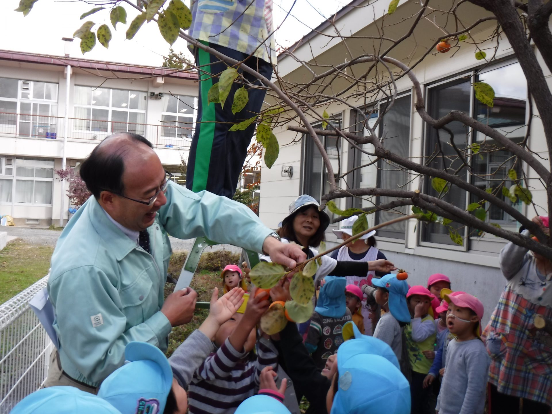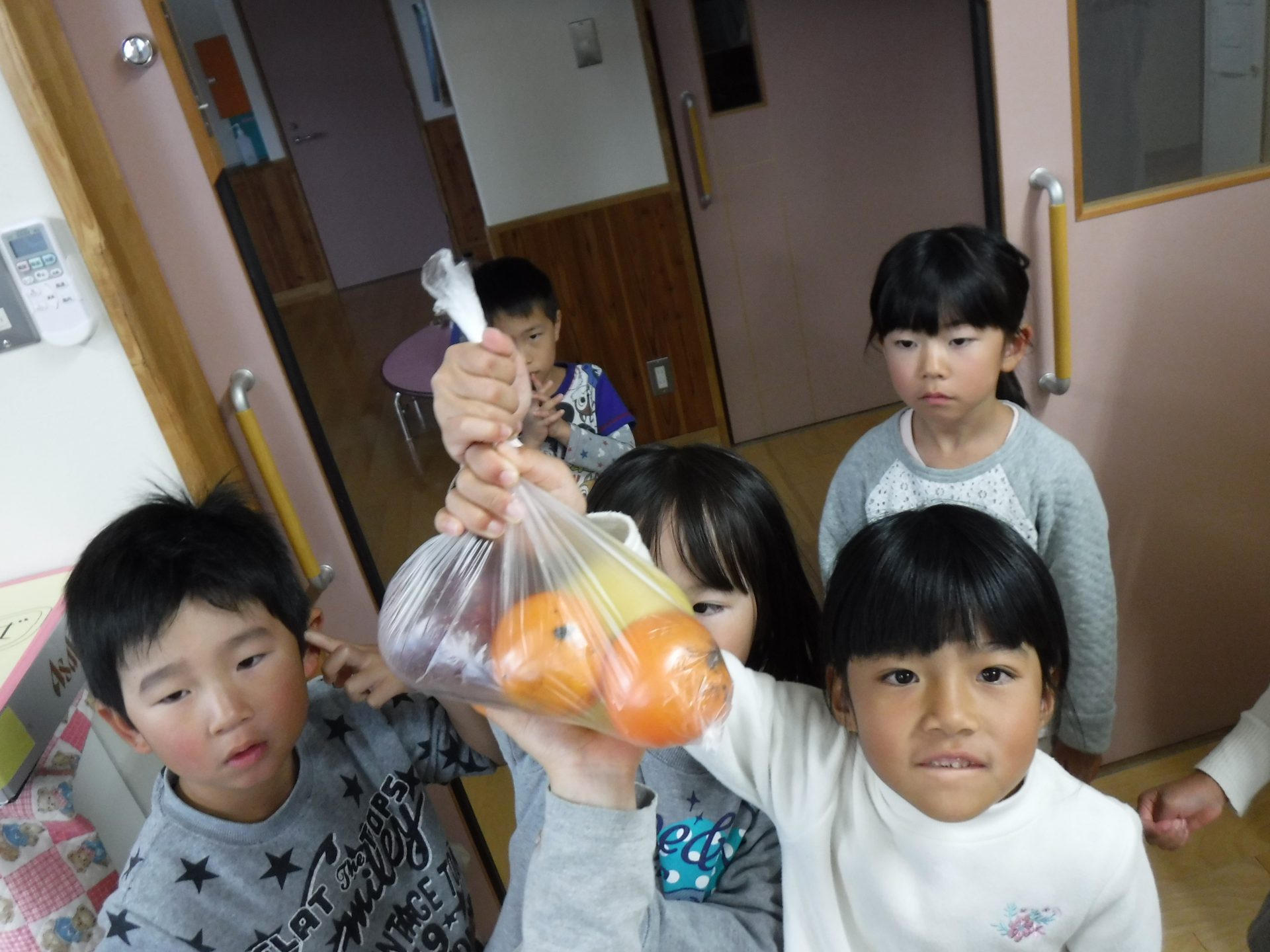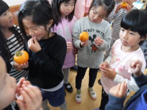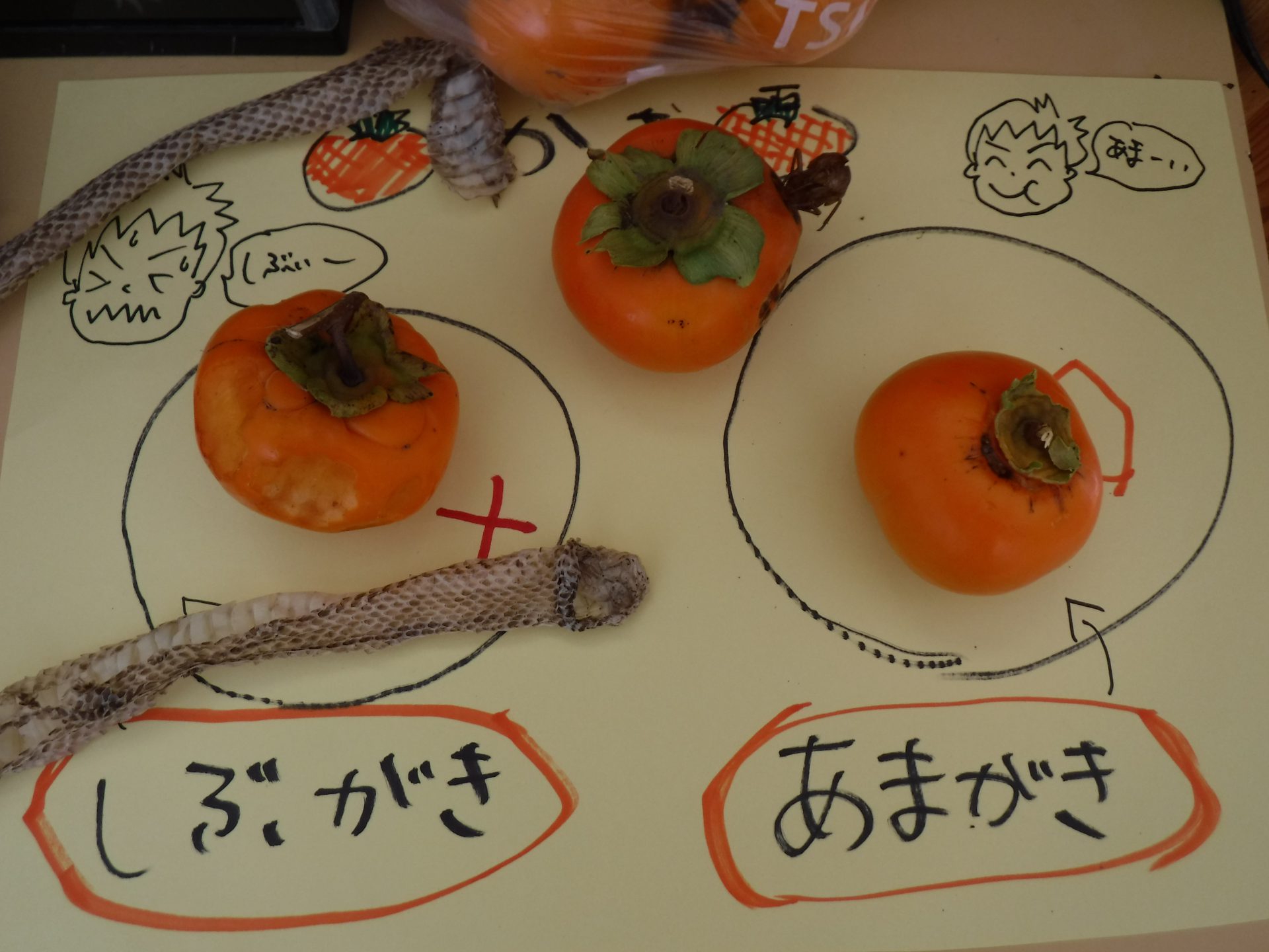 園の裏庭の柿が色づいてきました。絵本を見て「とってたべたい!」