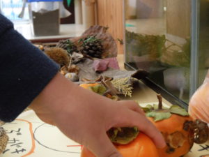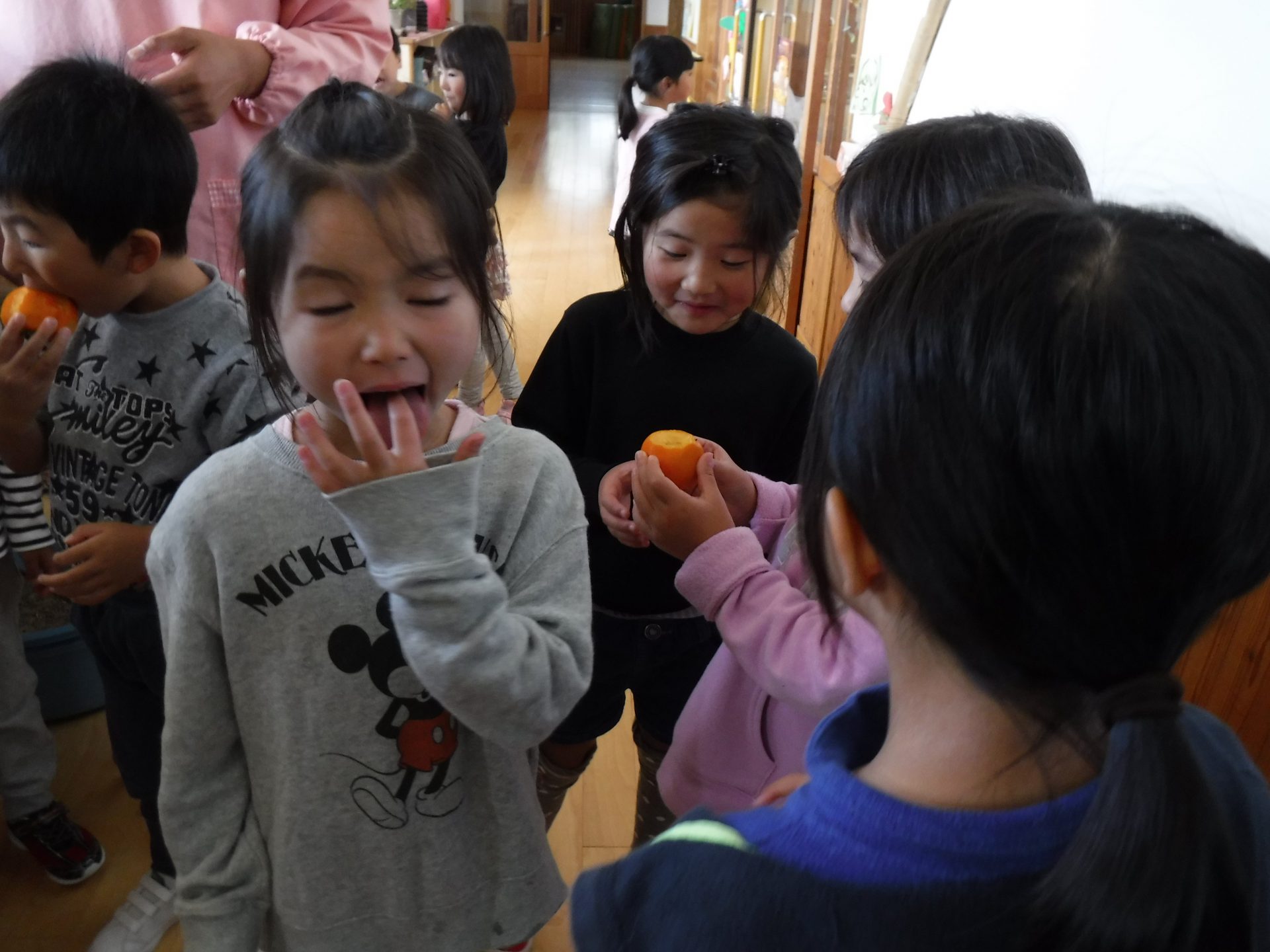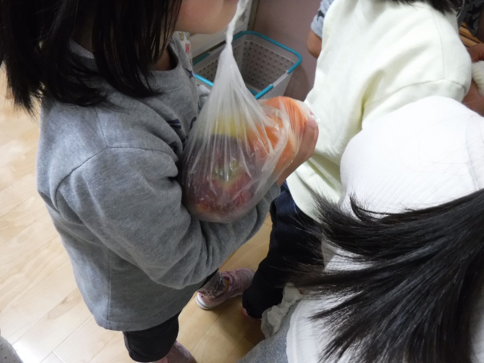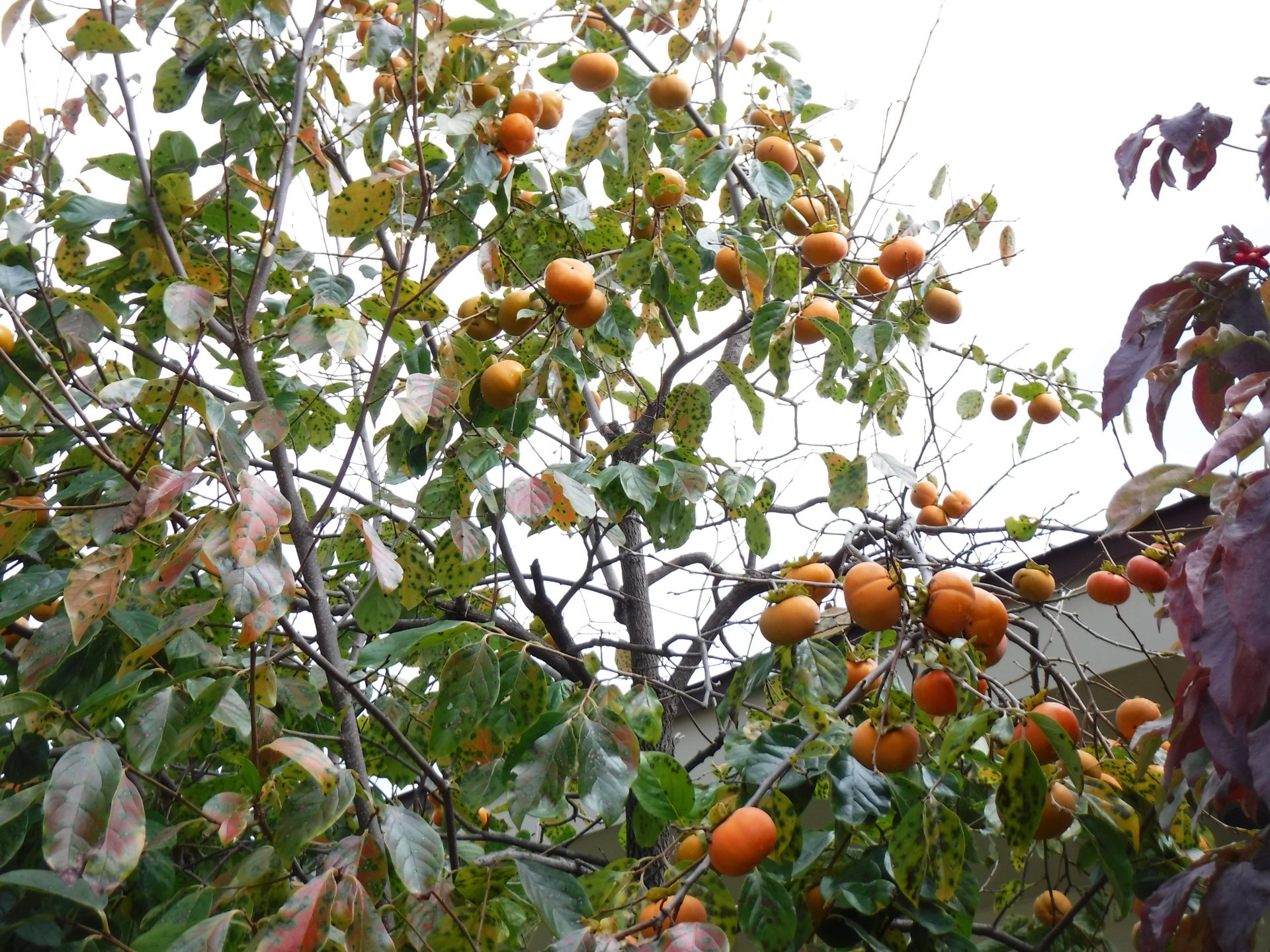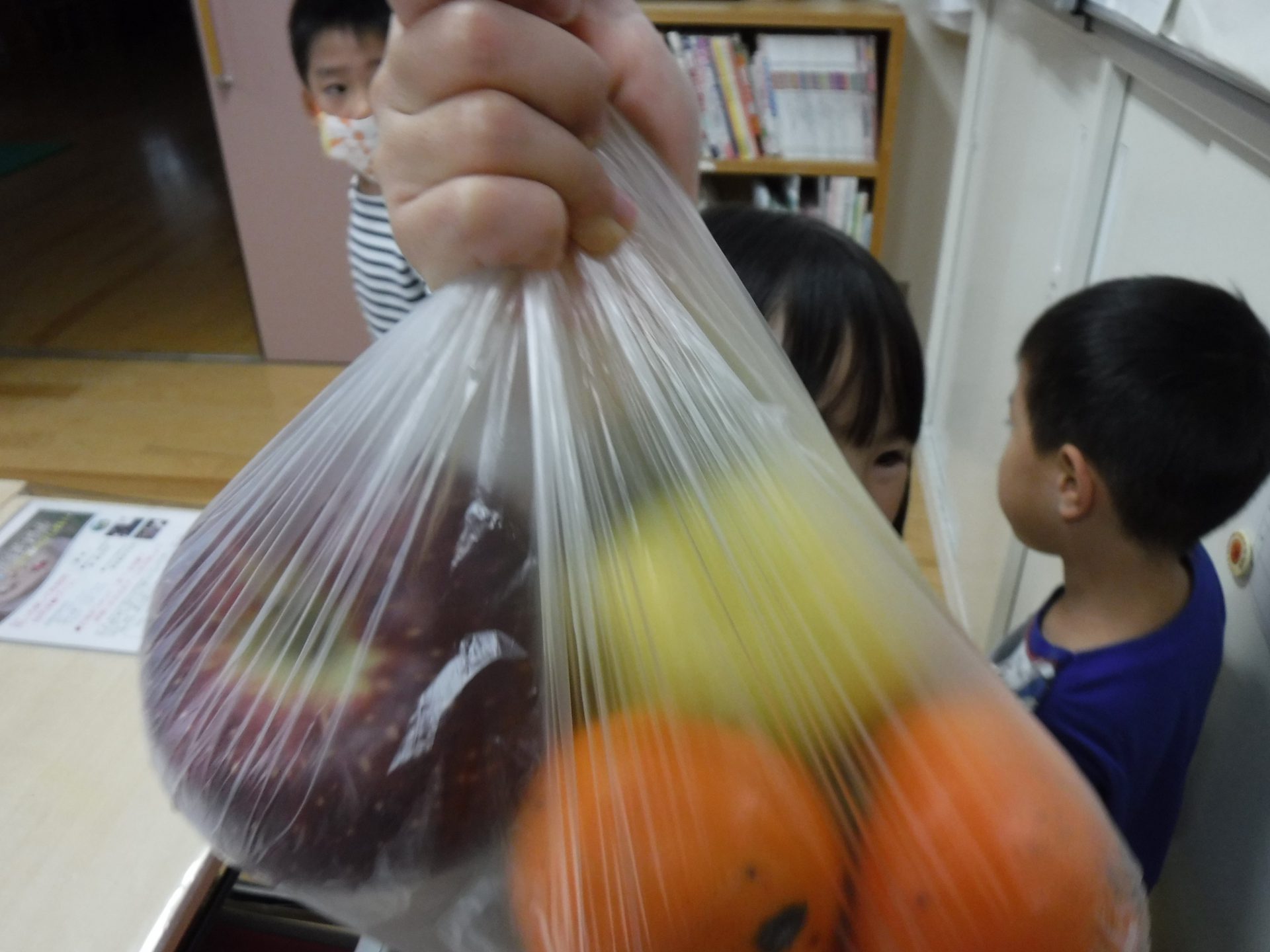 園の裏庭の柿が色づいてきました。絵本を見て「とってたべたい!」