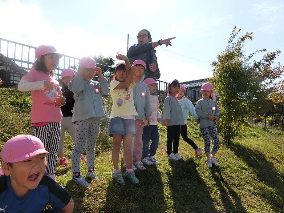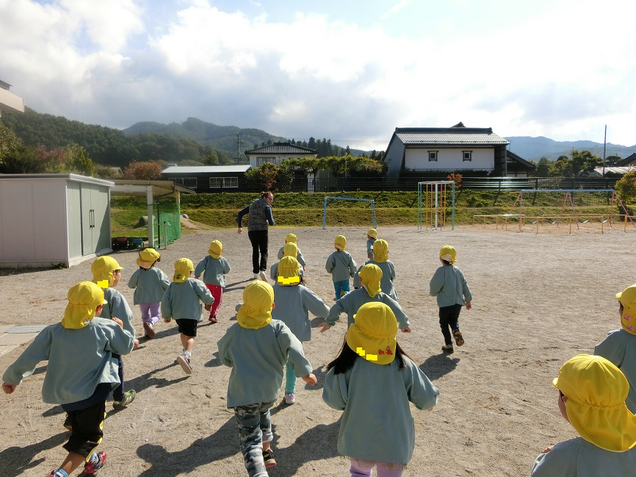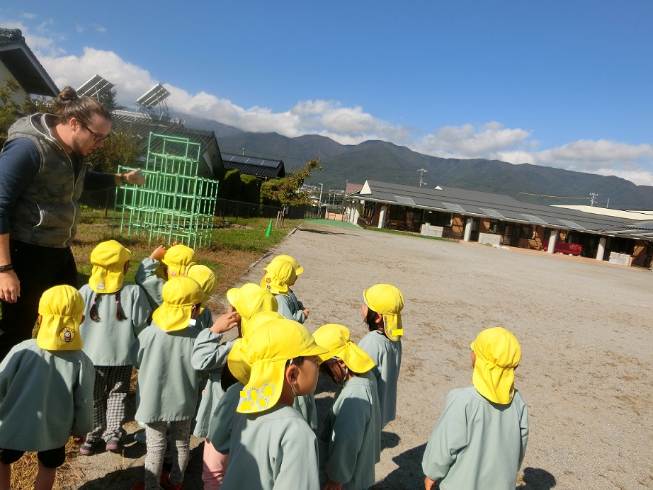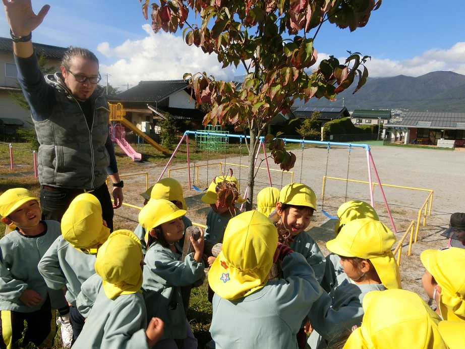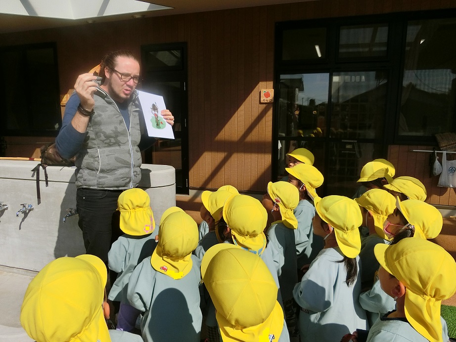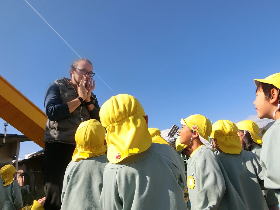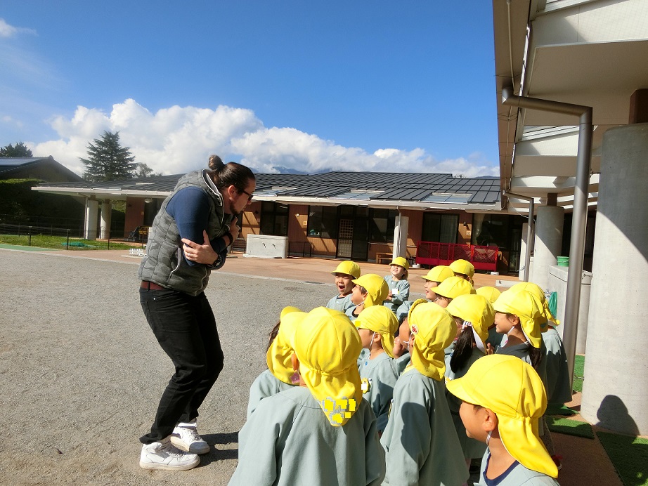 箕輪町では町内8園すべてで英語遊びを行っています。東みのわ保育園は「やまほいく」に認定されていることから英語遊びのヨード先生がやまほいくバージョンで英語遊びをしてくれました。気持ちのいい天気ですがちょっと寒い?