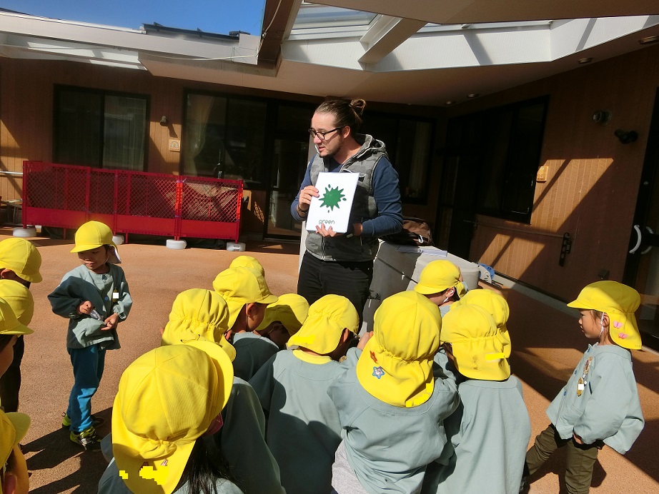 年中の後は年長が英語遊びです。年長も色探しから始まりました。
