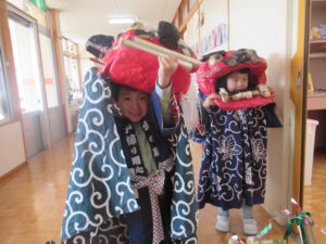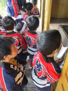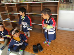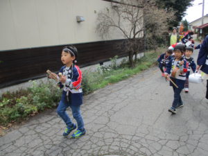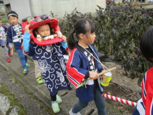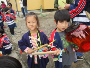 5歳児のお友だち、首から下げているのは『拍子木』です。