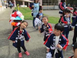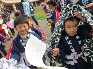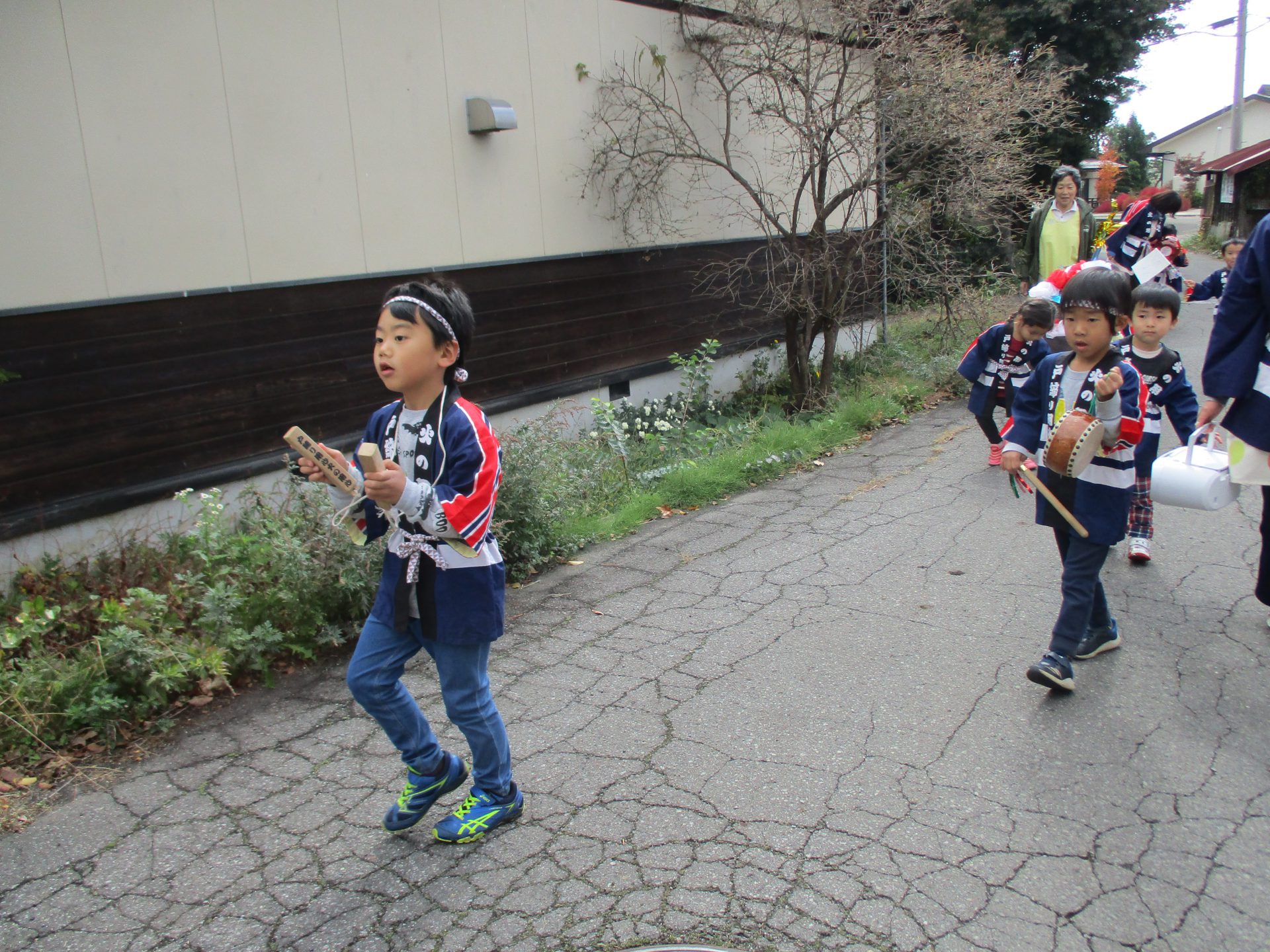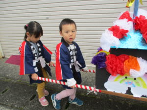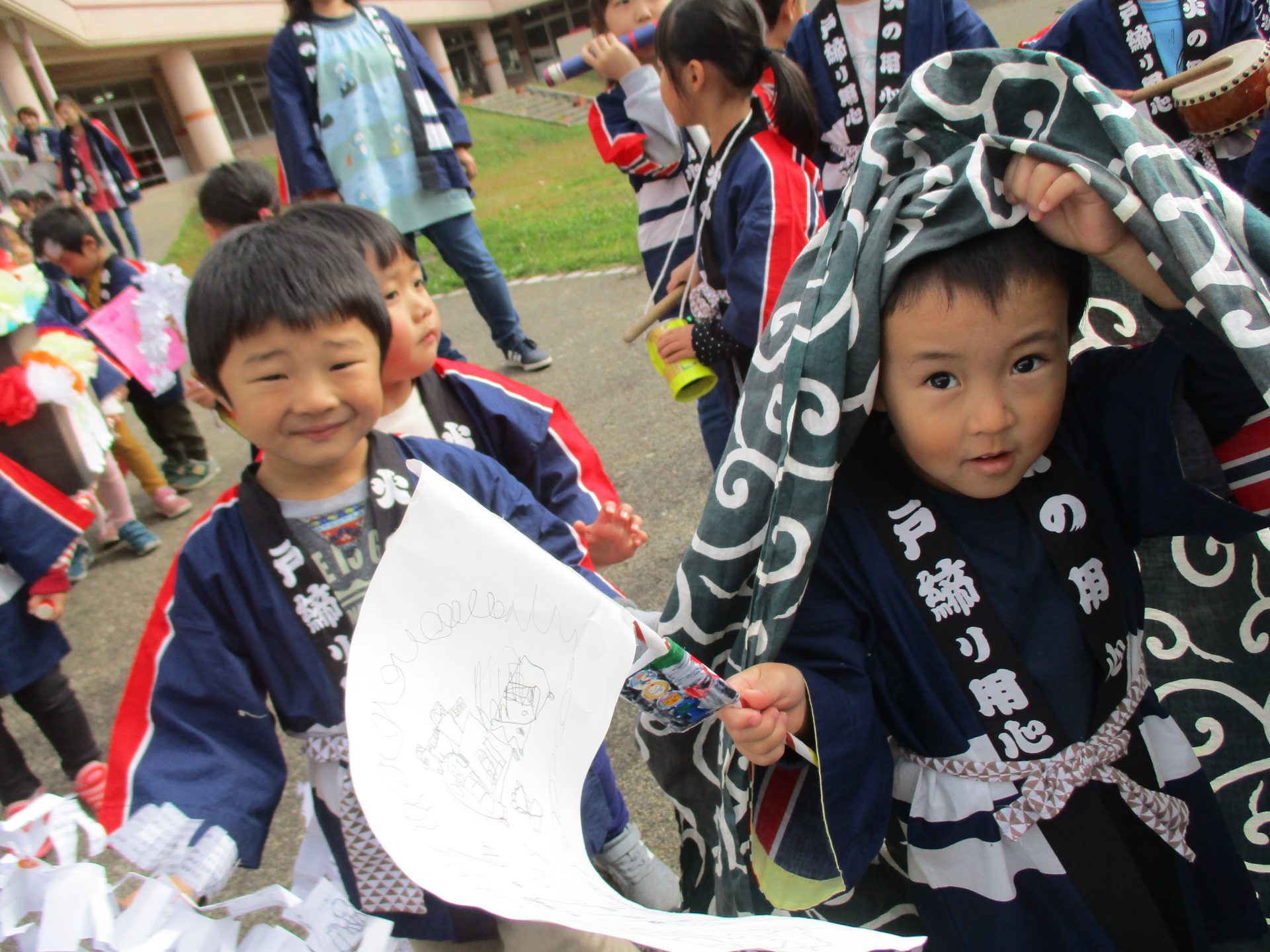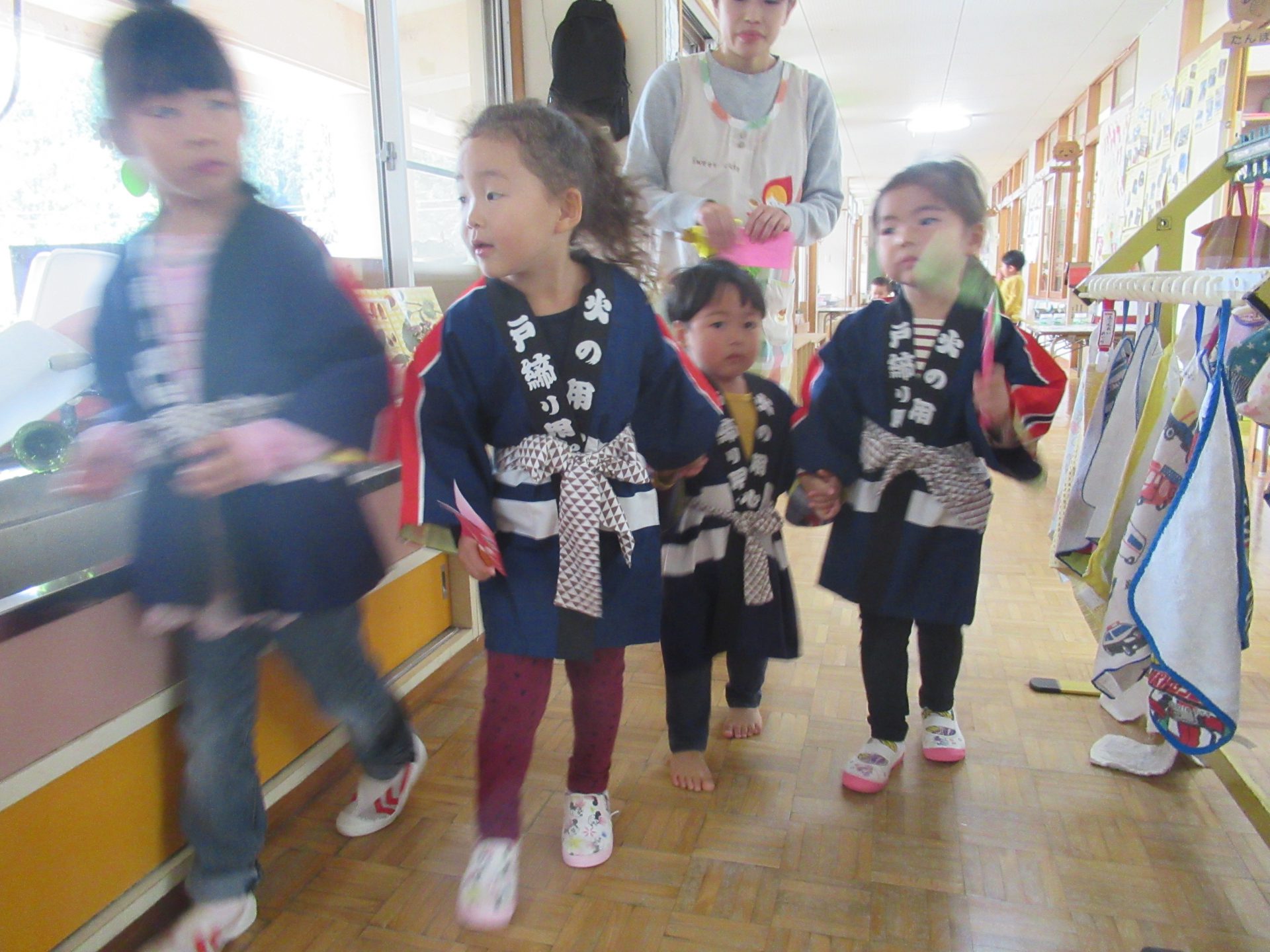 少しずつ広がり、今では園全体で楽しんでいるお祭りごっこ。年齢の枠を越え、年上のお友だちが年下のお友だちに作り方を教えてあげたり、一緒に手をつないで練り歩くときには歩幅を合わせてあげたりする等友だちとの関わりを深めながら 思いやり・優しいさ の気持ちが芽生えてきている姿。そこには、年下のお友だちから年上のお友だちへの 憧れの気持ちの芽生えを感じています。また、声をかけてくださった地域の方との交流も子どもたちにとって良い経験になったと思います。さらに、来週には5歳児さんが準備を進めている『お祭りごっこ』が行われる予定になっており、子どもたちとのお祭り遊びを楽しんでいきたいと思います。