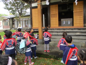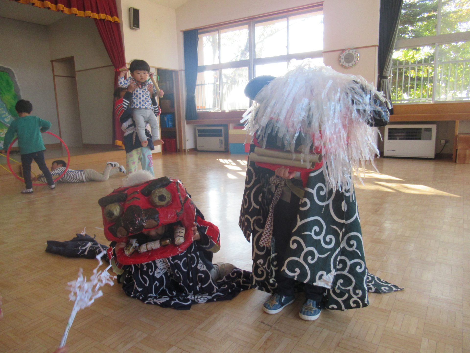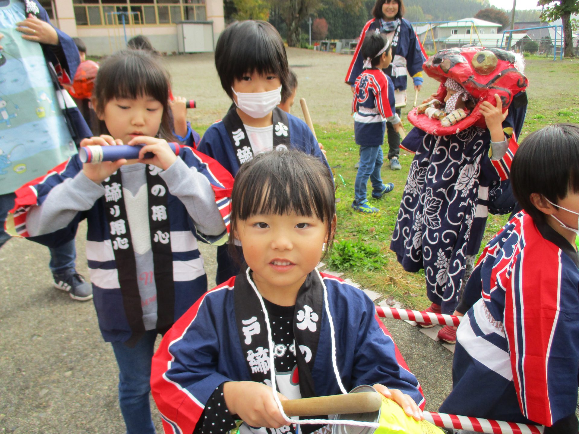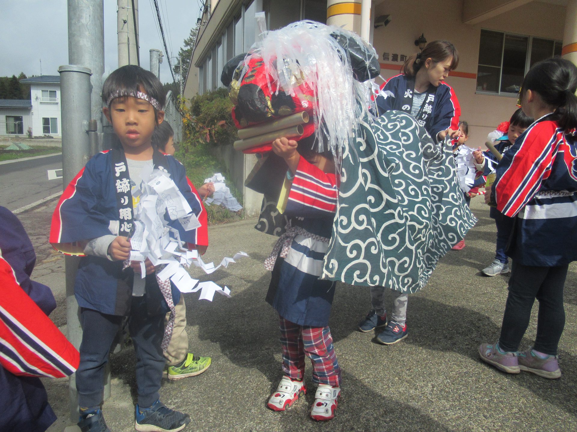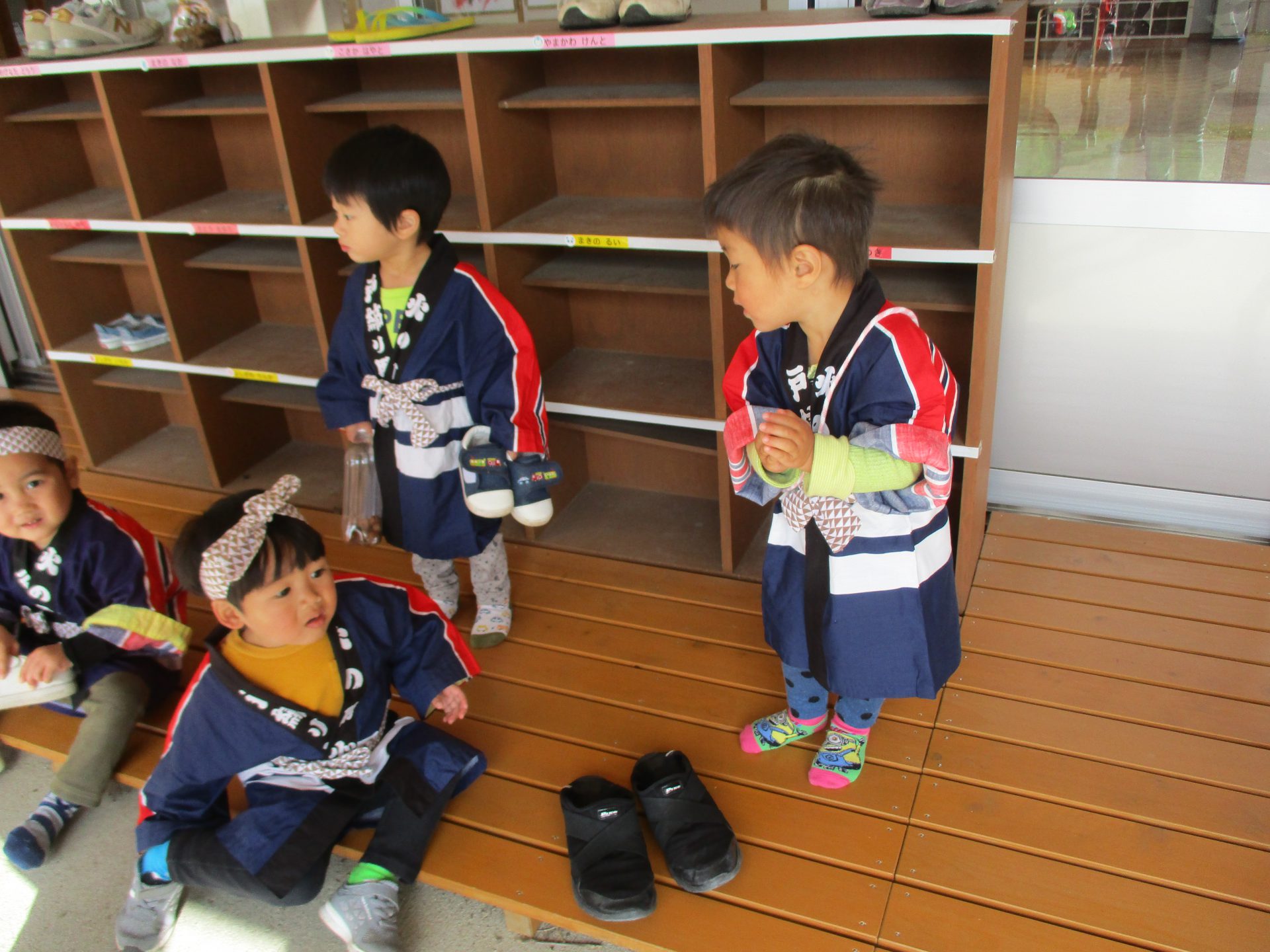 少しずつ広がり、今では園全体で楽しんでいるお祭りごっこ。年齢の枠を越え、年上のお友だちが年下のお友だちに作り方を教えてあげたり、一緒に手をつないで練り歩くときには歩幅を合わせてあげたりする等友だちとの関わりを深めながら 思いやり・優しいさ の気持ちが芽生えてきている姿。そこには、年下のお友だちから年上のお友だちへの 憧れの気持ちの芽生えを感じています。また、声をかけてくださった地域の方との交流も子どもたちにとって良い経験になったと思います。さらに、来週には5歳児さんが準備を進めている『お祭りごっこ』が行われる予定になっており、子どもたちとのお祭り遊びを楽しんでいきたいと思います。