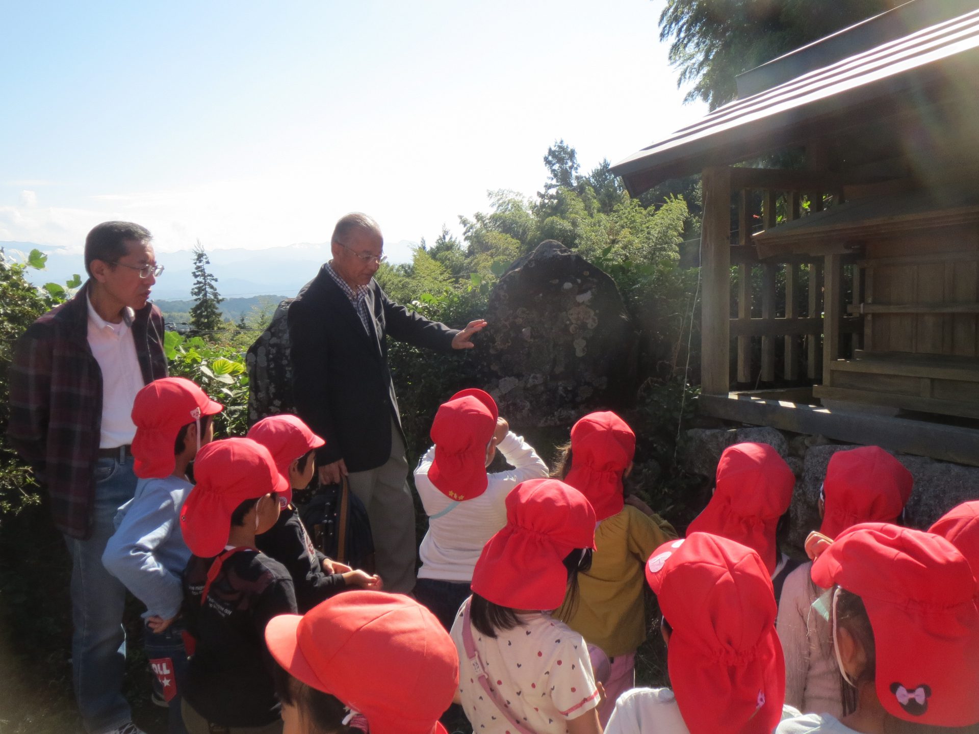 最初に行ったのは夜燈様(やとうさま)です。中平地区に住む126家の方が順番に、毎晩灯を灯し続けているそうです。200年も前から毎晩灯しているようで「すごいなー!」と言う子もいました。