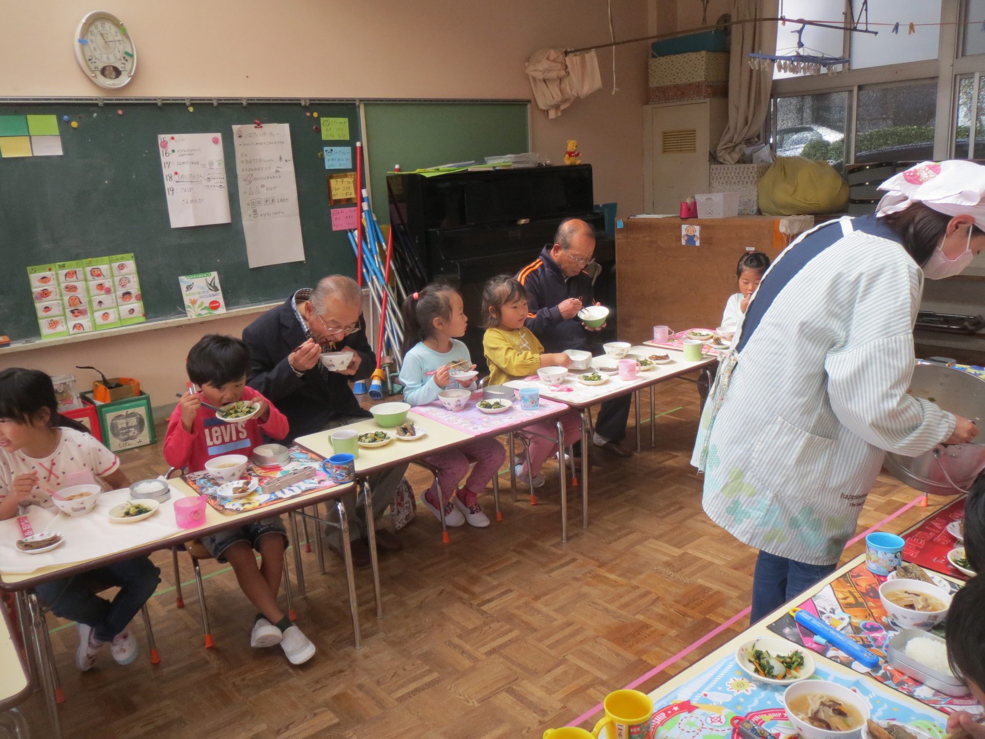 年長の部屋では会食をしました。探検隊の先生と一緒においしくいただきました。