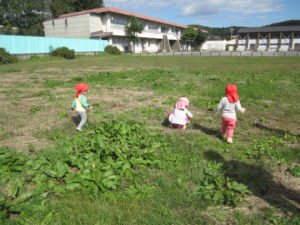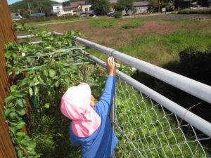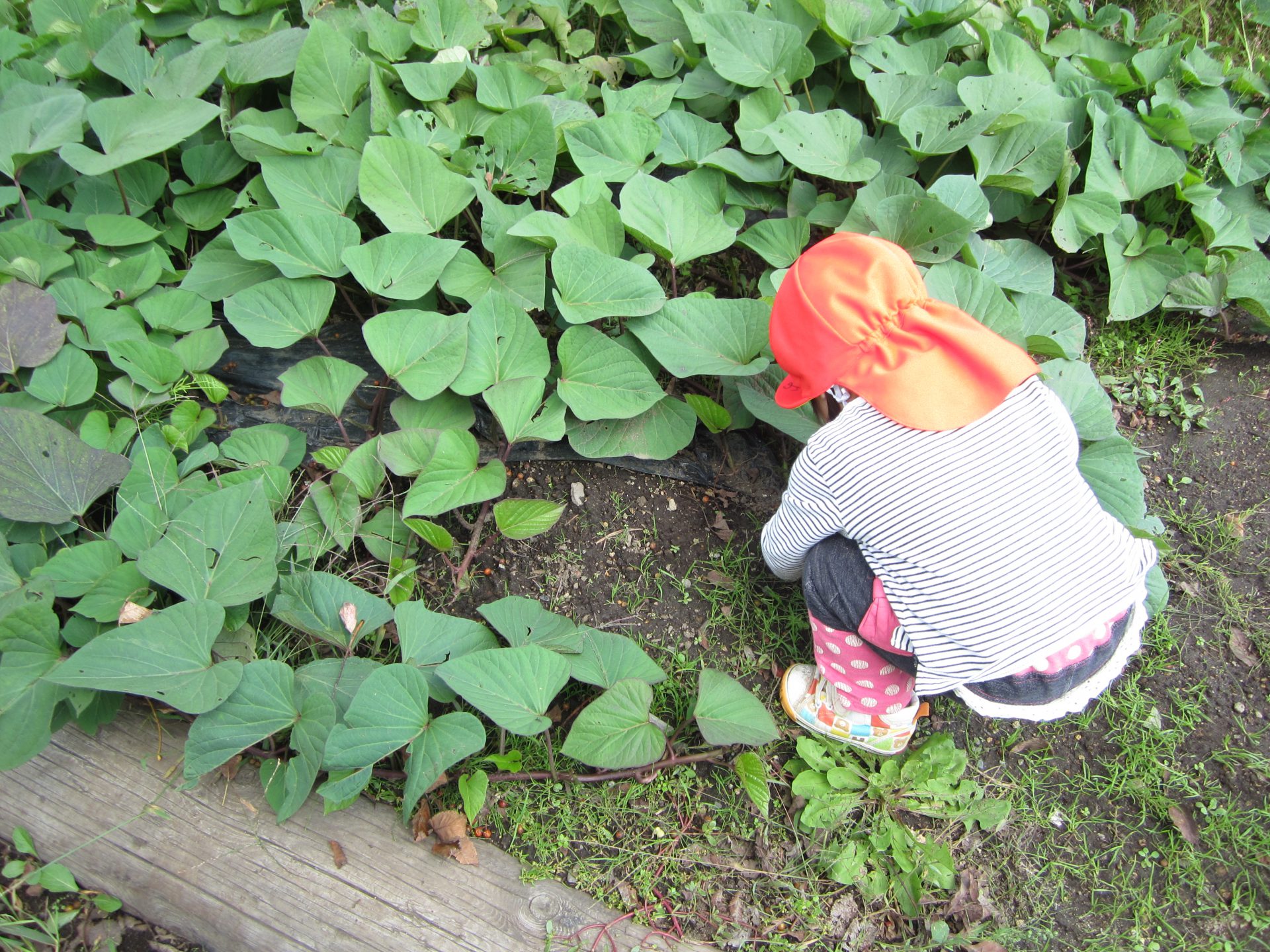 今度は3、4、5歳のお友だちが野菜を育てている畑の中にお邪魔して何か探す1歳児のこども。