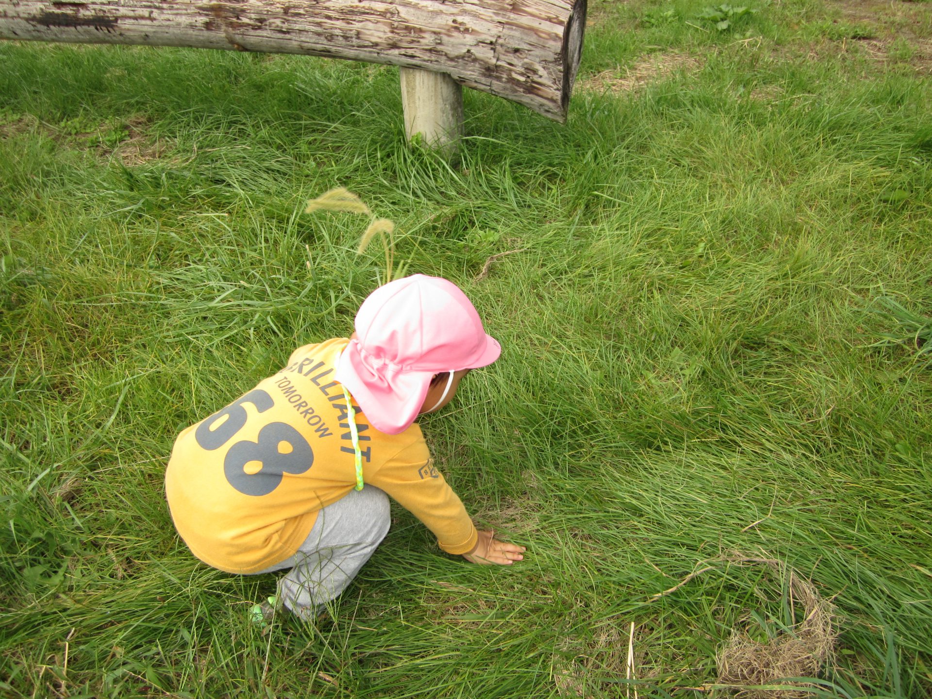 今回は草むらの中に何か動くものを見つけたようです。草に手をついて、捕まえるぞ!と意気込み、よく狙って上から下へ手をすばやく動かします。