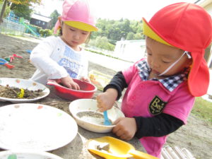 その様子を見ていた砂でお料理中のこどもたちも一緒になって探し始め、拾った木の実もお料理に入れ
