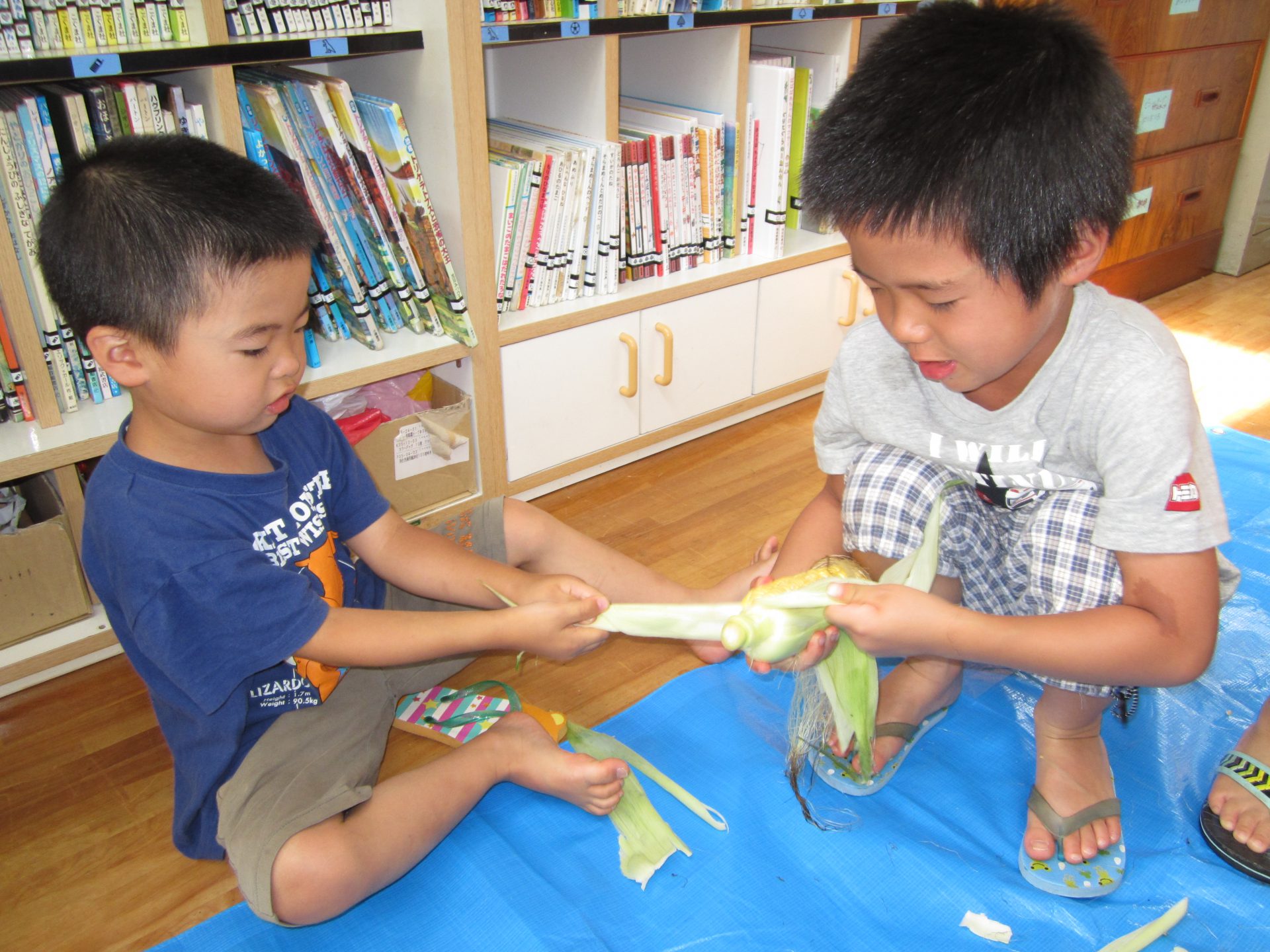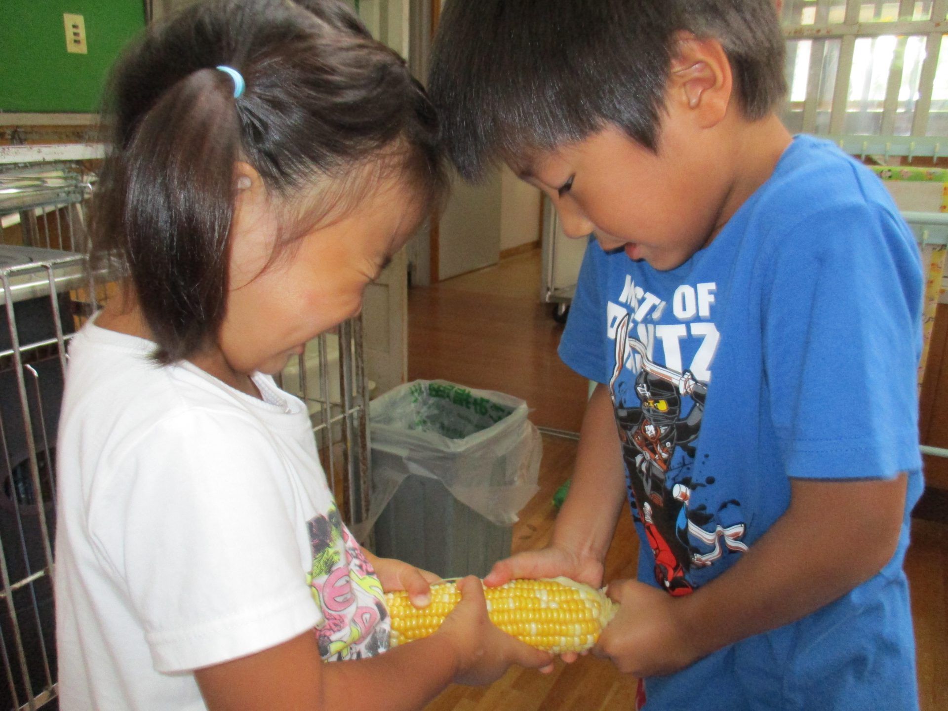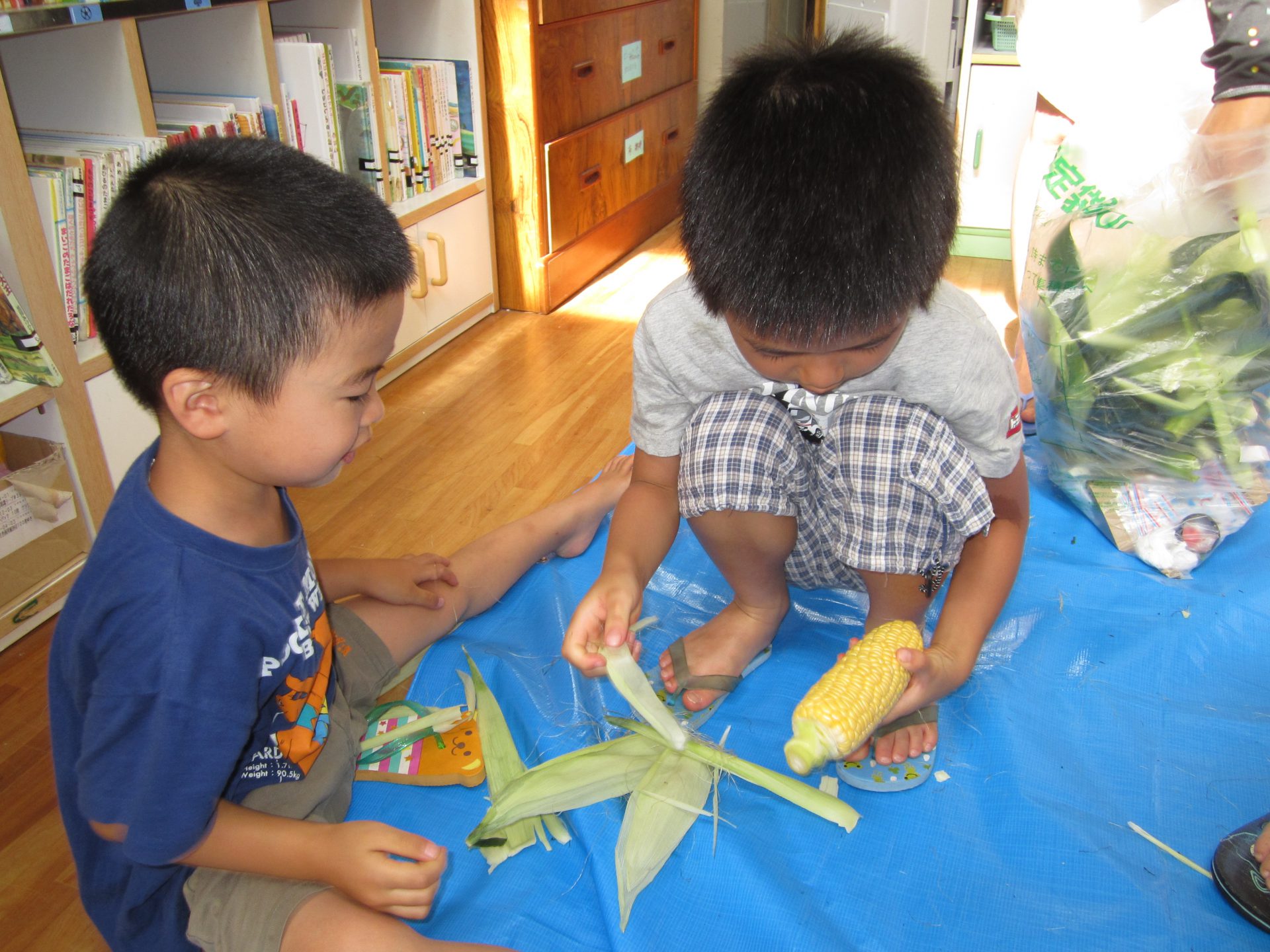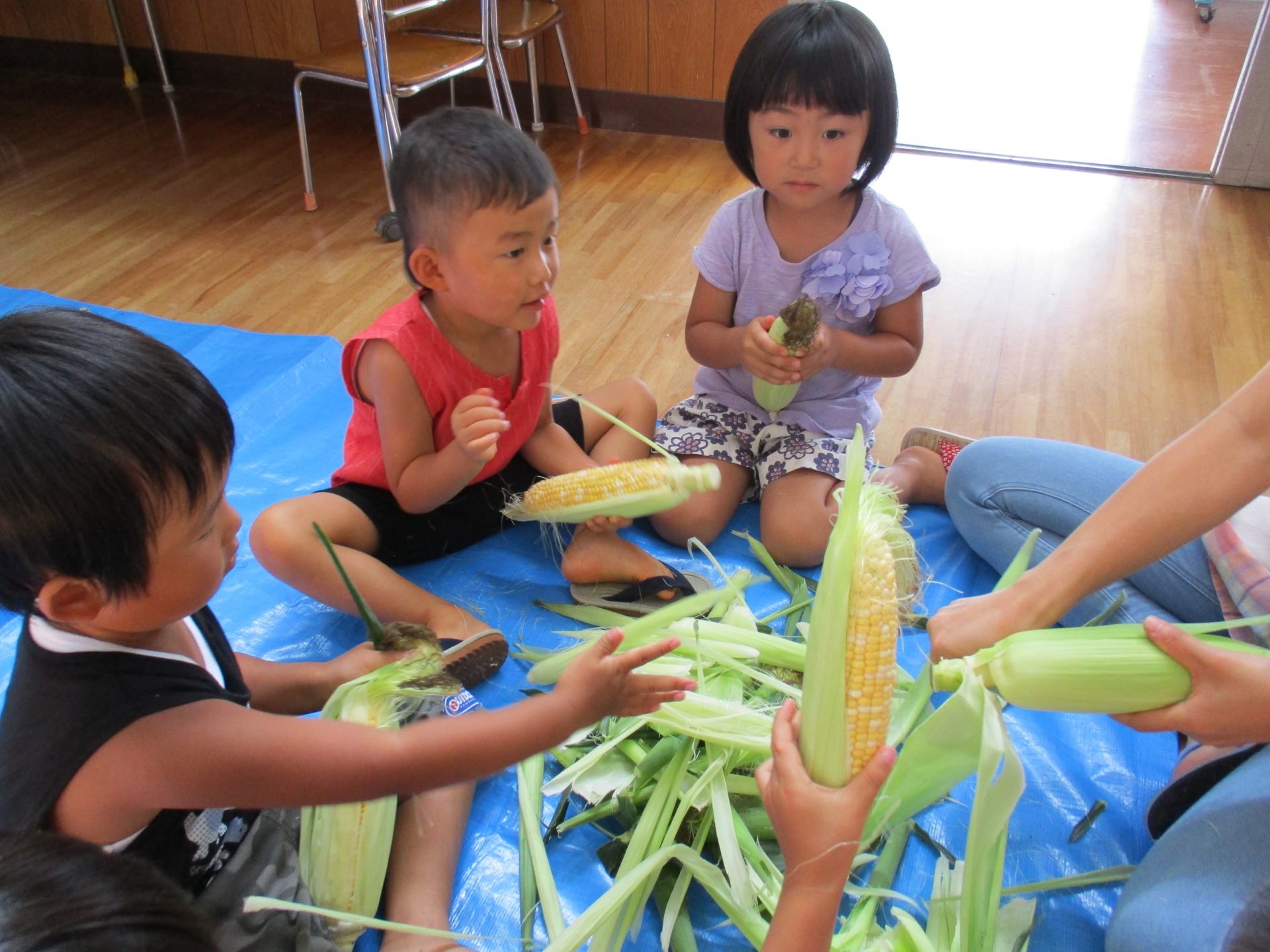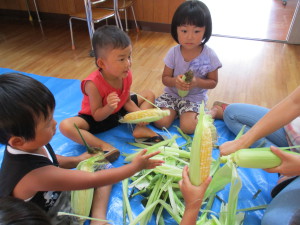 3歳児さんでも、お家でモロコシの皮むきをしたことがある子もいて、「やったことあるよ!」と得意気に教えてくれました。